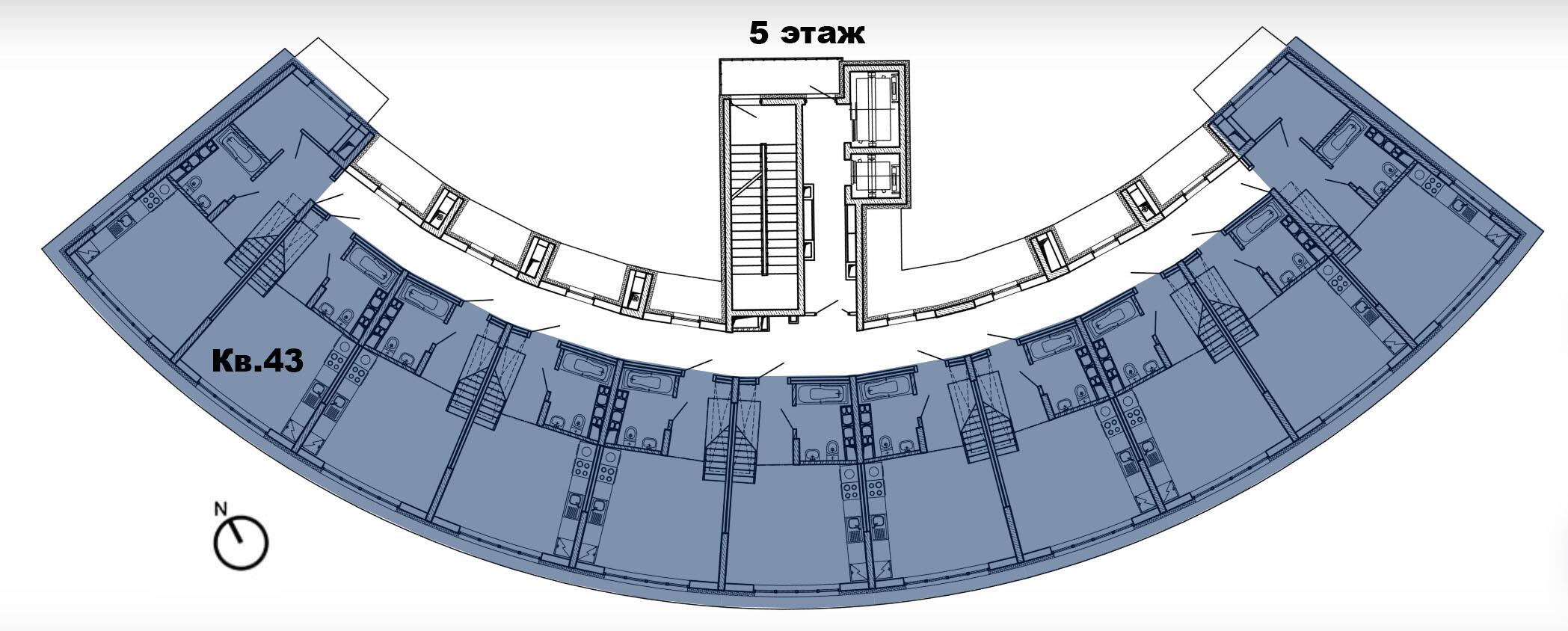 8 этажей. Всего 77 эксклюзивных квартир. Дугообразная архитектура, панорамное остекление 4,4 × 3 м. Фасад в бело-синих «природных» оттенках. Безбарьерные входы, предусмотрены пандусы.