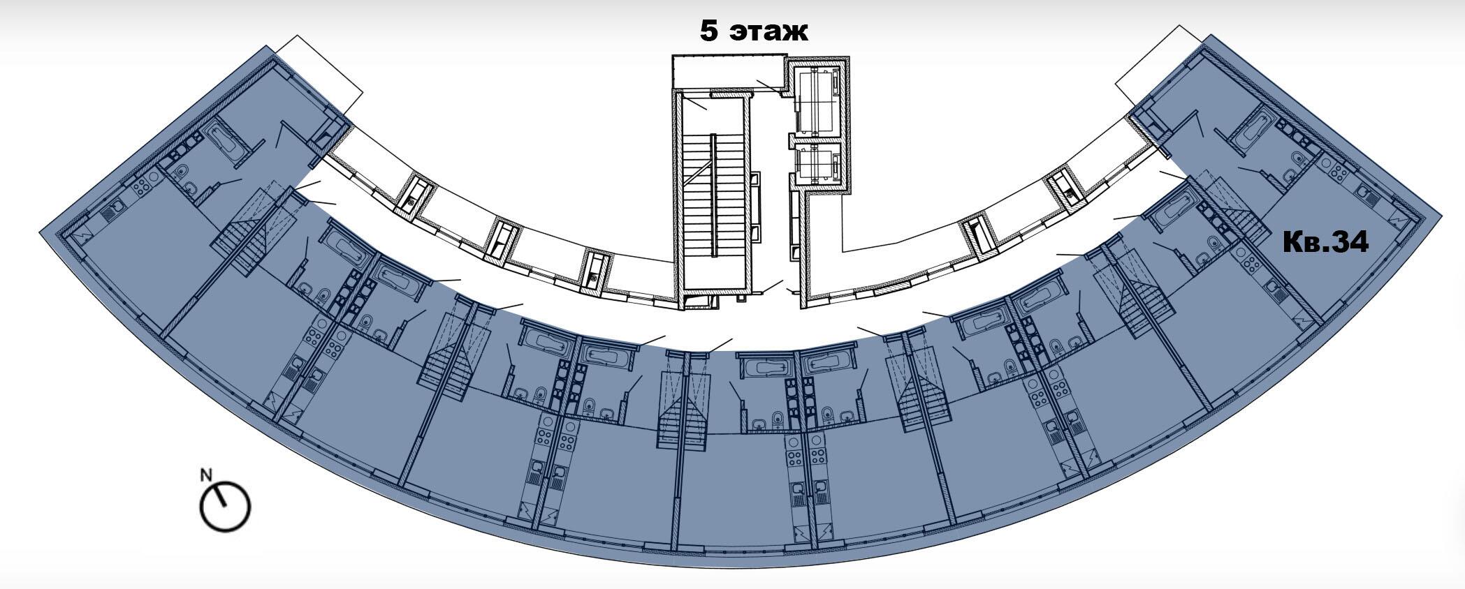 8 этажей. Всего 77 эксклюзивных квартир. Дугообразная архитектура, панорамное остекление 4,4 × 3 м. Фасад в бело-синих «природных» оттенках. Безбарьерные входы, предусмотрены пандусы.