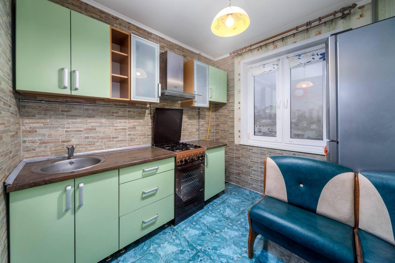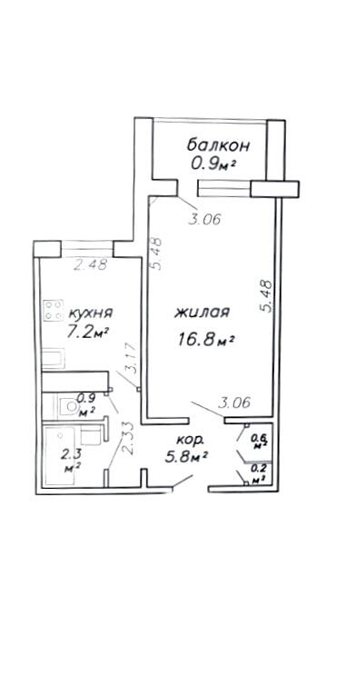 Квартира на 5-м этаже 9-этажного дома 1989 г.п. Общая площадь по СНБ - 34,8 кв.м., жилая 16.8 кв.м., кухня 7.2 кв.м.