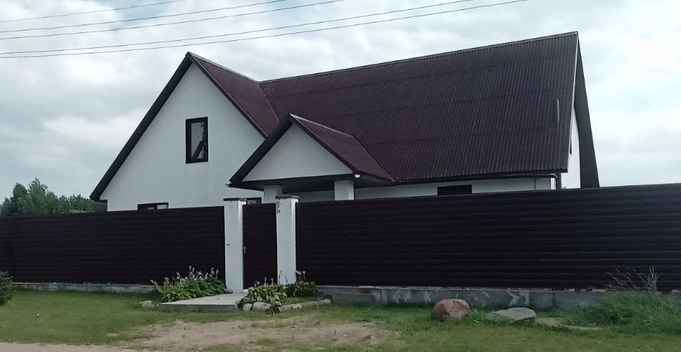 Продается живописная усадьба (частная собственность ) с просторным домом для постоянного проживания в Минской области, Республика Беларусь, в Стародорожском районе, всего в 122 км от МКАД г. Минска. Дом сдан в 2016году, хозяйственно - банный комплекс в 2023 году .Общая площадь участка: 72 сотки, из них 30 соток — пахотных земель. На участке находится пруд размером 17×25 м. Въезд на территорию через удобные откатные ворота шириной 4,5 м. Участок полностью огорожен: фасадное ограждение — металлопрофиль высотой 2,3 м, остальная часть огорожена сеткой рабицей. Жилой дом с мансардой: первая этажная общая площадь 107,6 м², включающая котельную (8,4 м²), просторный санузел (9 м²), кухню-столовую (21,2 м²) с выходом на террасу 4×7 м, гостиную (28 м²), две спальни (16 и 12 м²), водяной теплый пол.