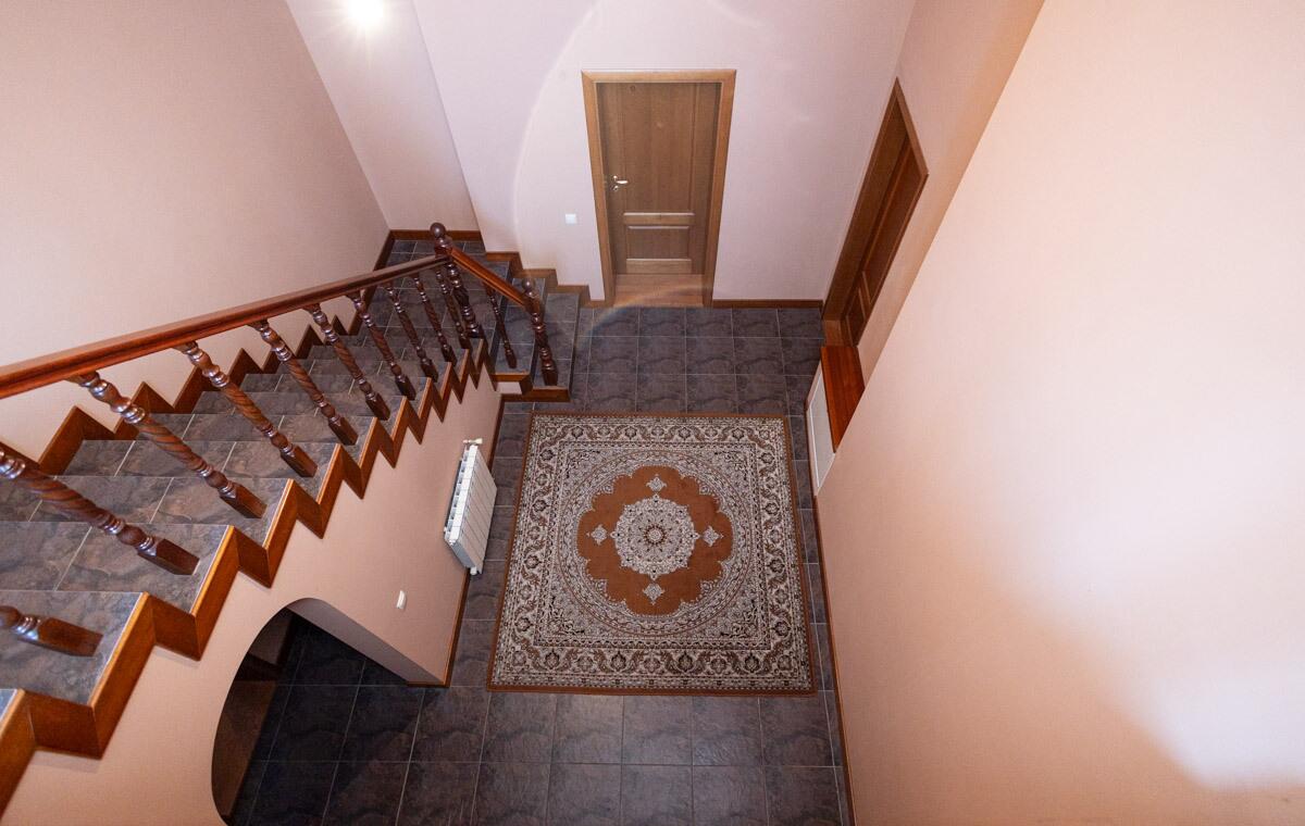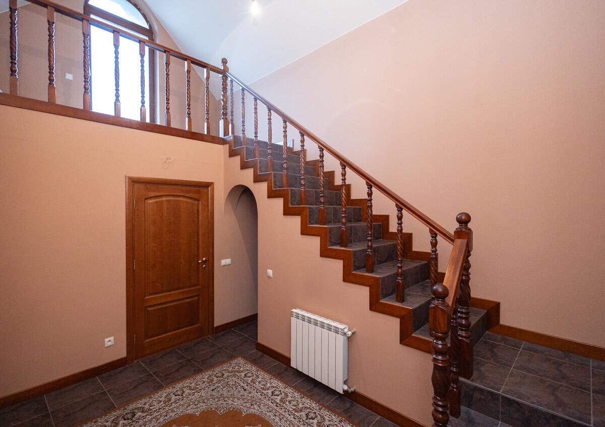 · Первый этаж с небольшим тамбуром сразу из прихожей открывает взгляду анфиладу арочных дверных проемов. В прихожей находятся два стационарных гардероба, просторный холл, кухня, столовая, гостиная с эксклюзивным камином из рваного гранита, эксклюзивный вентилируемый зимний сад.