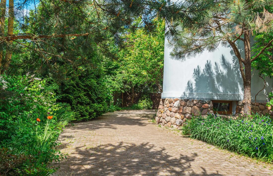 В саду три зоны отдыха – крытая в портале флигеля, открытая под раскидистым деревом грецкого ореха у барбекю и на лужайке с базальтовым диваном (летом можно греться, как на печи, и зимой теплый, если солнце и убрать ночной снег) со стационарным кострищем для вечерних посиделок с друзьями.