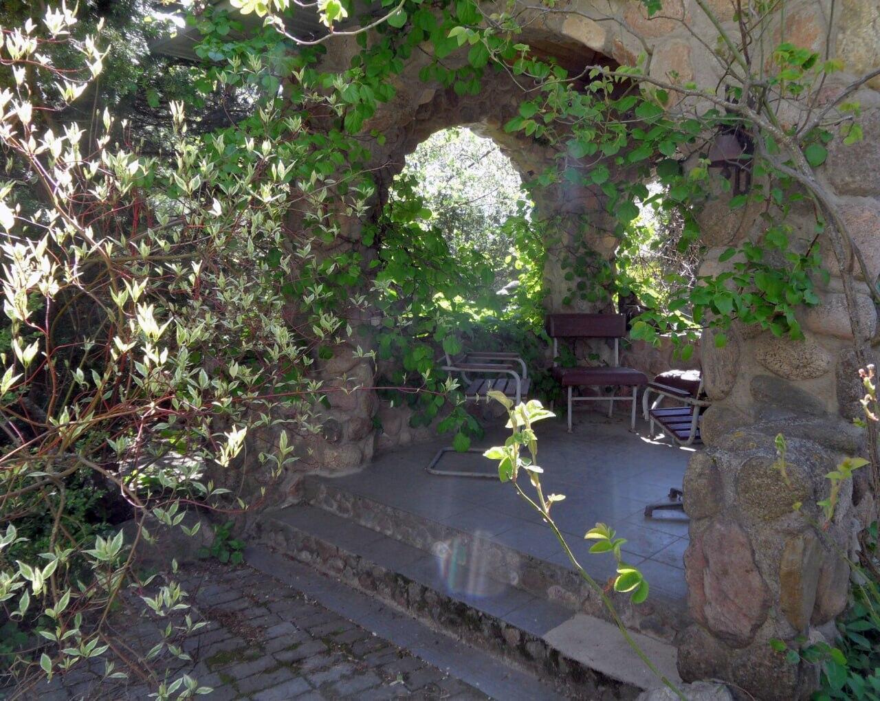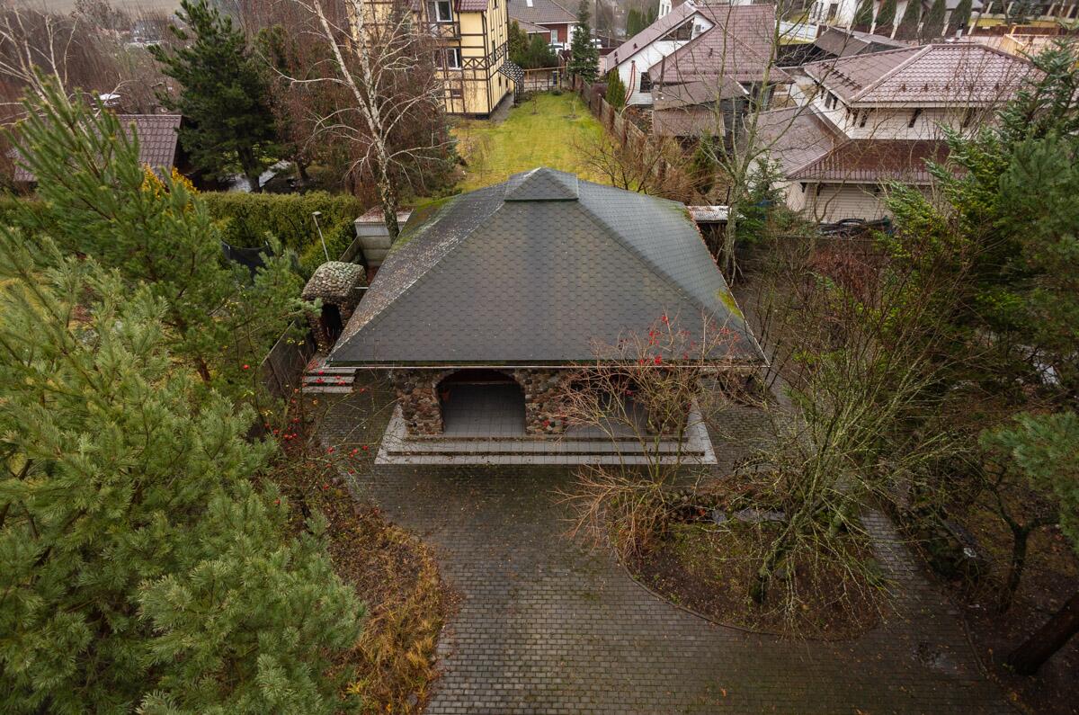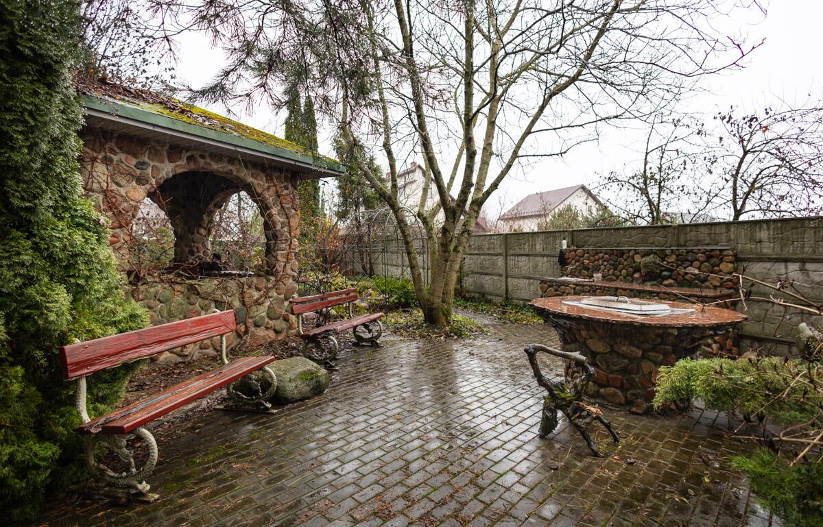 Все постройки выполнены в замковом стиле с использование традиционного для этого стиля материала – цельного бута. Бутовый фундамент дома с чёрным входом в дом, напоминающим сказочную пещеру, бутовый водоем со ступенями и перилами из нержавеющей стали глубиной 3м и с вытекающим из него ручьем в каменном русле с бутовым мостиком и базальтовой кладкой, бутовые стены беседки, портала флигеля и даже… дворового туалета с компостной ямой. Это надо видеть!