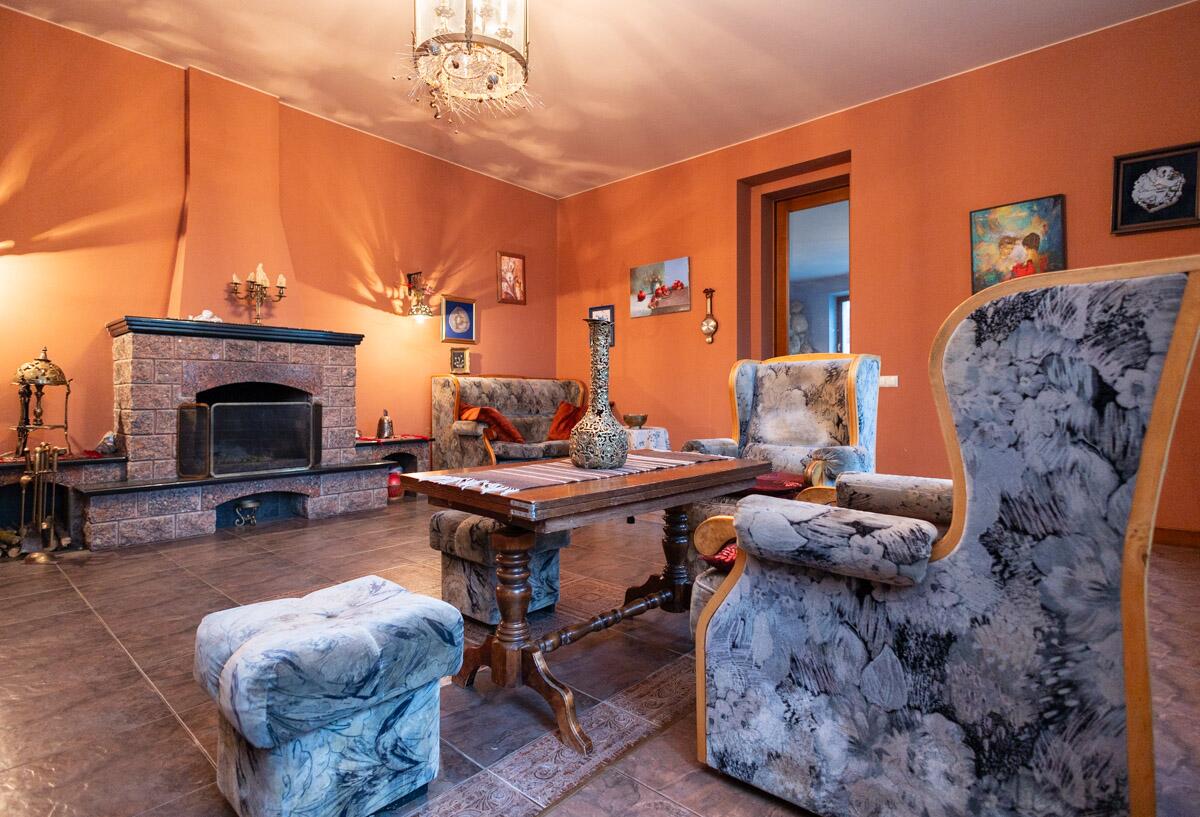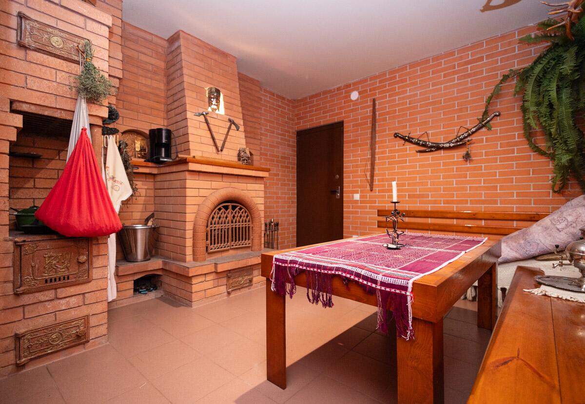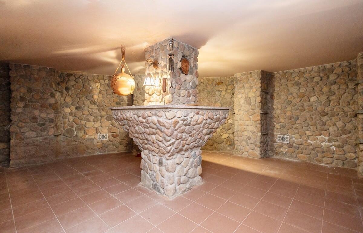 Цокольный этаж: котельная, длинный широкий коридор, ванная, туалетная комната, сауна со специальными кремниевыми камнями, комнату отдыха с камином, плитой для приготовления пищи, в которой предусмотрена коптильня, вентилируемый бутовый винный погреб, гараж на две.