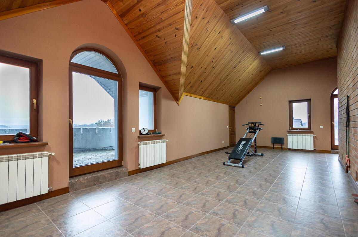 · На мансарде с лестничной площадки вход в просторный холл для общения с лестницей, ведущей на площадку с выходом на башню, 2 спальни, тренажёрный зал с двумя балконами, один из которых с видом на лес, луга,