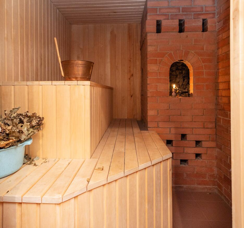 В отделке использовались: стекло, дерево (ольха, сосна, липа), рваный и резаный гранит, брекчия, шамотный, отделочный и обыкновенный кирпич, полированный базальт, чугун, 4-хкамерные деревянные (клееный брус) стеклопакеты. Французская сантехника (керамика эмалированный чугун), немецкие никелированные смесители с аэраторами, полы, покрытые ковровой керамогранитной плиткой.