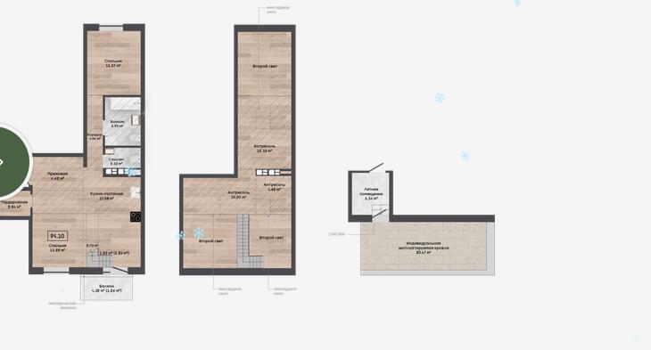 Продуманные планировки: Уникальные квартиры с личными террасами и участками на первом этаже, а также квартиры с мастер-спальнями, гардеробными и кабинетом. Кроме того, для каждой квартиры предусмотрена кладовая в техническом подполье, а для некоторых — кладовые на этажах.
