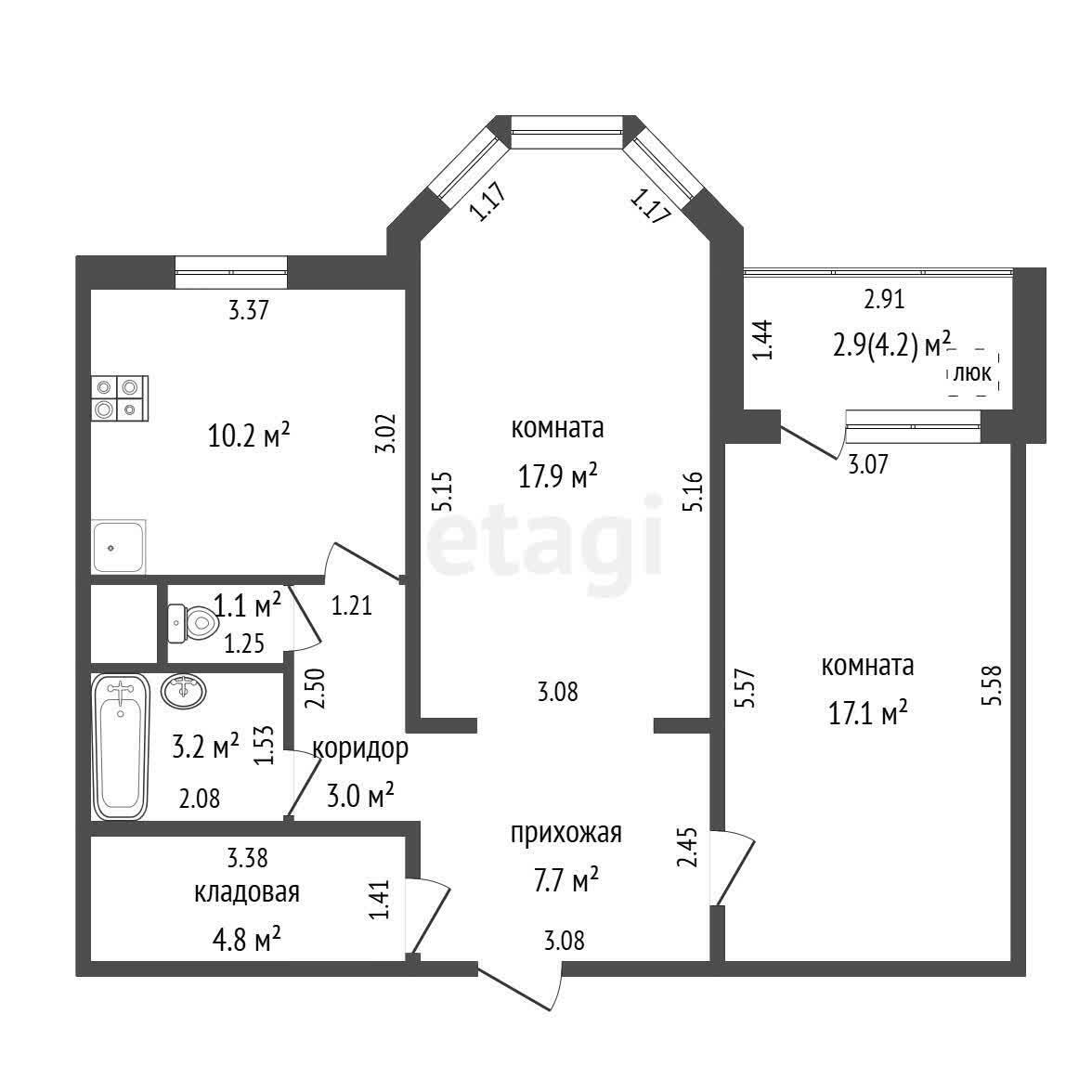 Выполнена строительная отделка: на стенах обои, на полах плитка и линолеум, разведена электрика, установлено необходимое сантехническое оборудование.Отличная и просторная планировка:- 2 изолированные жилые комнаты (17.1 и 17.9 м2);- большая кухня (10.2 м2);- в качестве бонуса есть просторное кладовое помещение, которое можно превратить в гардеробную/постирочную;- раздельный санузел;- застекленная лоджия;Посёлок Мачулищи имеет хорошо развитую инфраструктуру: магазины, школа, детские сады, мед. учреждения, отделения почты и банков, ПВЗ маркетплейсов и иные объекты торговли и сферы услуг.