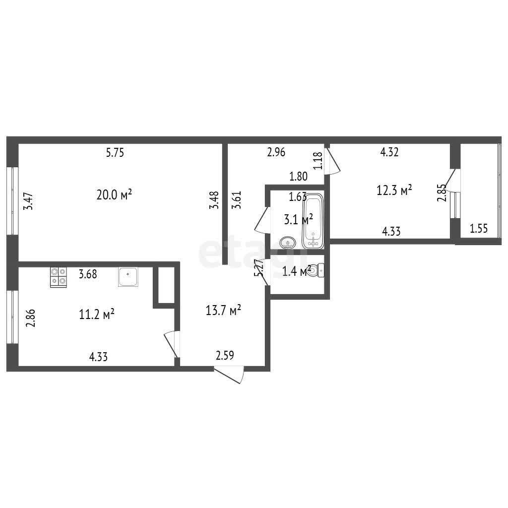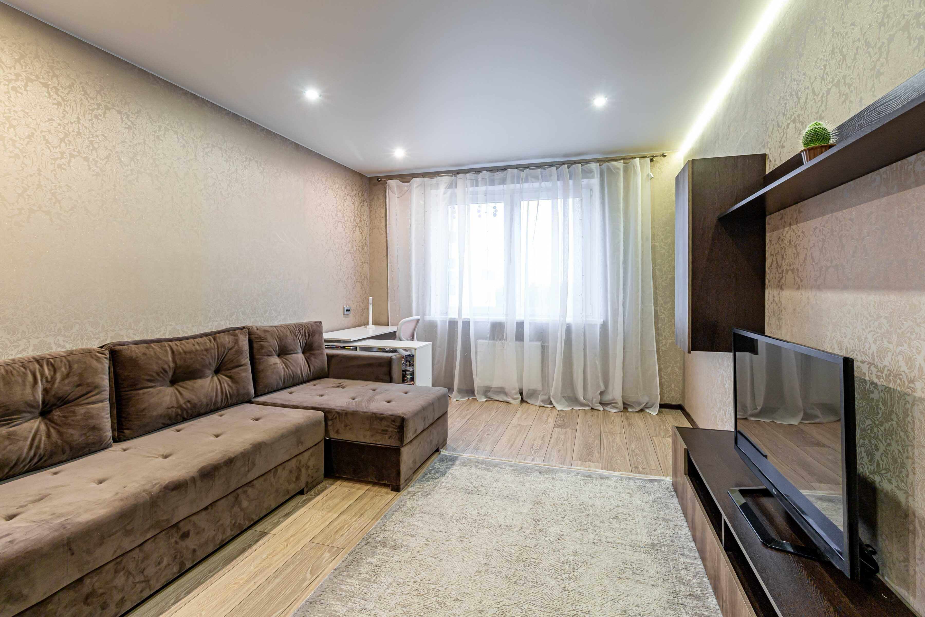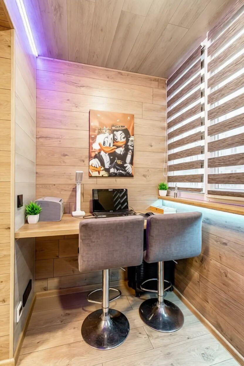 - Две изолированные комнаты — 20 м2 и 12,3 м2 (из комнаты меньшей площадью— выход на утеплённую лоджию с тёплым полом, оборудованную под рабочий кабинет)