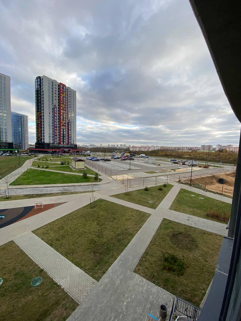 На кухне модульные шкафы, вытяжка. Вся техника остается будущему собственнику квартиры. На полу в рабочей зоне плитка, далее ламинат.