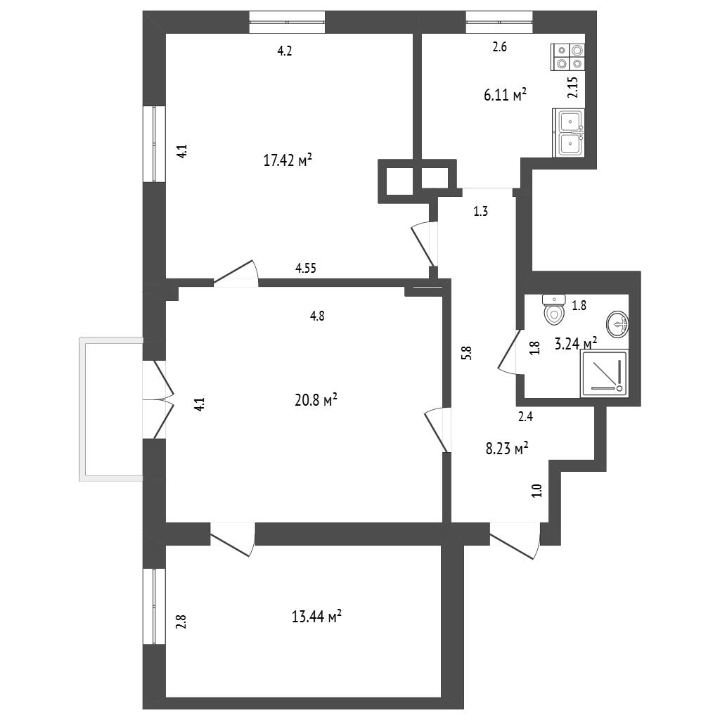 · Площадь: 69.24 м2, 3 комнаты (2 раздельные).
