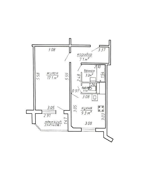 Параметры: Общая площадь по СНБ — 40.7 м2, жилая комната — 17.2 м2, просторная кухня — 9.3 м2, раздельный санузел.