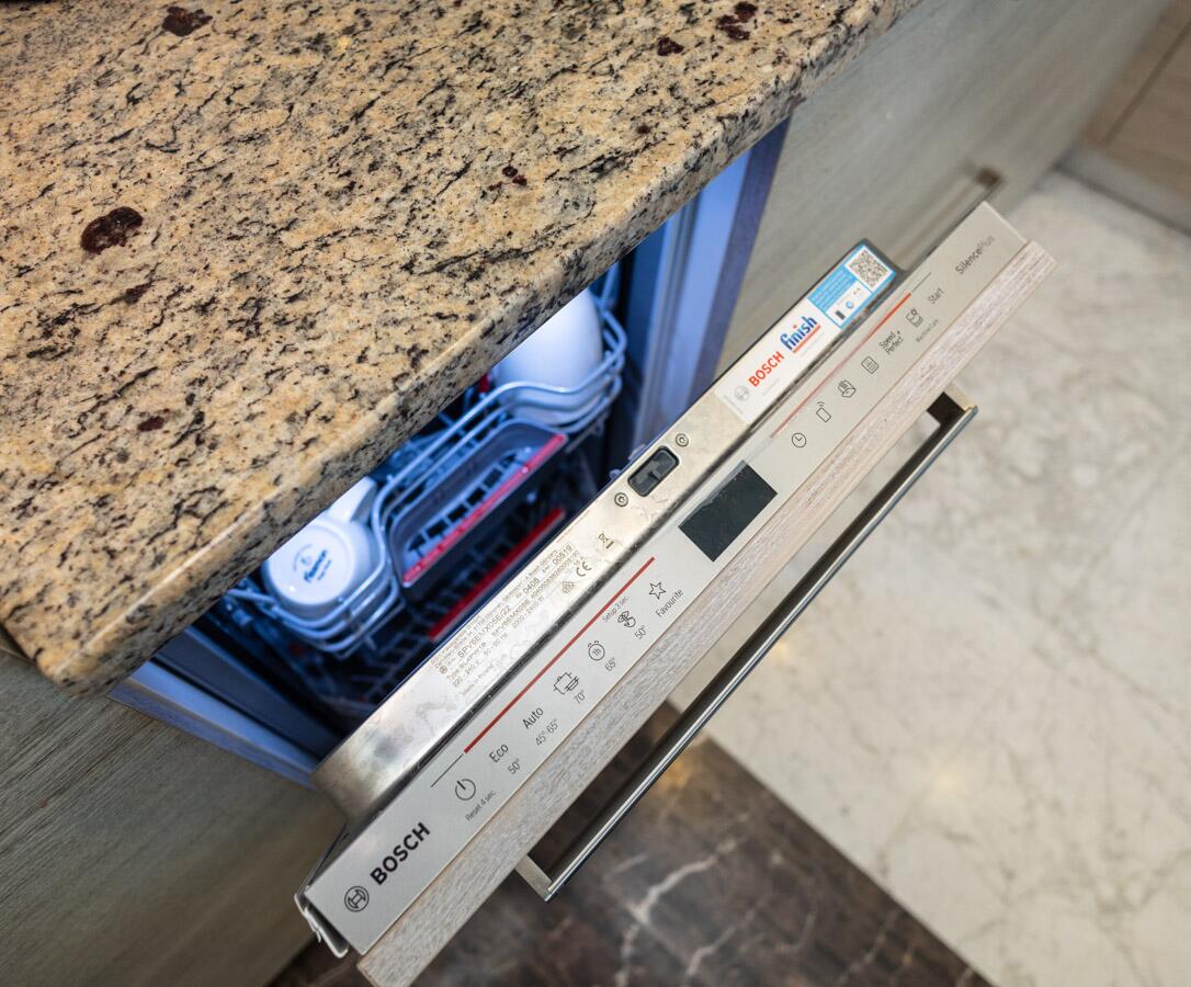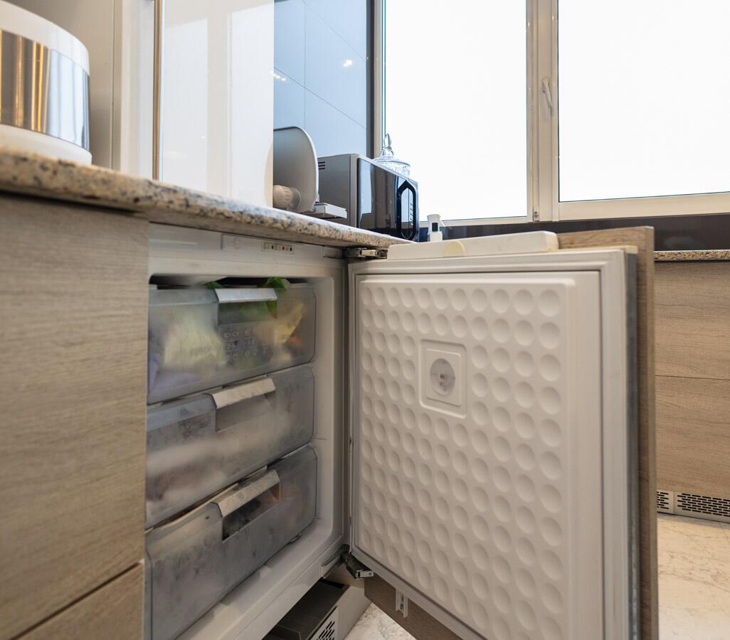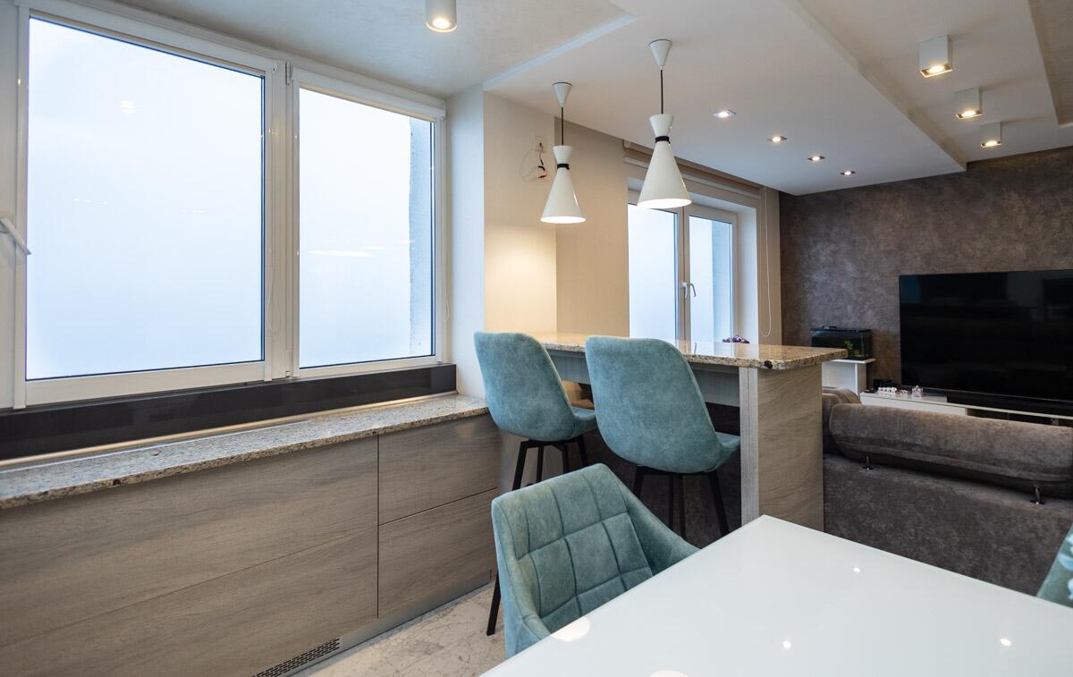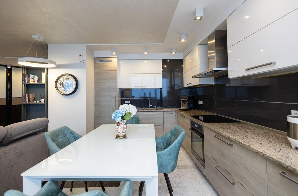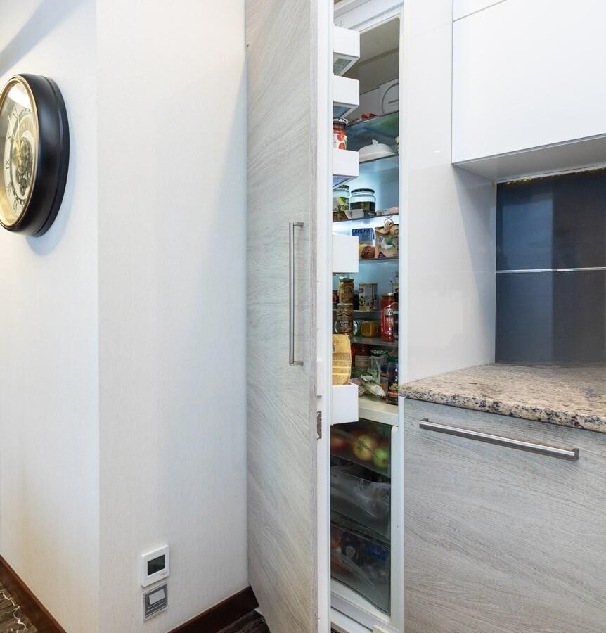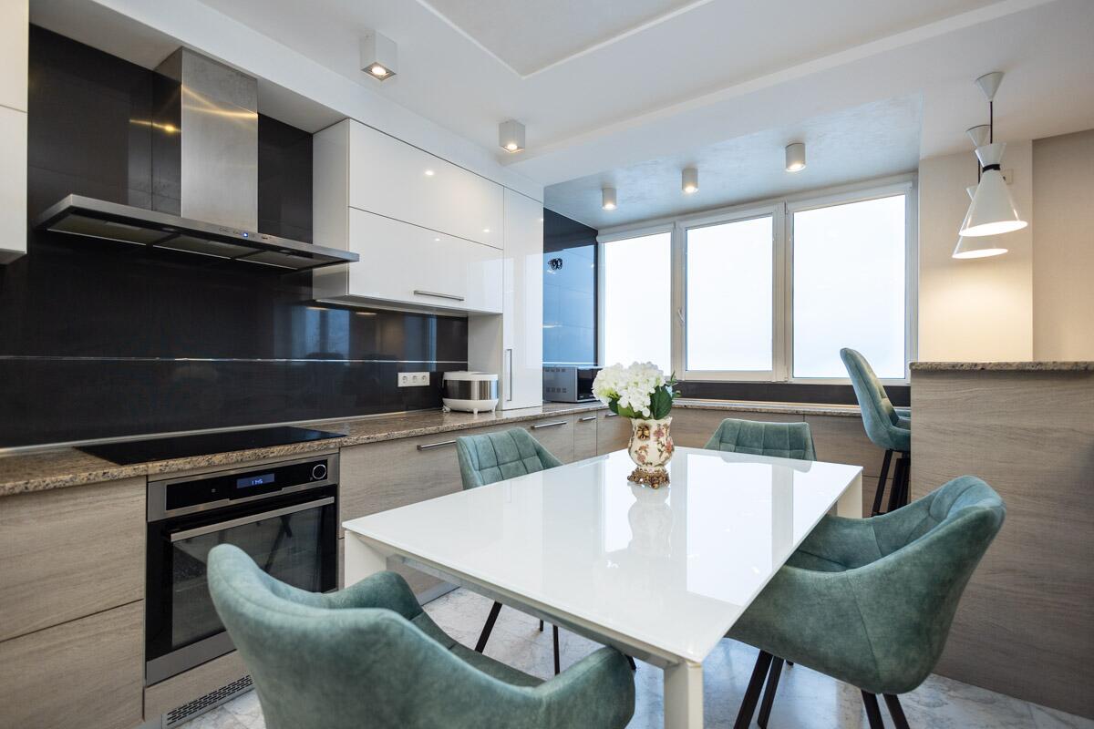 Кухня — сердце квартиры. Мебель и фасады выполнены из качественных материалов, встроенная техника топовых брендов, эффектное освещение подчёркивает стиль.