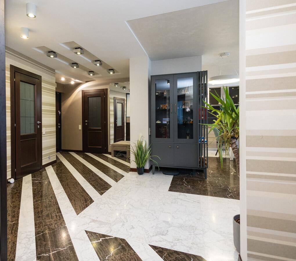 Полы — дубовая паркетная доска, итальянский керамогранит, теплые полы. Элегантное сочетание фактур создаёт атмосферу тепла и современного комфорта.