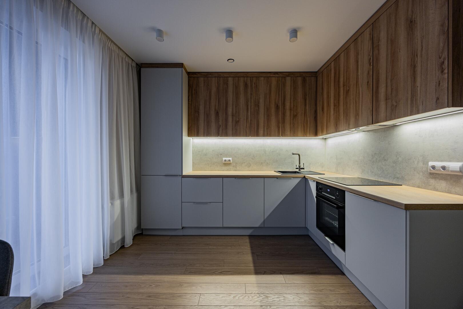 -Кухня оснащена бытовой техникой: варочная панель, духовой шкаф, вытяжка и встроенный холодильник;