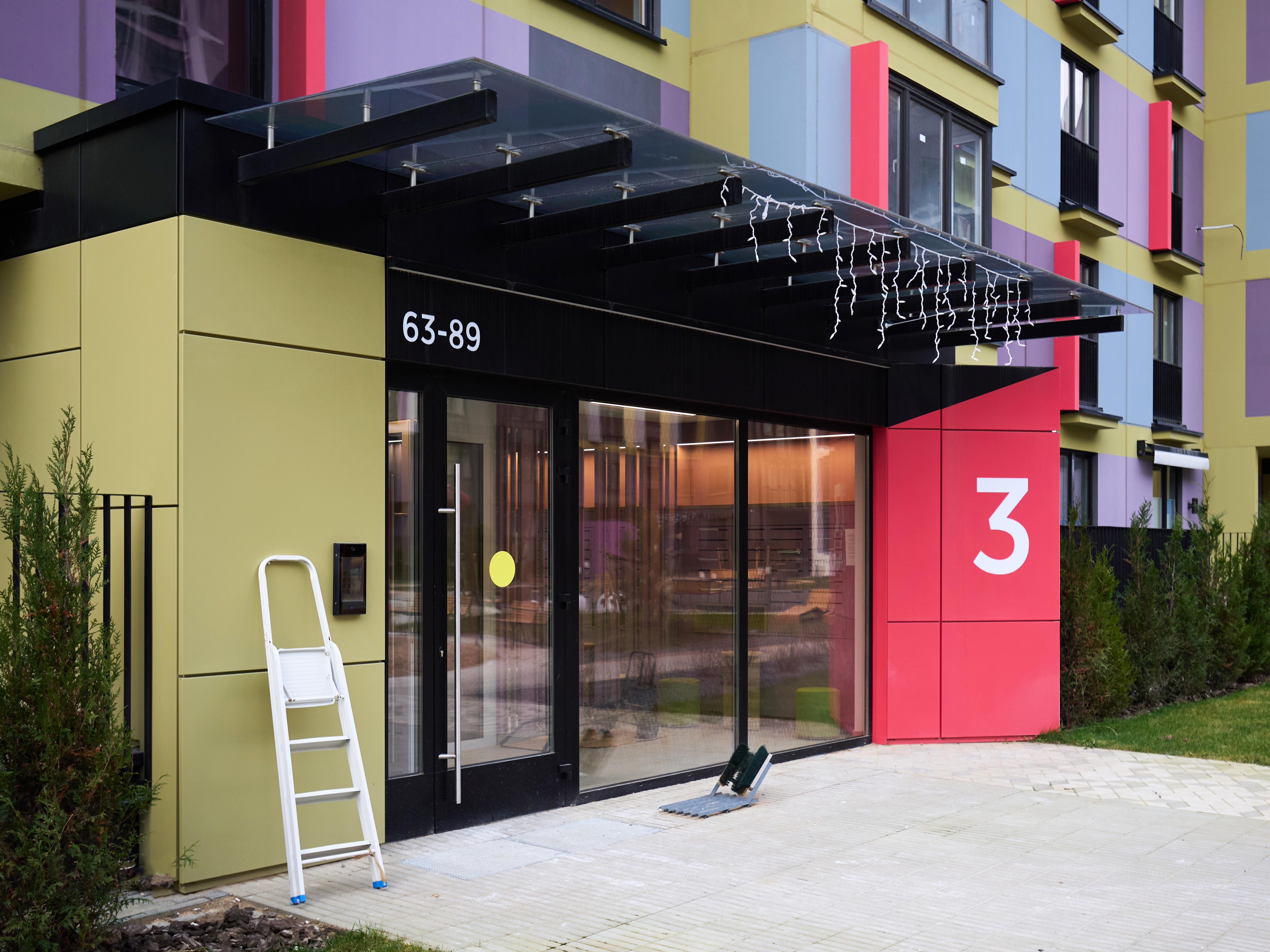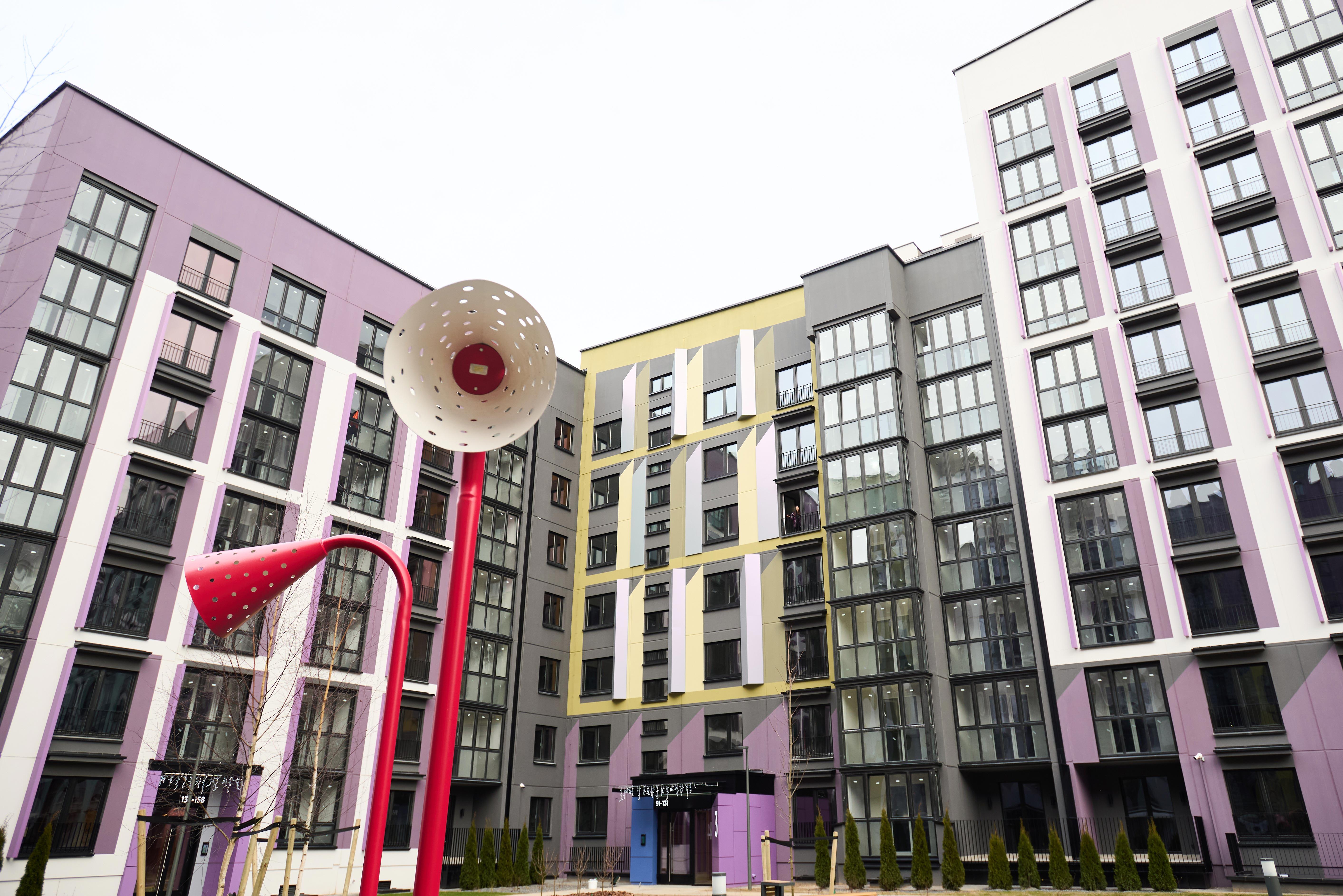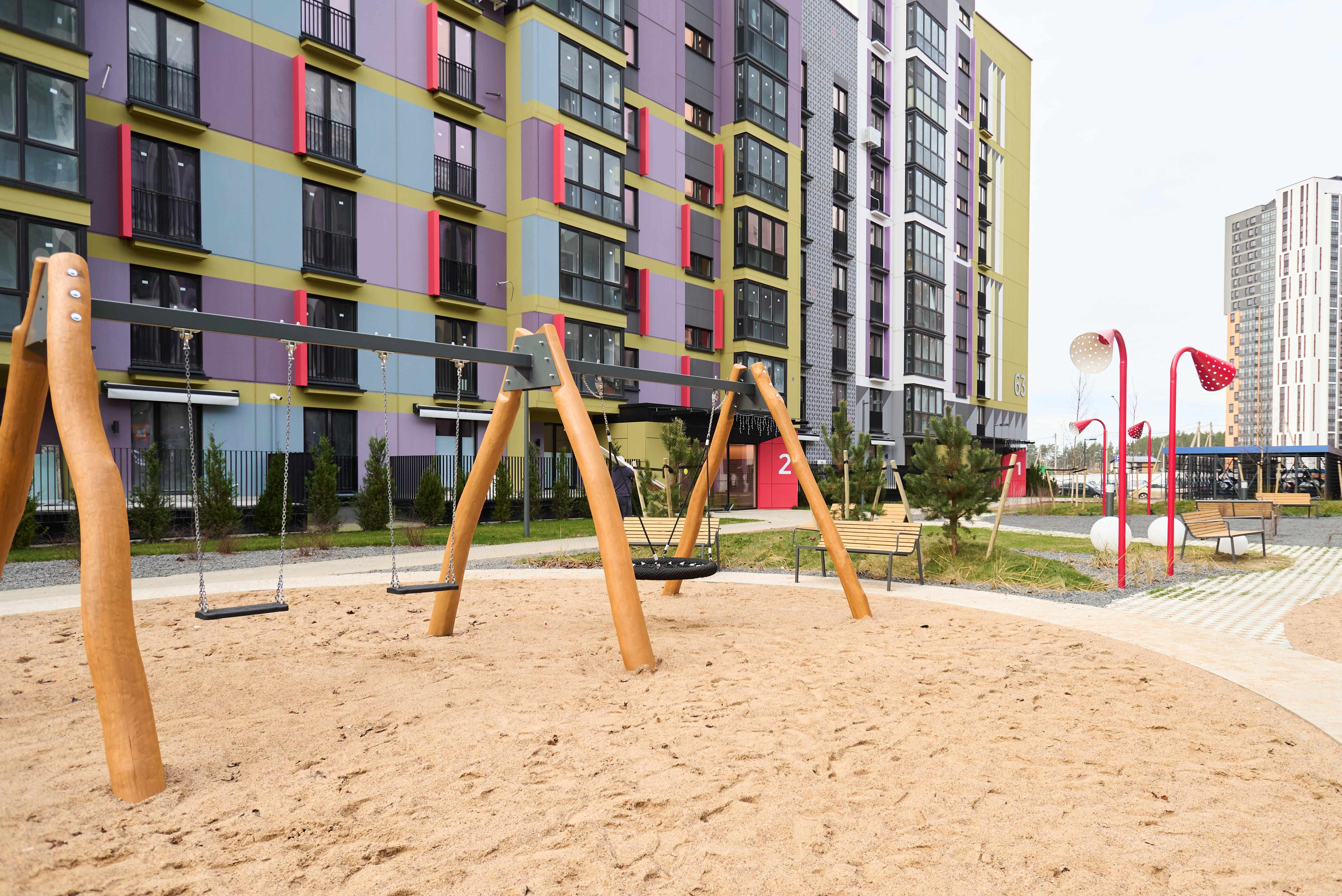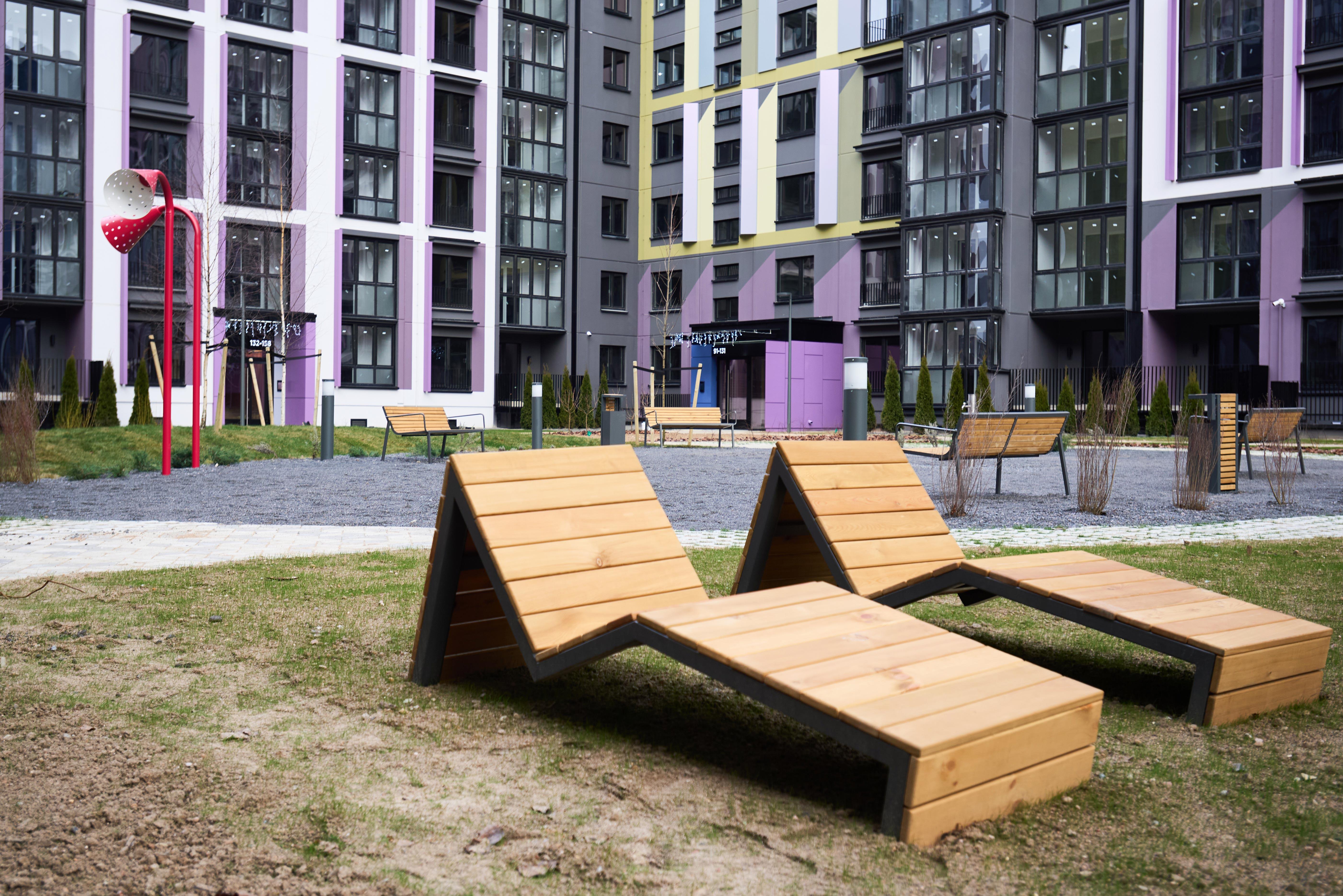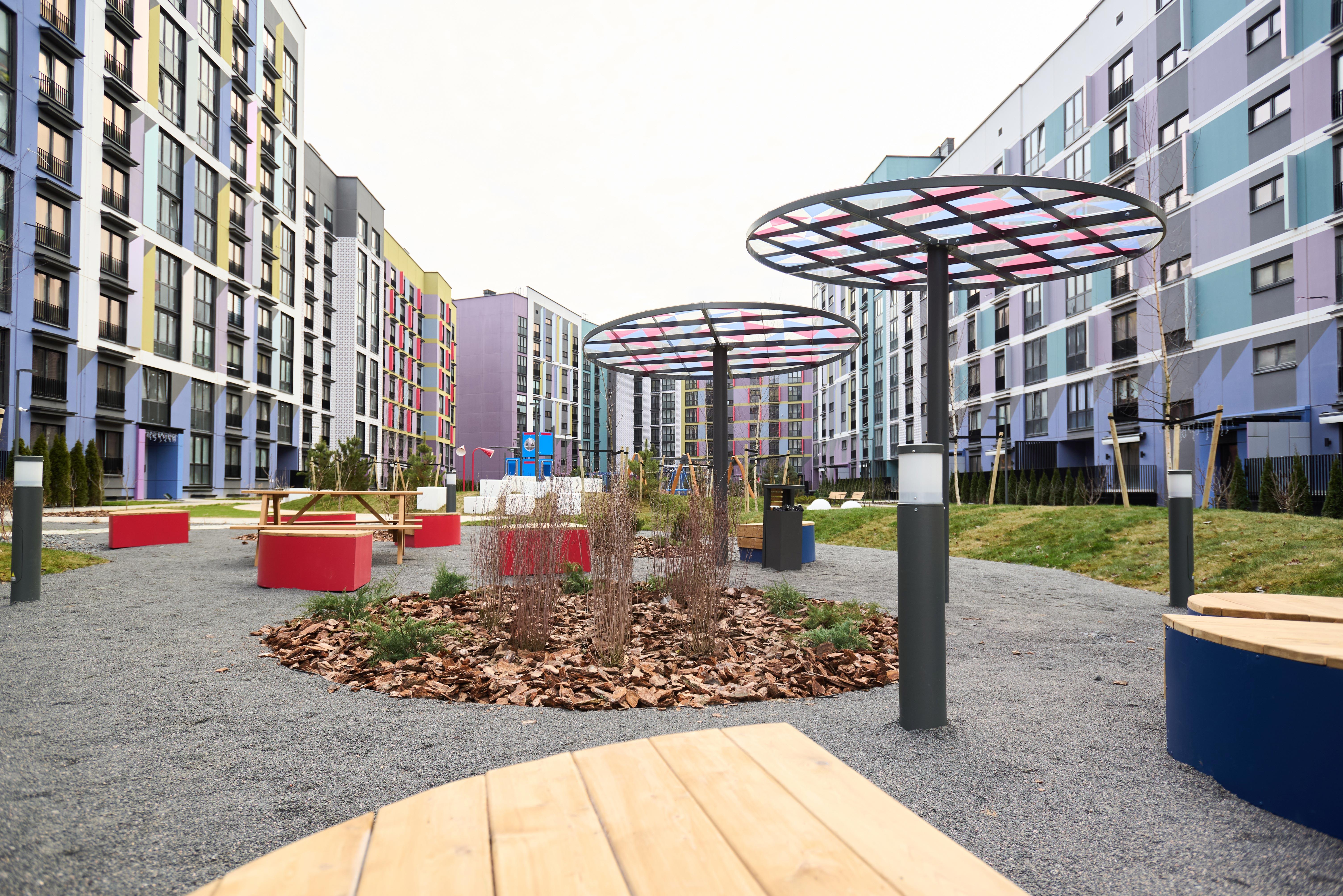 Двор спроектирован как пространство для жизни и отдыха: современные детские площадки, уличный тренажёрный зал, зоны барбекю, игровые зоны, места отдыха для взрослых, велопарковки и большое количество зелени.