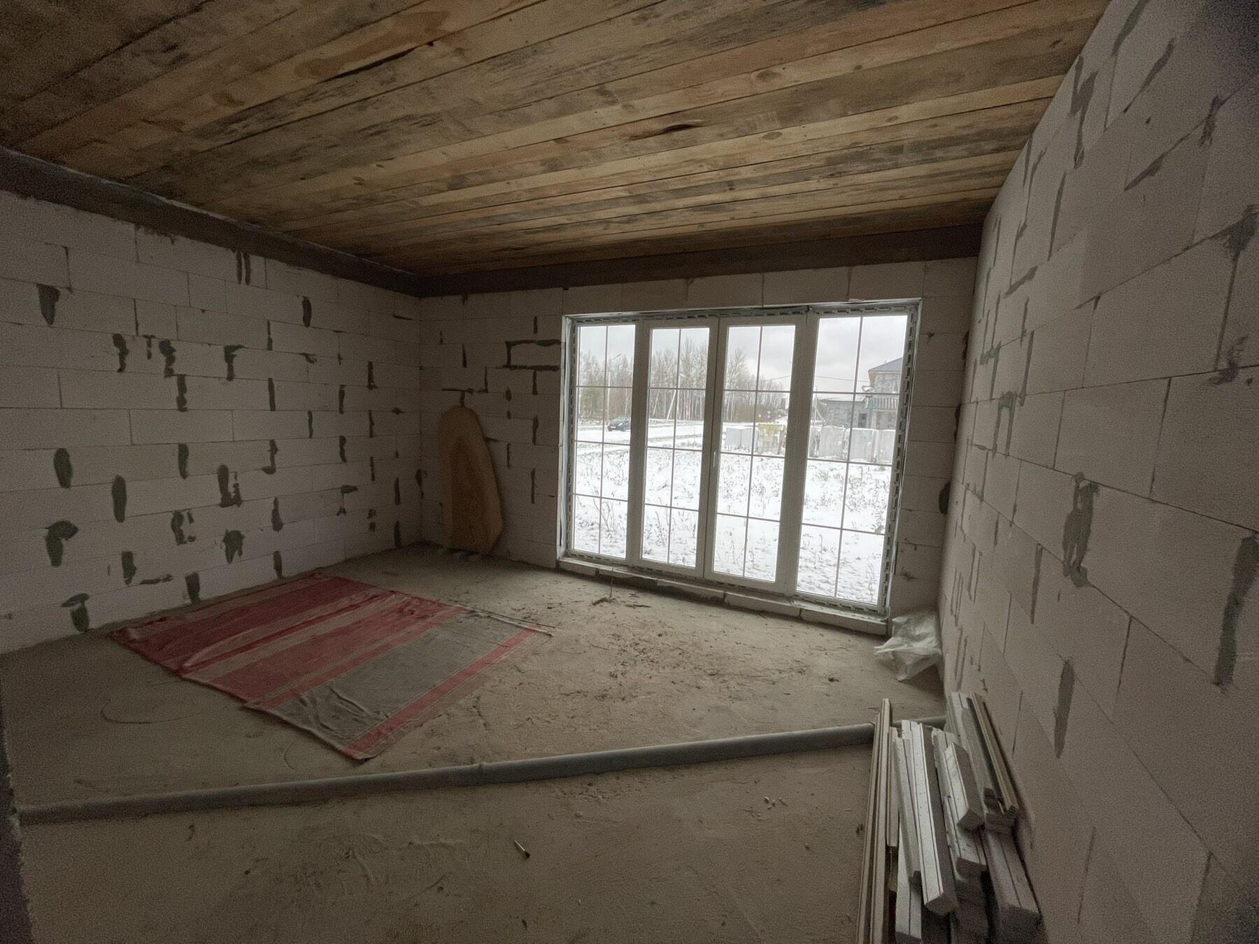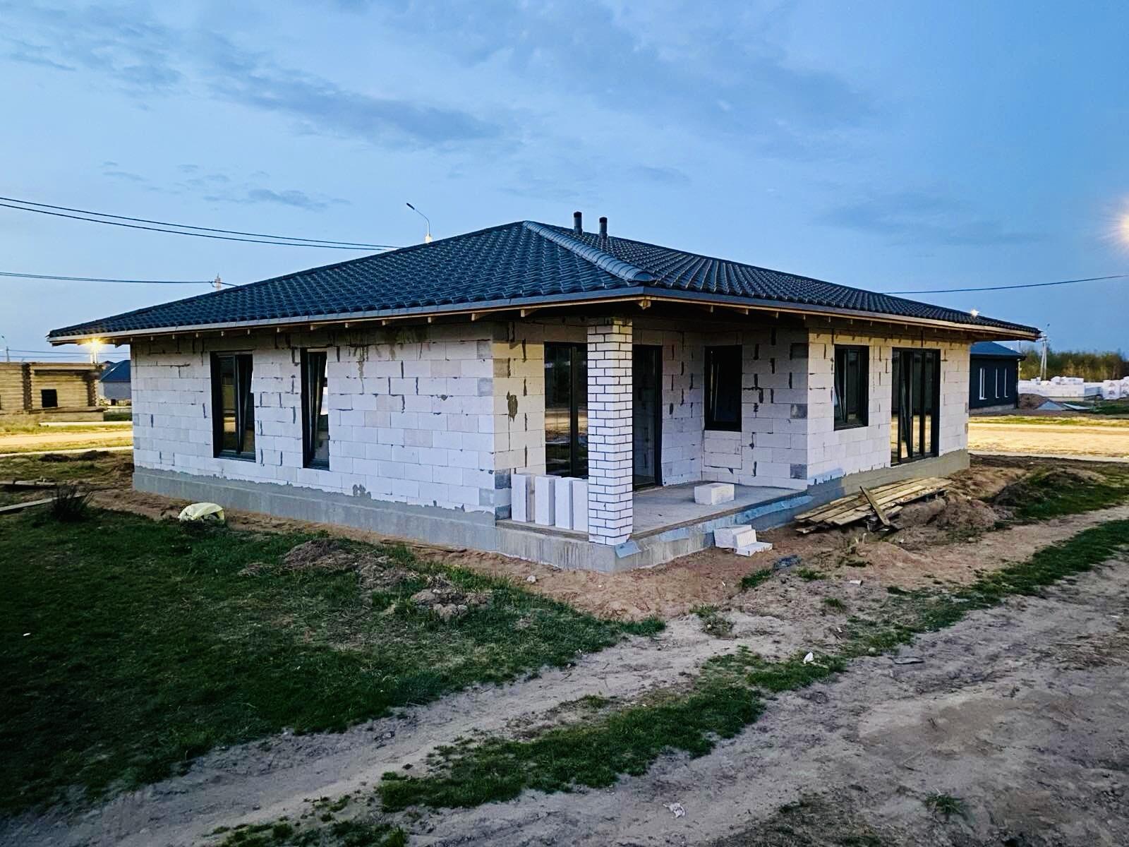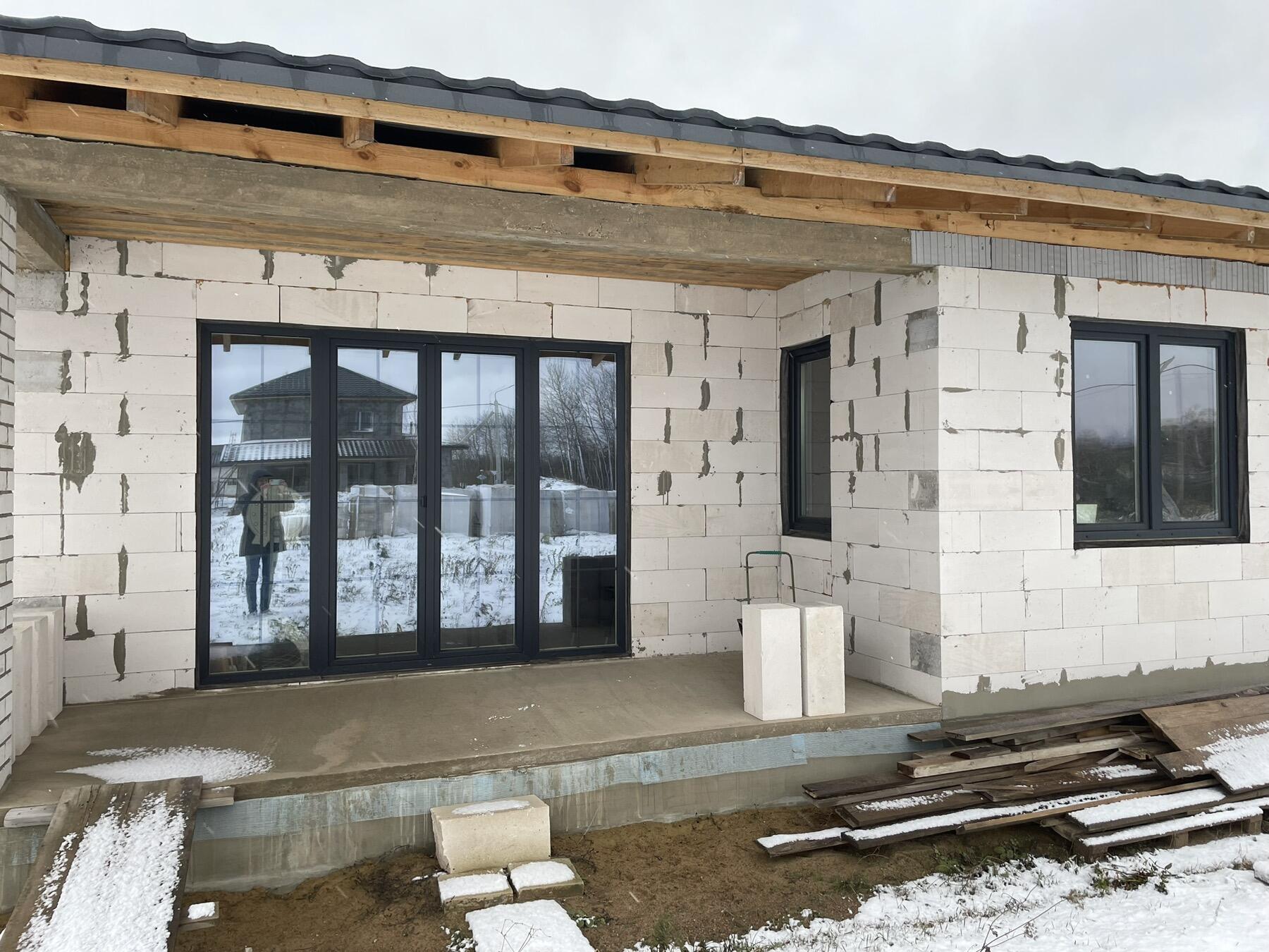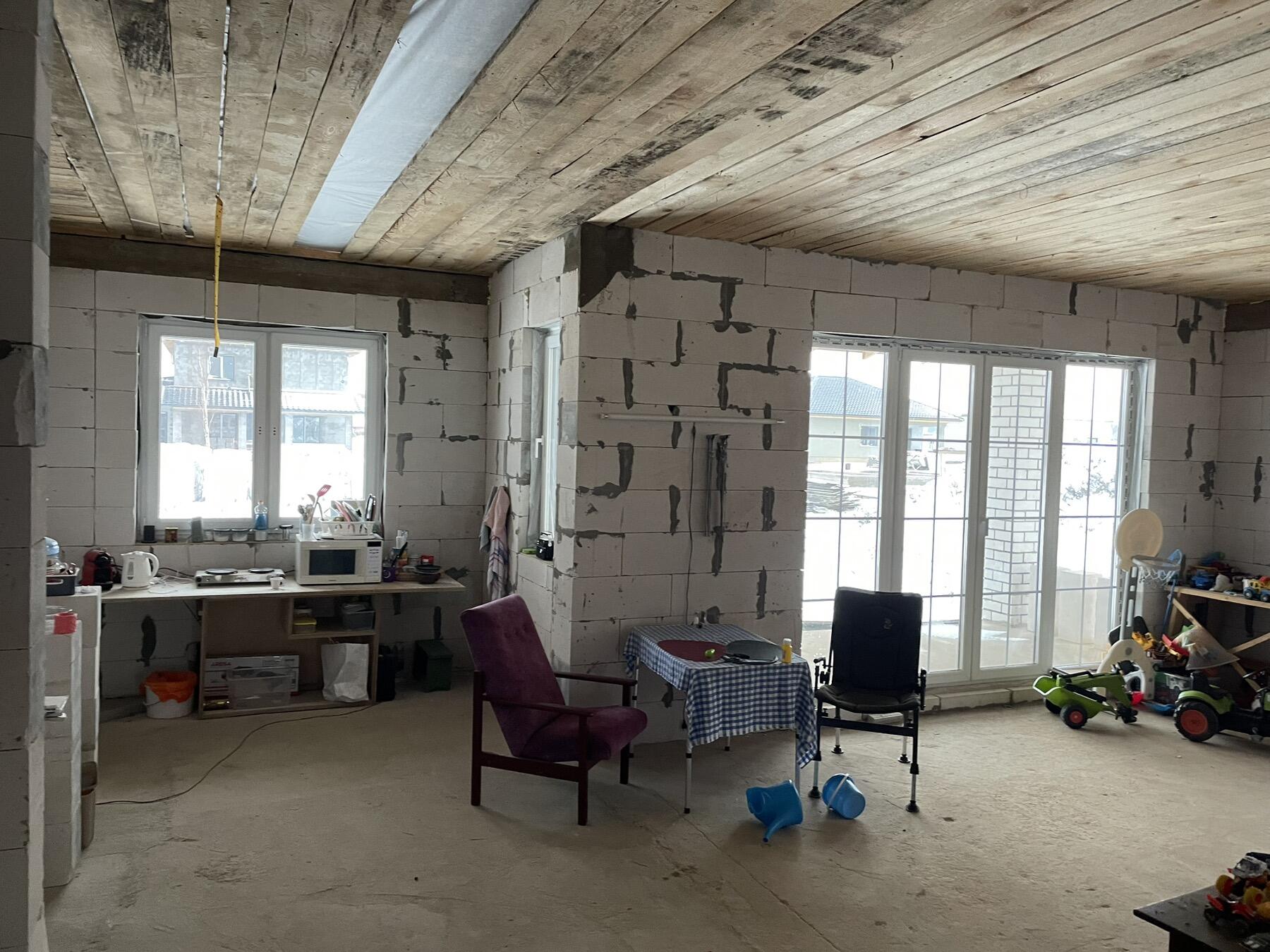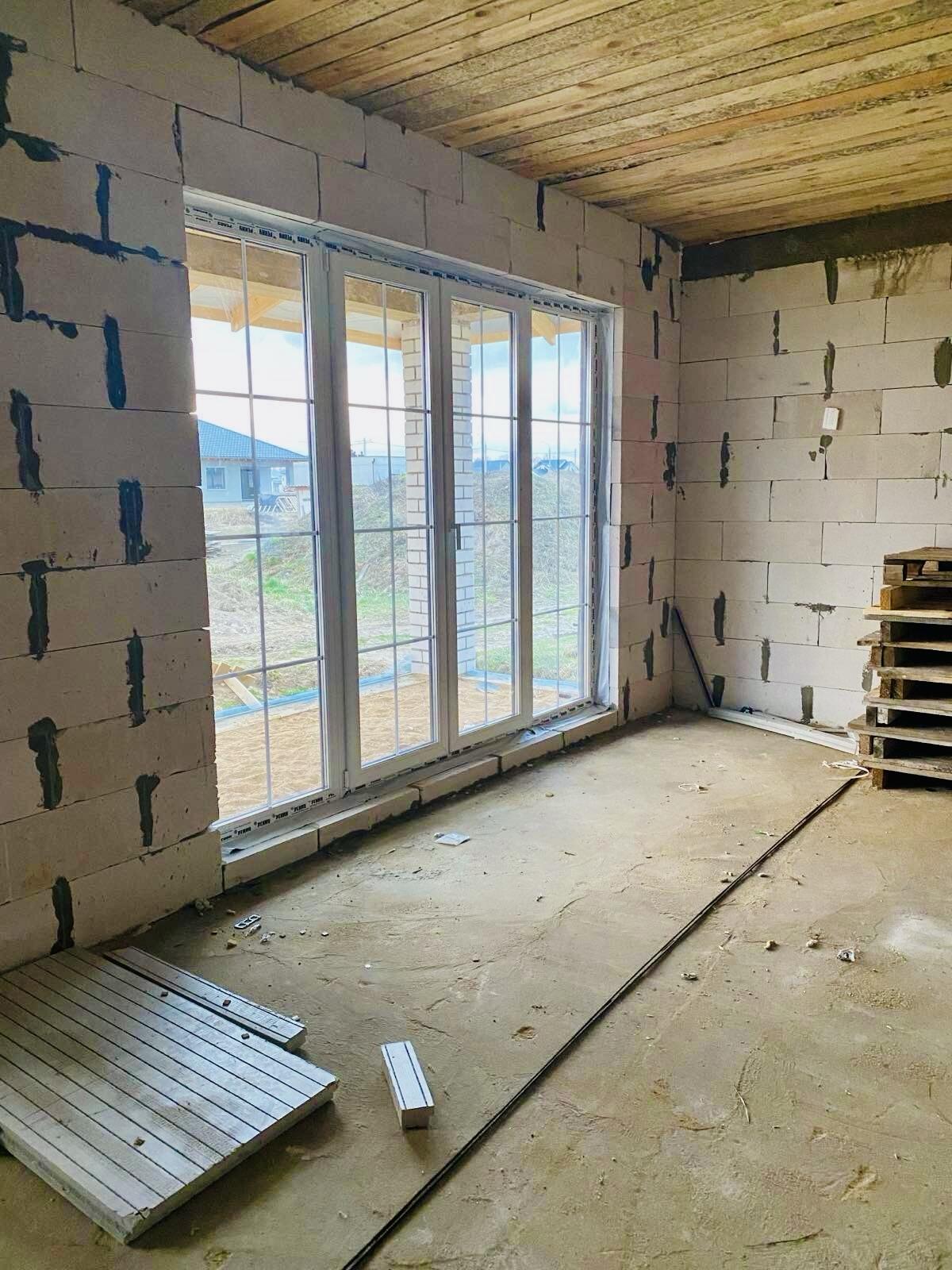 фундамент из бетона высшей марки; стены из газосиликатных блоков 300 мм; кровля — качественная корейская черепица с высоким сроком службы; установлены премиальные окна и входная дверь Rehau, включая французские окна; выполнена стяжка пола, подшиты потолки. Дом светлый, просторный, с продуманной архитектурой — проект заказывался у профессионального архитектора.