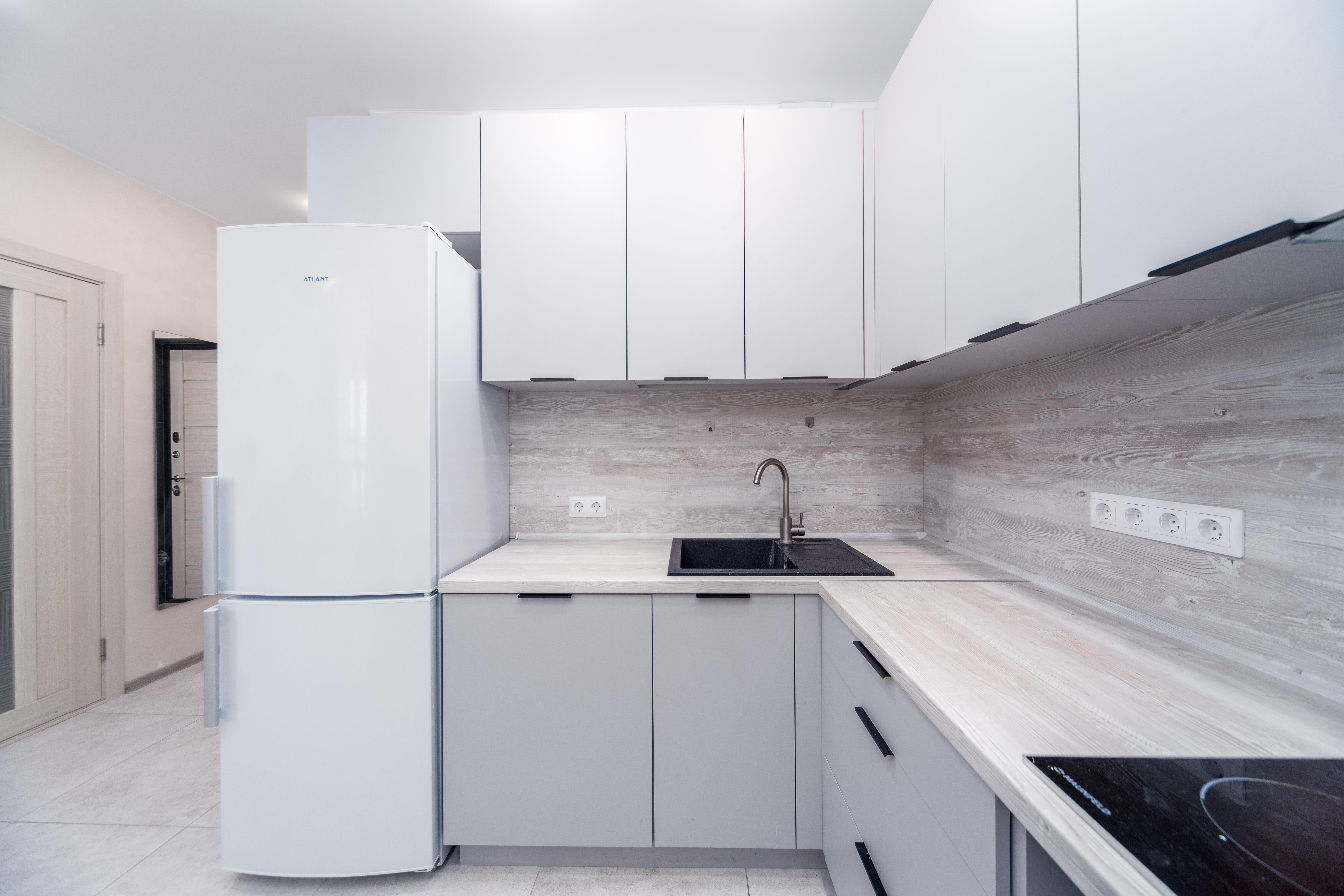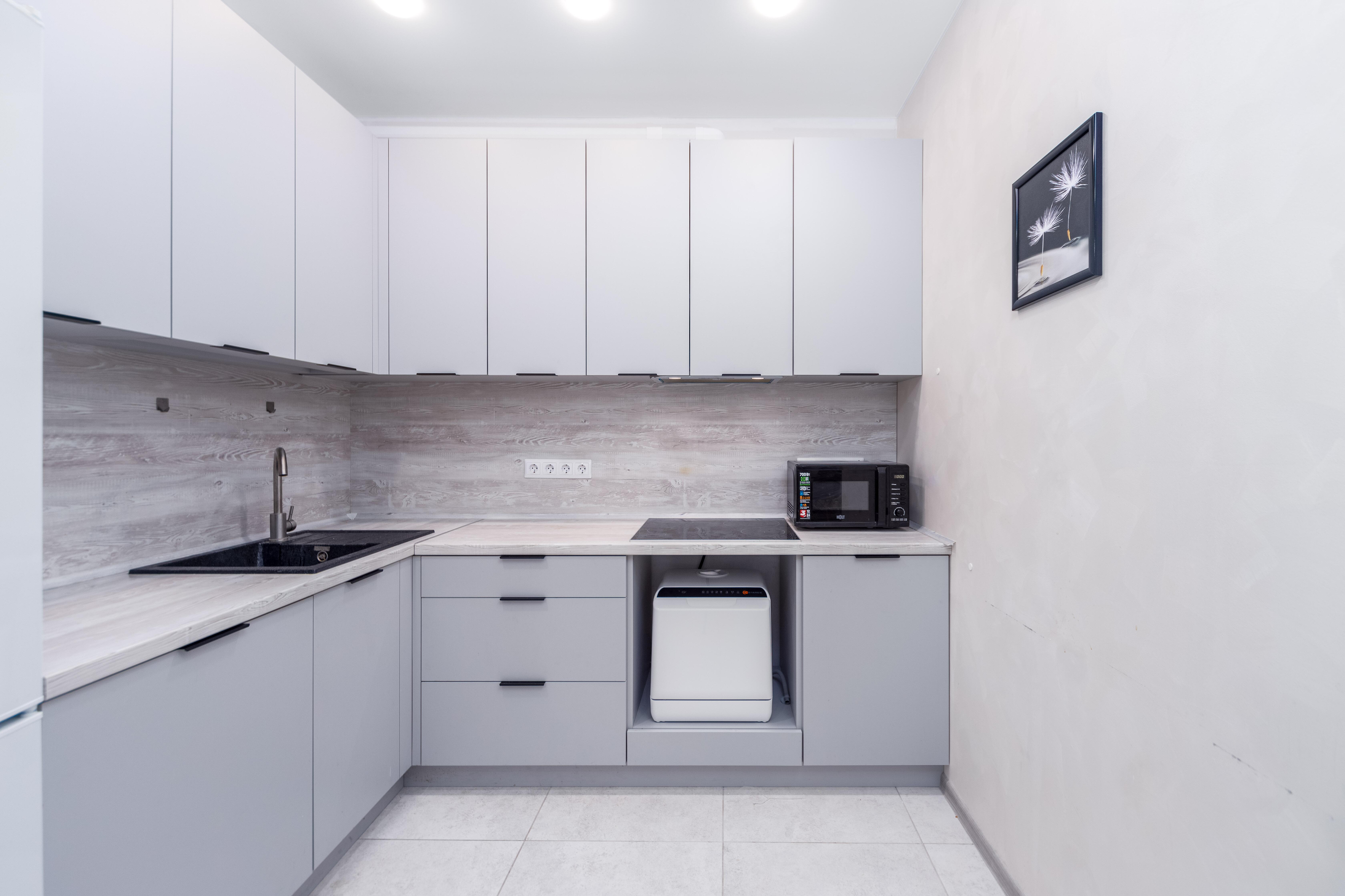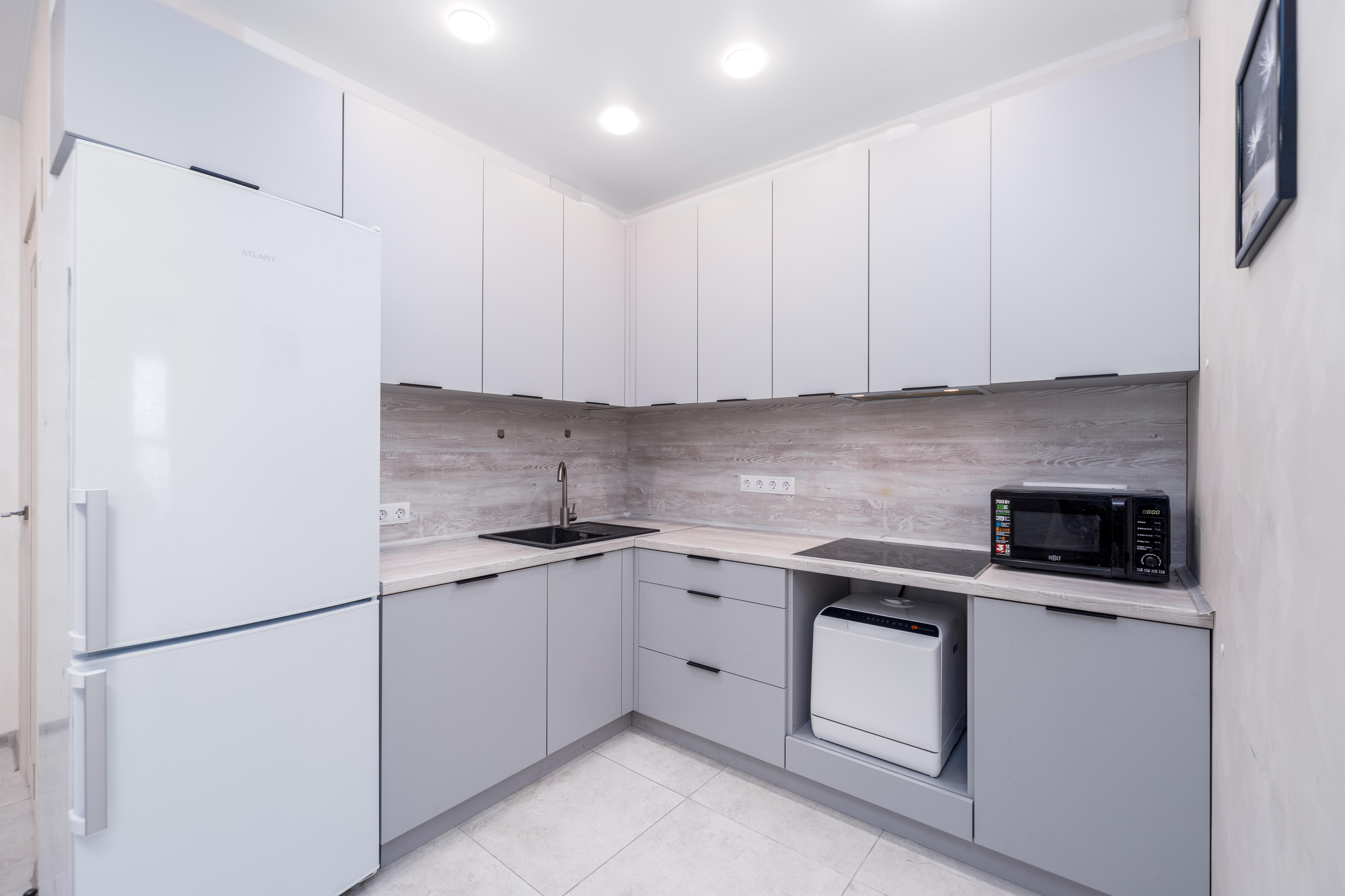 Оборудованная кухня-гостиная со встроенной мебелью и техникой.