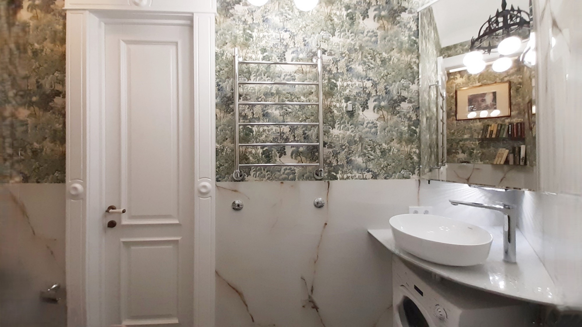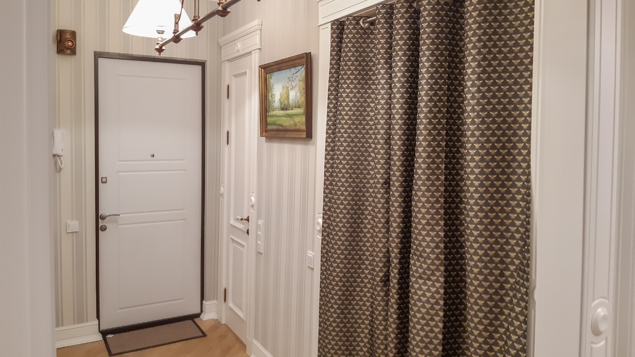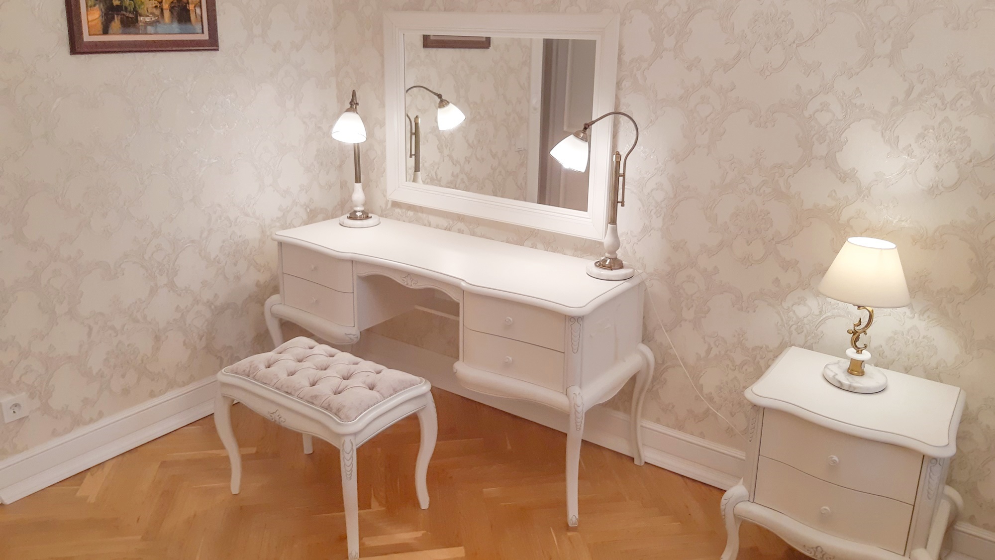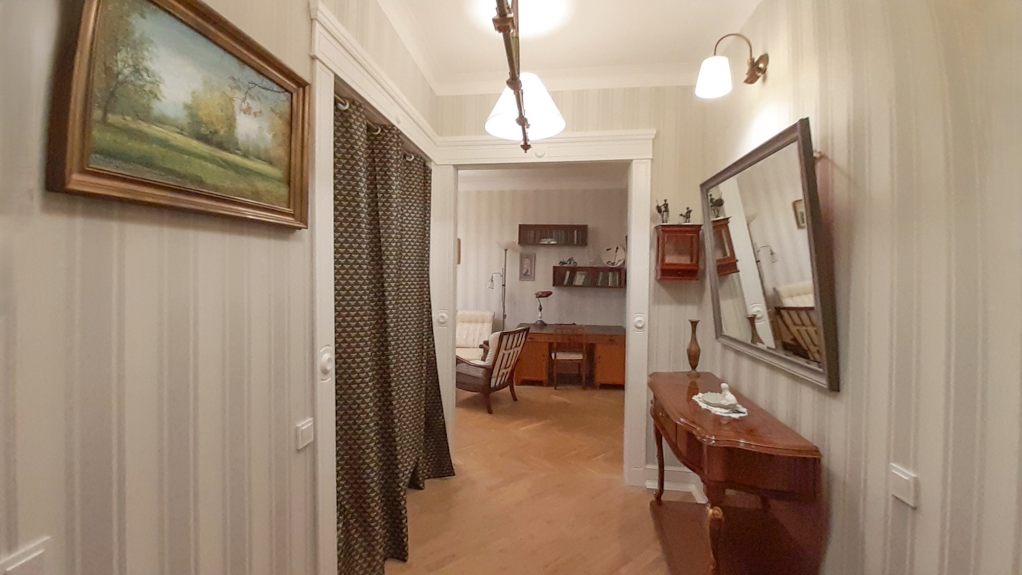 Мебель и интерьеры подобраны в классическом французском стиле. Часть элементов ручной работы, изготовлены по индивидуальному заказу. Люстры, светильники, торшер, бра - авторской работы, сделаны мастером специально для этой квартиры. Звонок и кнопка звонка, люстра в санузле, картина в кухне - все ручной работы (стиль Стимпанк). Часть мебели отреставрирована, в том числе рабочее место писателя. На стене уютно расположились механические часы с запасом хода в две недели,