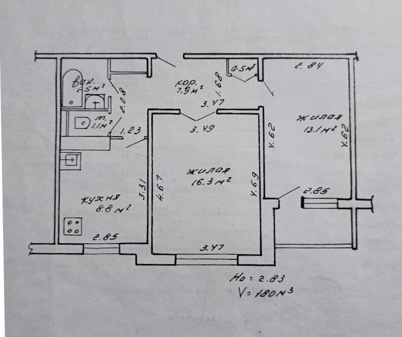 Площадь 51.7 м. кв., жилая 29.4 м. кв., кухня 8.8 м. кв.