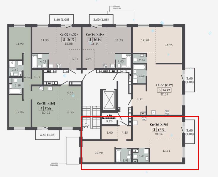 Для каждой квартиры – кладовая в тех. подполье, для некоторых квартир есть кладовые на этаже в угловой секции.