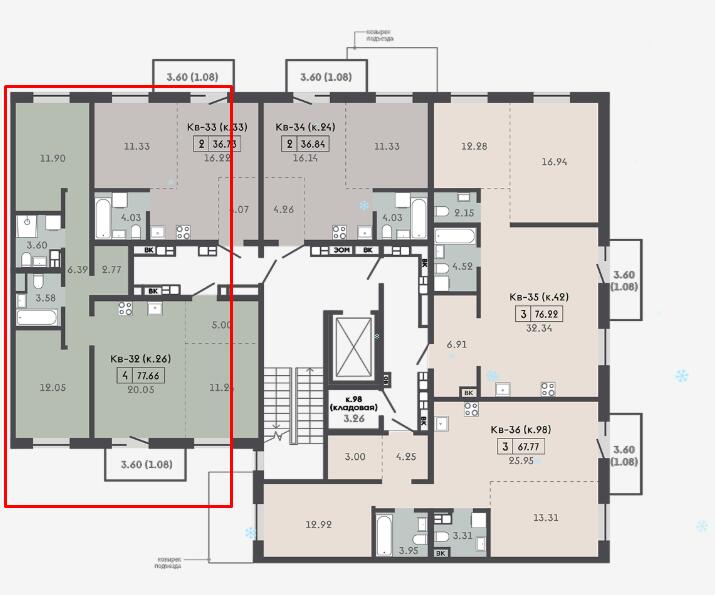 Для каждой квартиры – кладовая в тех. подполье, для некоторых квартир есть кладовые на этаже в угловой секции.
