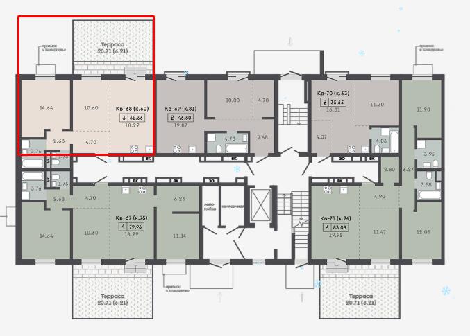 Для каждой квартиры – кладовая в тех. подполье, для некоторых квартир есть кладовые на этаже в угловой секции.