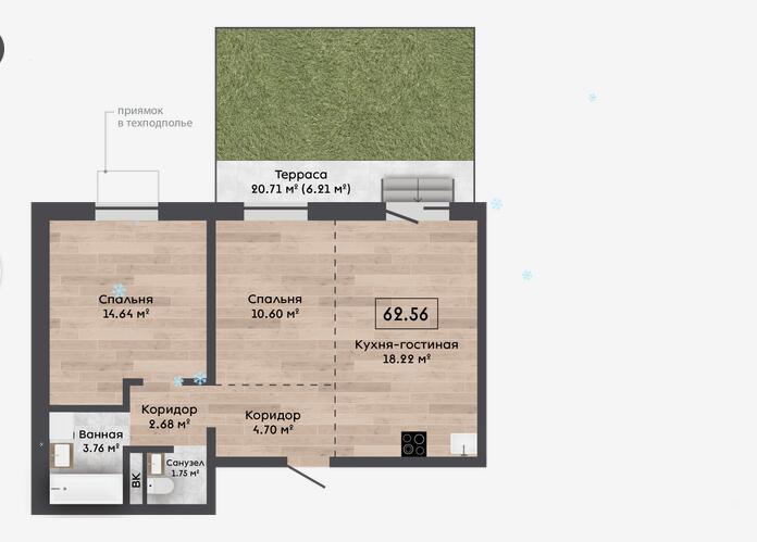 Квартира с участком на первом этаже 20,71м2 и кладовой 2,57м2.