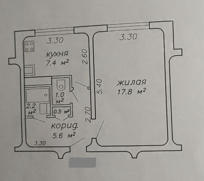 – Общая площадь- 34,5 м2. Жилая – 17,8 м2. Площадь кухни- 7,4 м2.