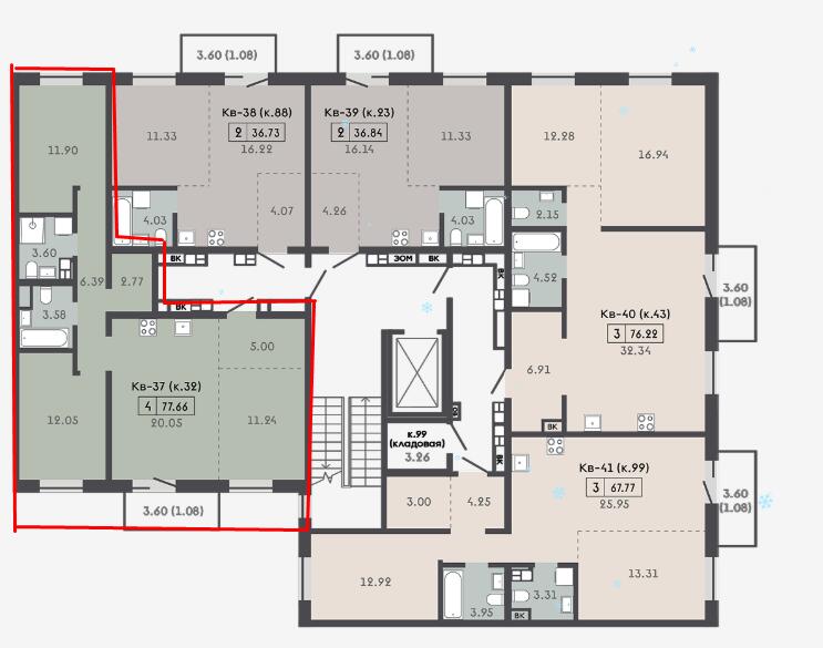 Для каждой квартиры – кладовая в тех. подполье, для некоторых квартир есть кладовые на этаже в угловой секции.