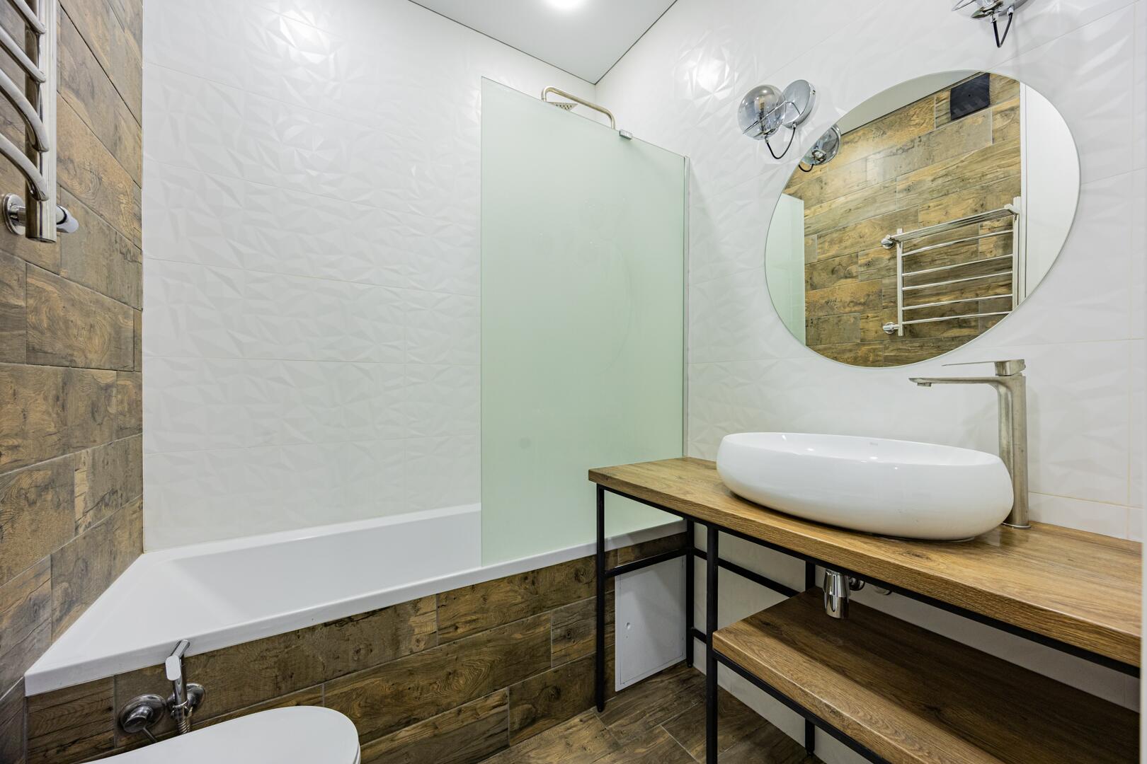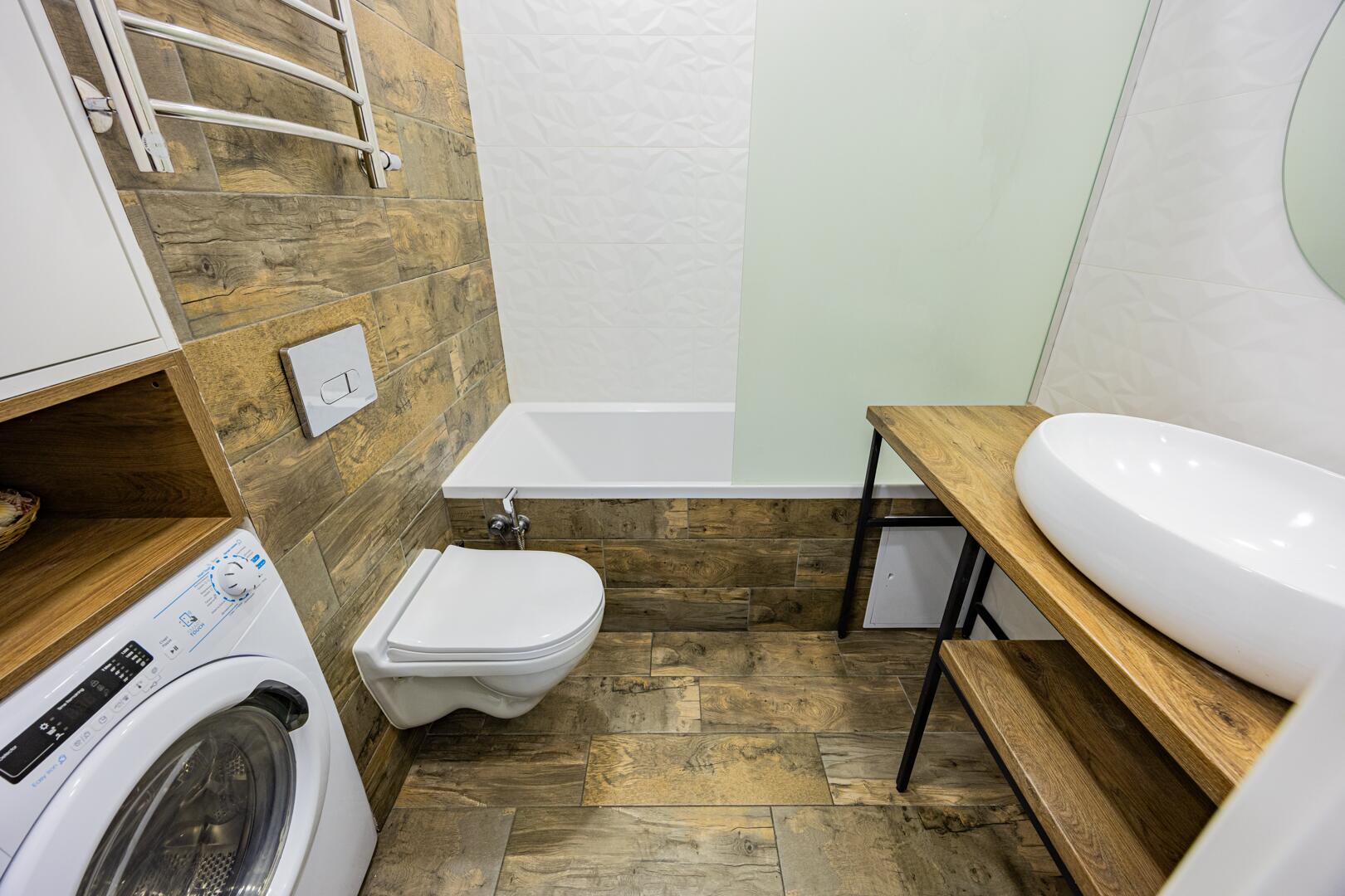 - Санузел отделан плиткой, установлена вся необходимая сантехника