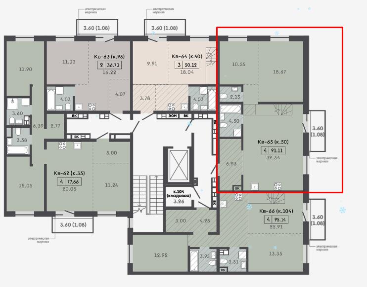 Для каждой квартиры – кладовая в тех. подполье, для некоторых квартир есть кладовые на этаже в угловой секции.