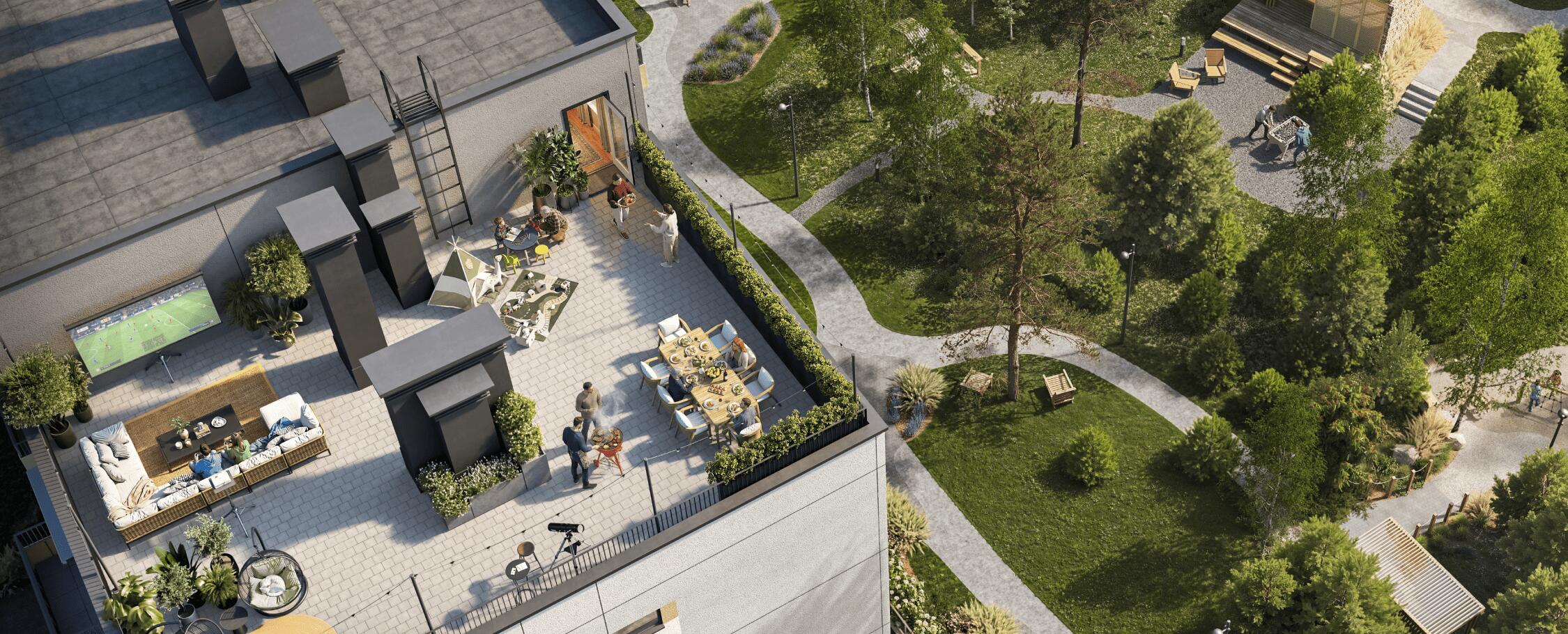 Квартиры на 1 этаже с личными участками-террасами с видом во двор и зеленый коридор.