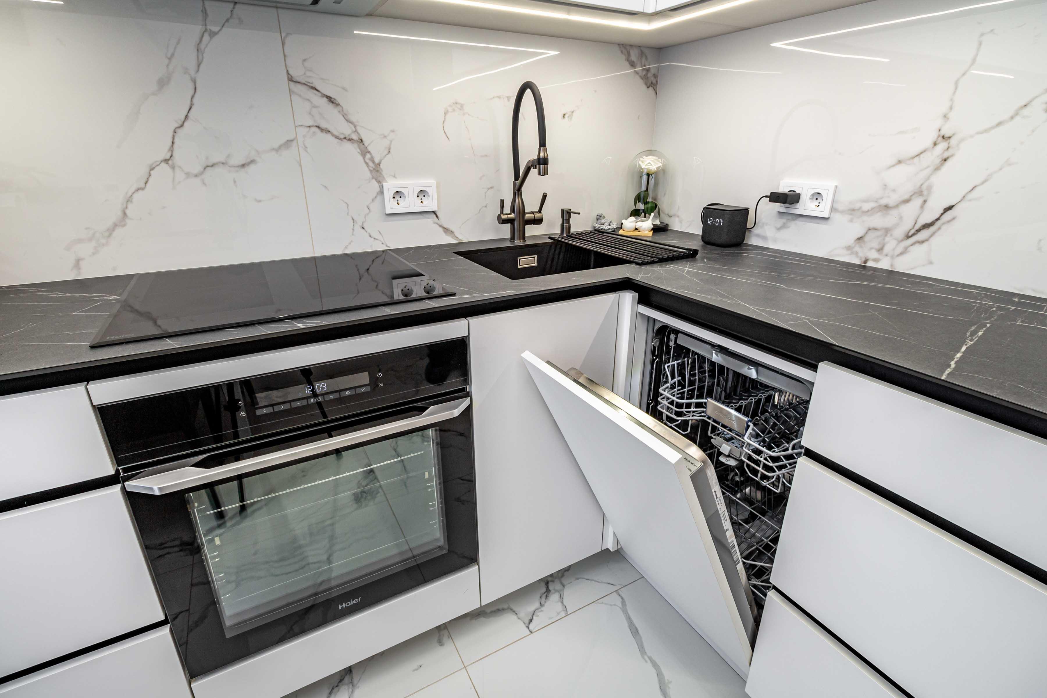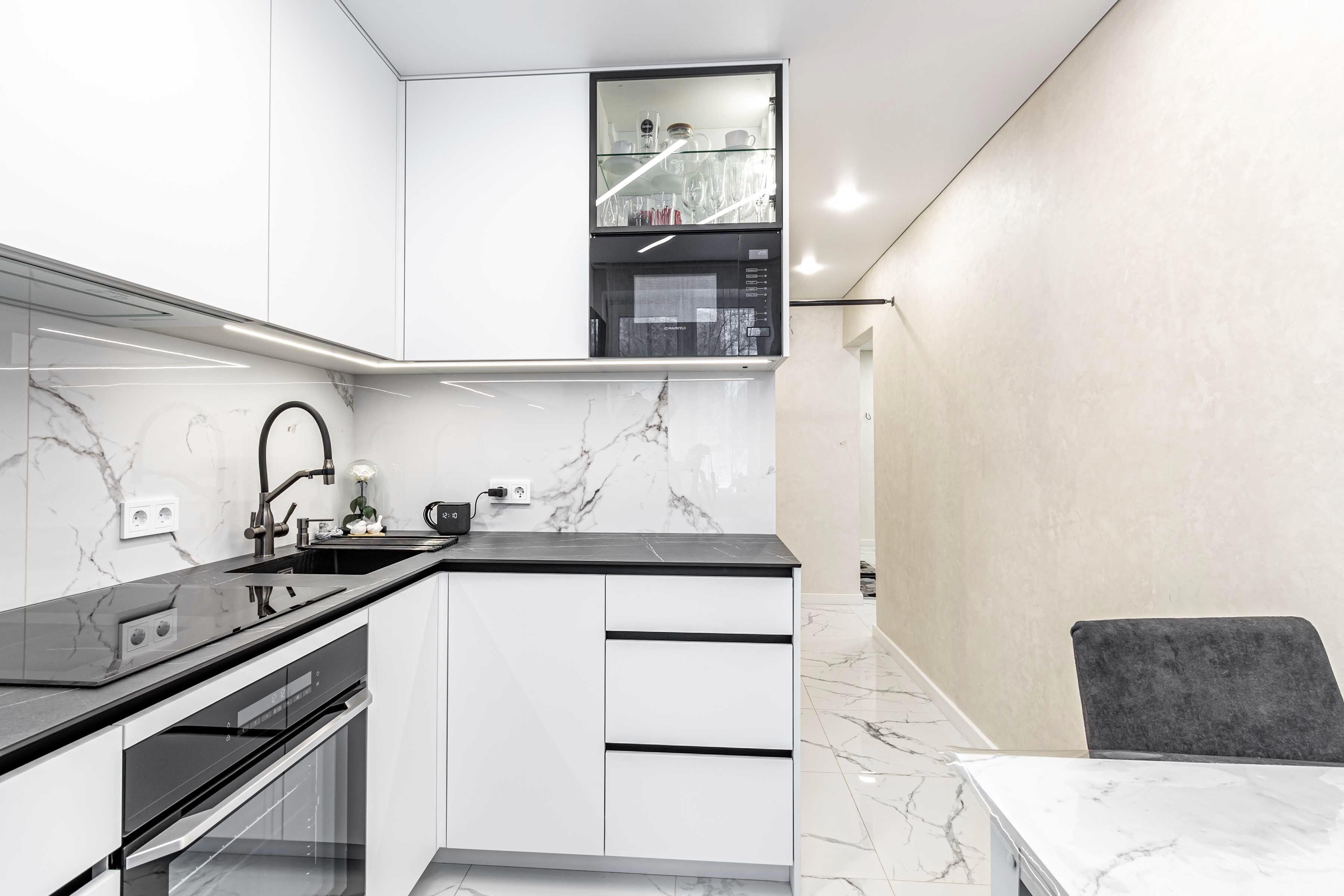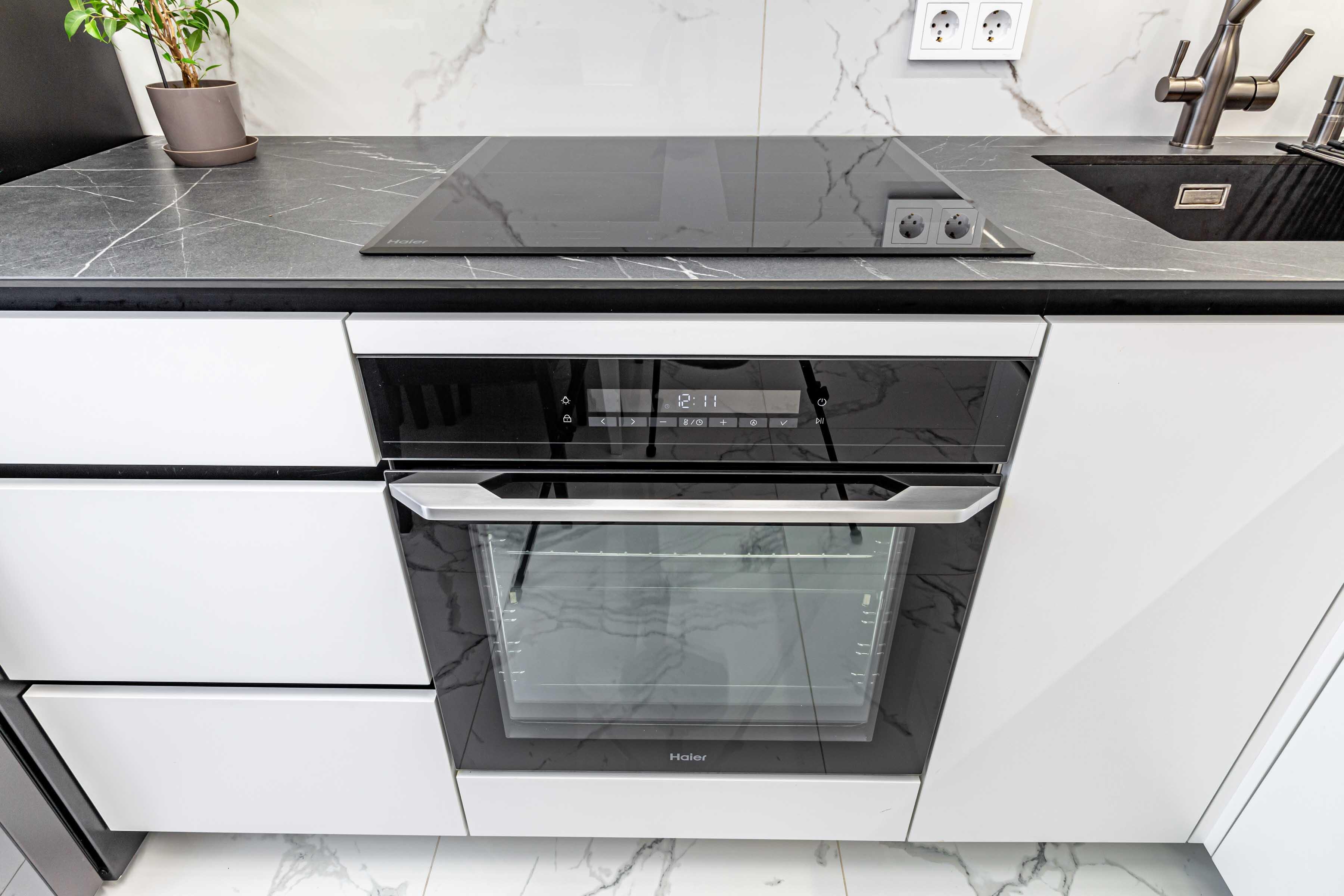 · Кухня оборудована встроенной мебелью и техникой (варочная поверхность, духовой шкаф, вытяжка, посудомоечная машина, микроволновая печь).