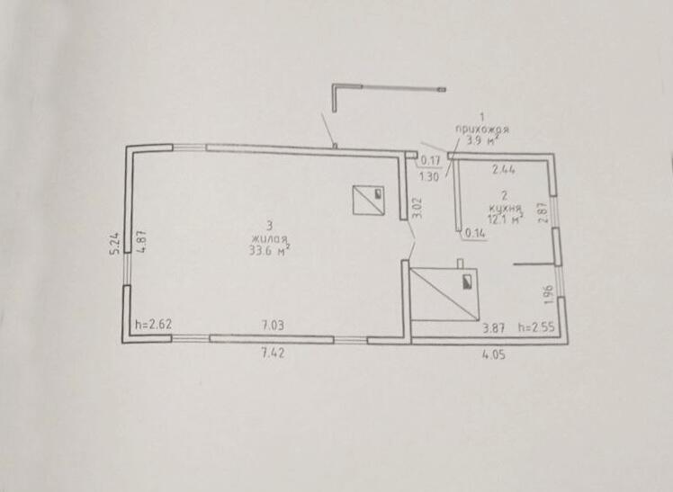 Дом размерами 7,5х11,5 состоит из двух частей – большой комнаты 33,6 кв.м. с печкой и кухонной зоны с большой печью, также есть прихожая в небольшой пристройке. Перекрытия, полы, окна и двери из дерева, крыша - шифер.