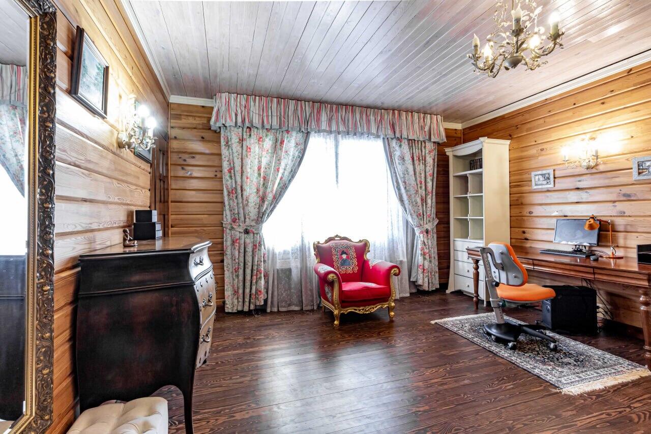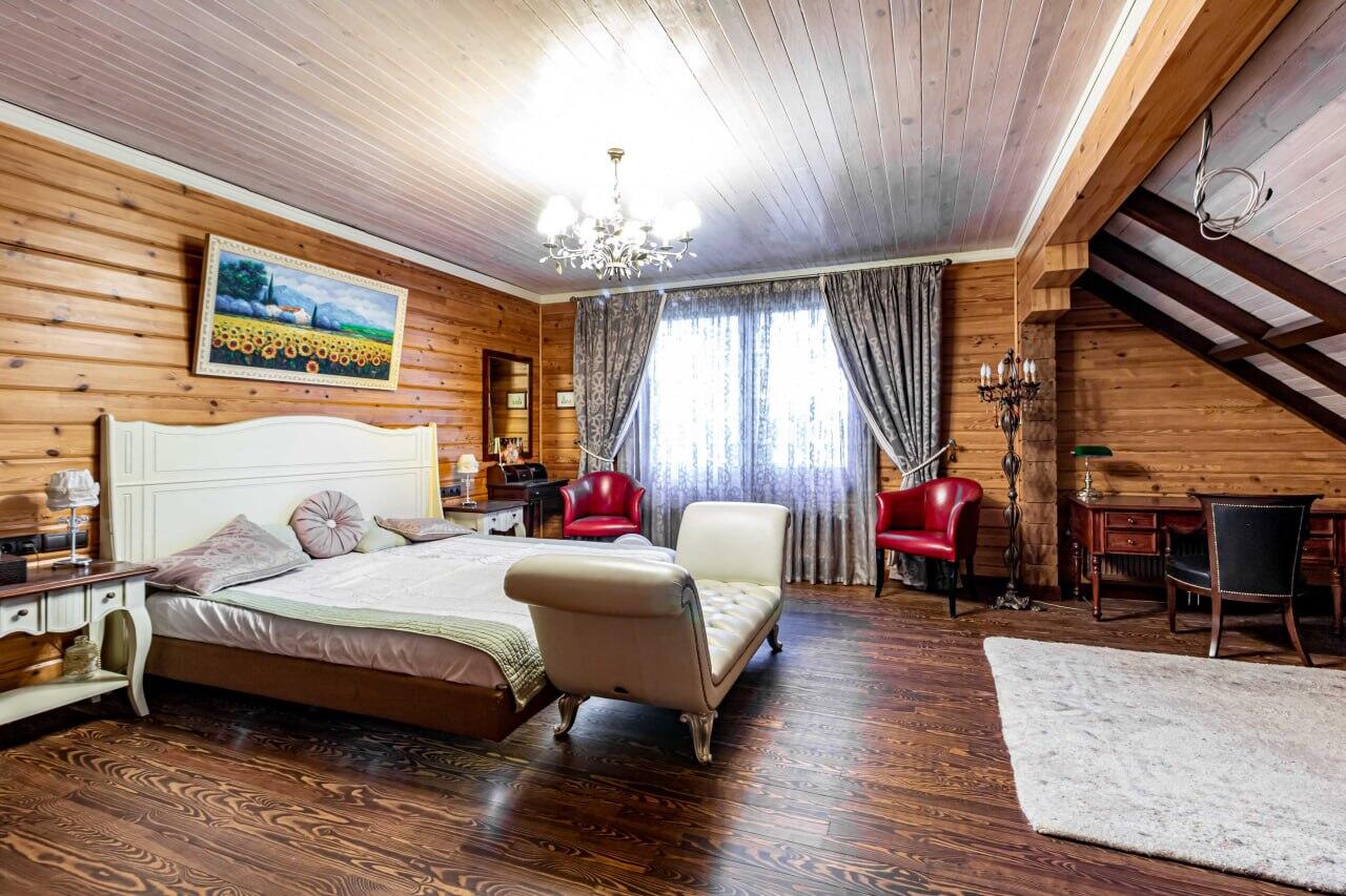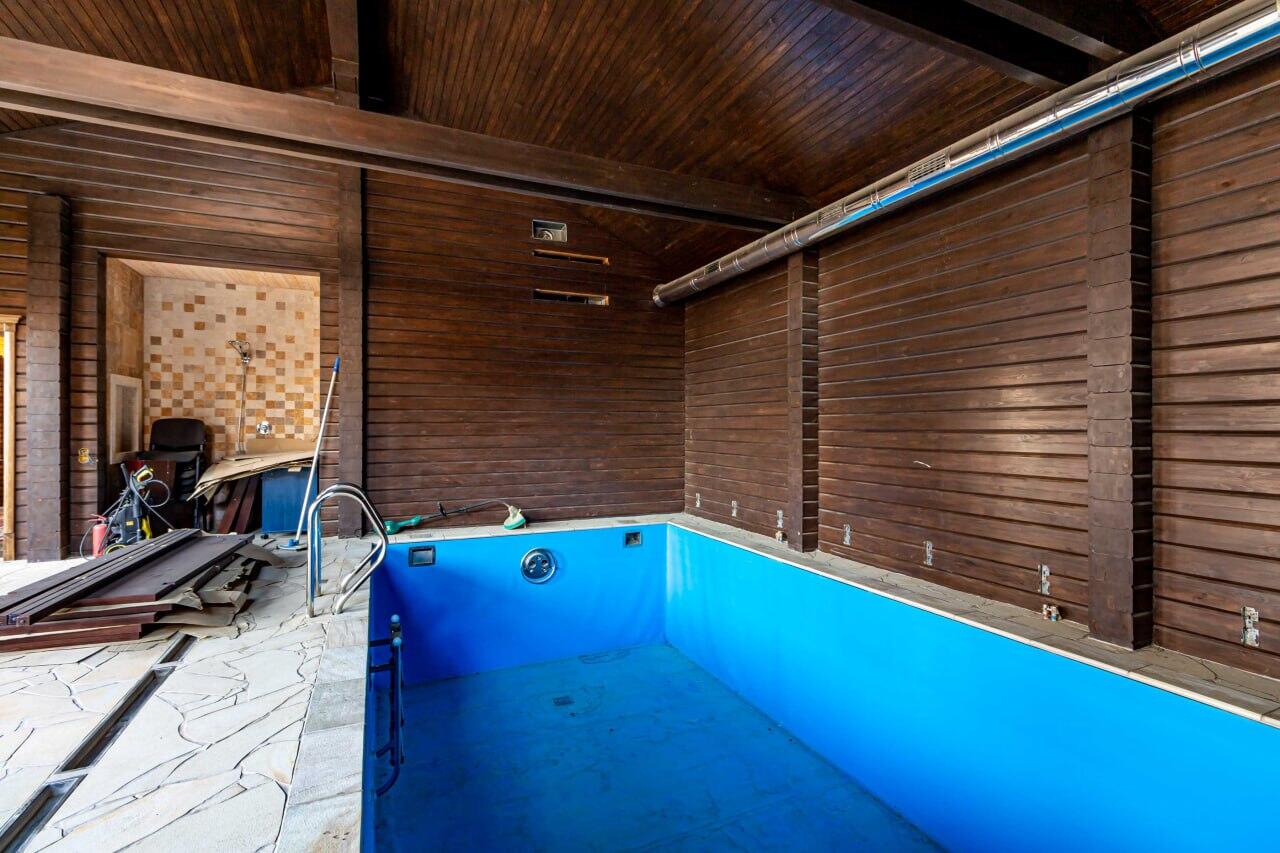 Основной дом включает просторную гостиную на первом этаже, с двухсторонним камином ручной работы из Франции, с гнутым стеклом. Есть отдельная комната для оборудования кабинета. Бассейн с панорамными окнами, водной пушкой, вентиляцией и осушением, отделан натуральным камнем и травертином. Санузел и топочная. На втором этаже расположено две спальни. Одна из которых мастер-спальня с гардеробной, просторным санузлом с джакузи.