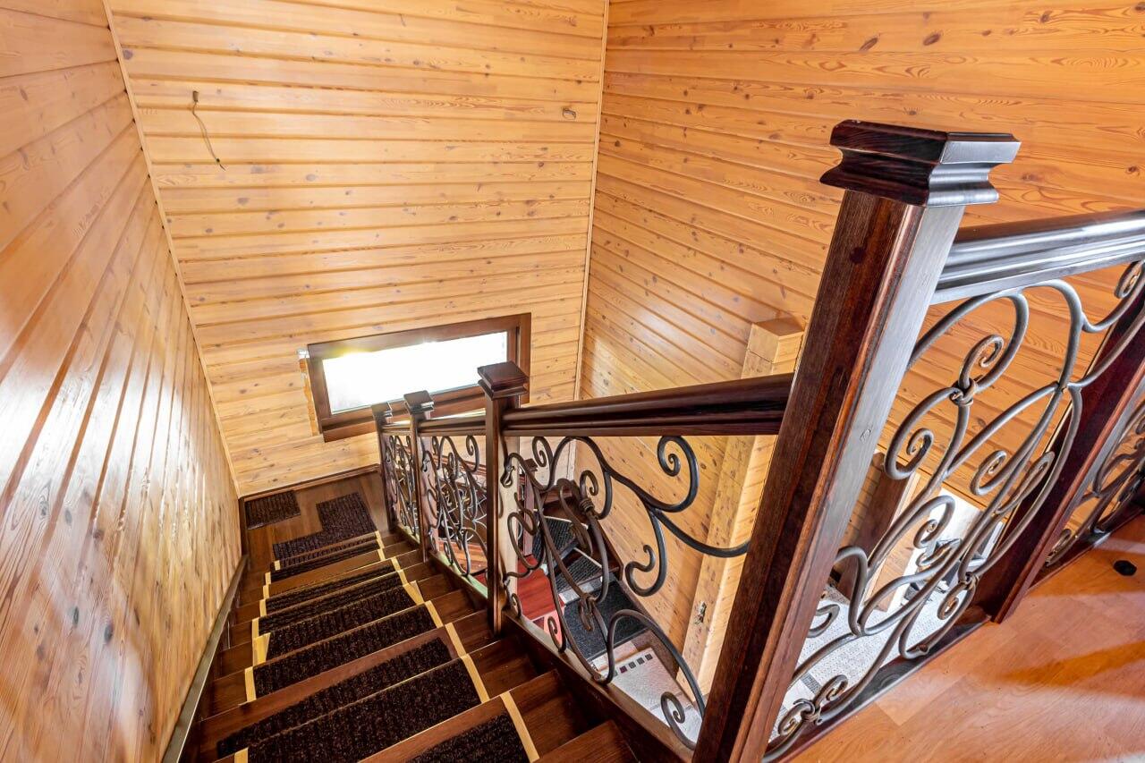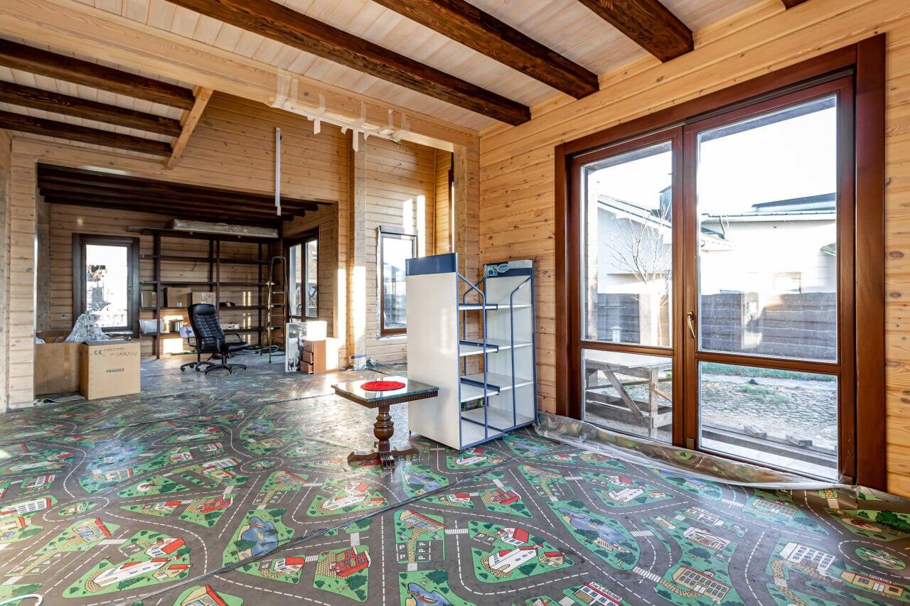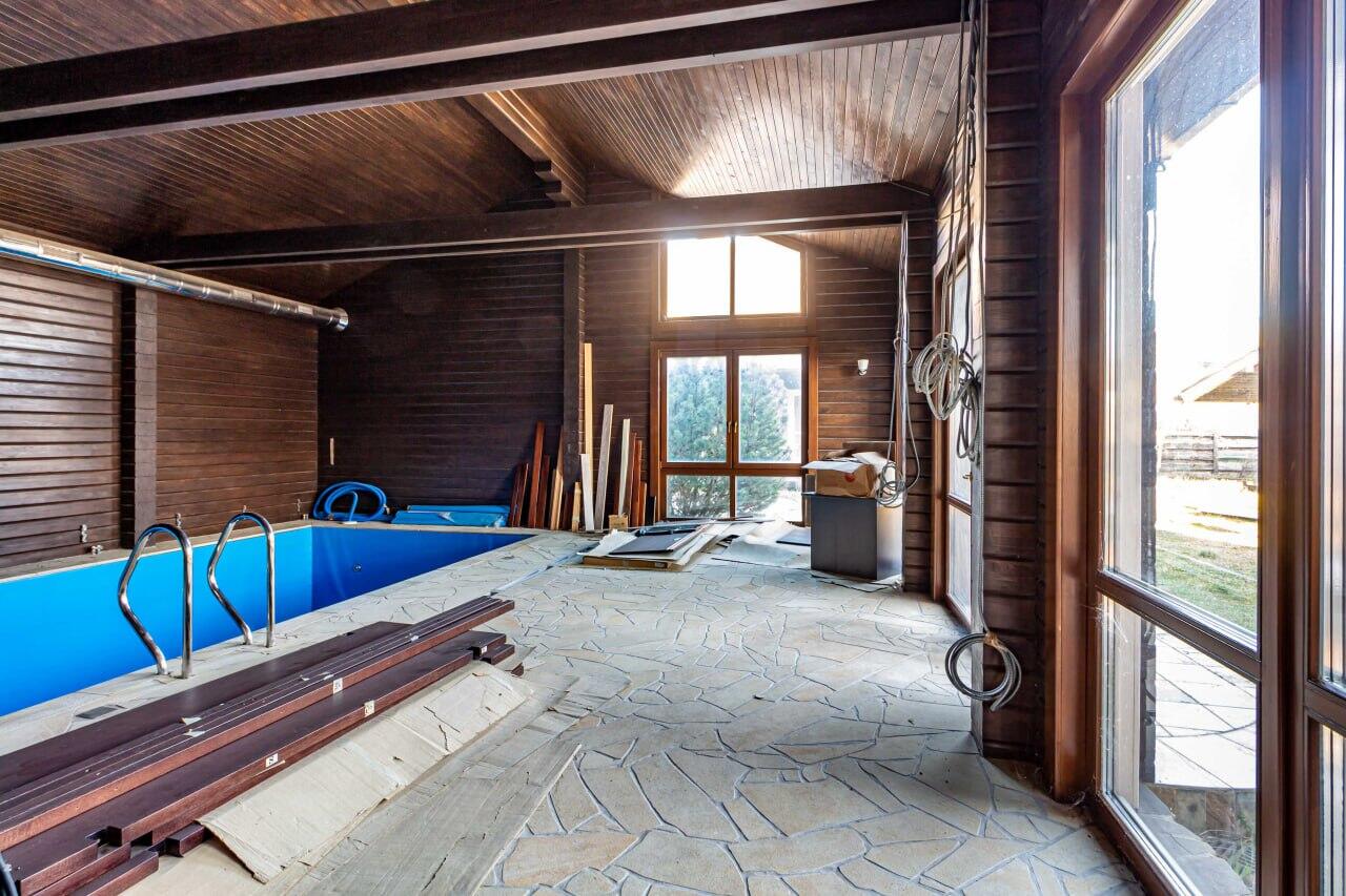 Основной дом включает просторную гостиную на первом этаже, с двухсторонним камином ручной работы из Франции, с гнутым стеклом. Есть отдельная комната для оборудования кабинета. Бассейн с панорамными окнами, водной пушкой, вентиляцией и осушением, отделан натуральным камнем и травертином. Санузел и топочная. На втором этаже расположено две спальни. Одна из которых мастер-спальня с гардеробной, просторным санузлом с джакузи.