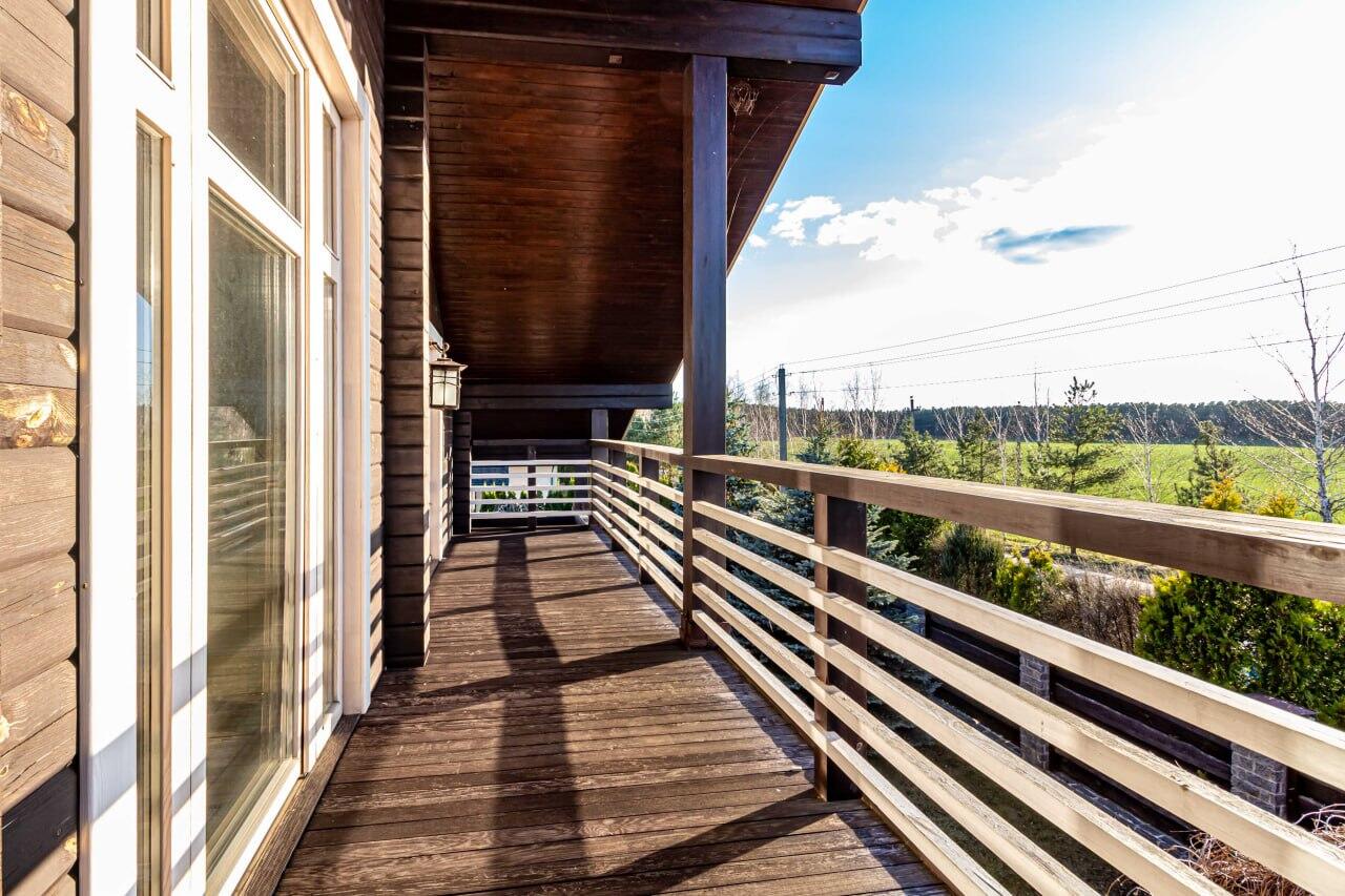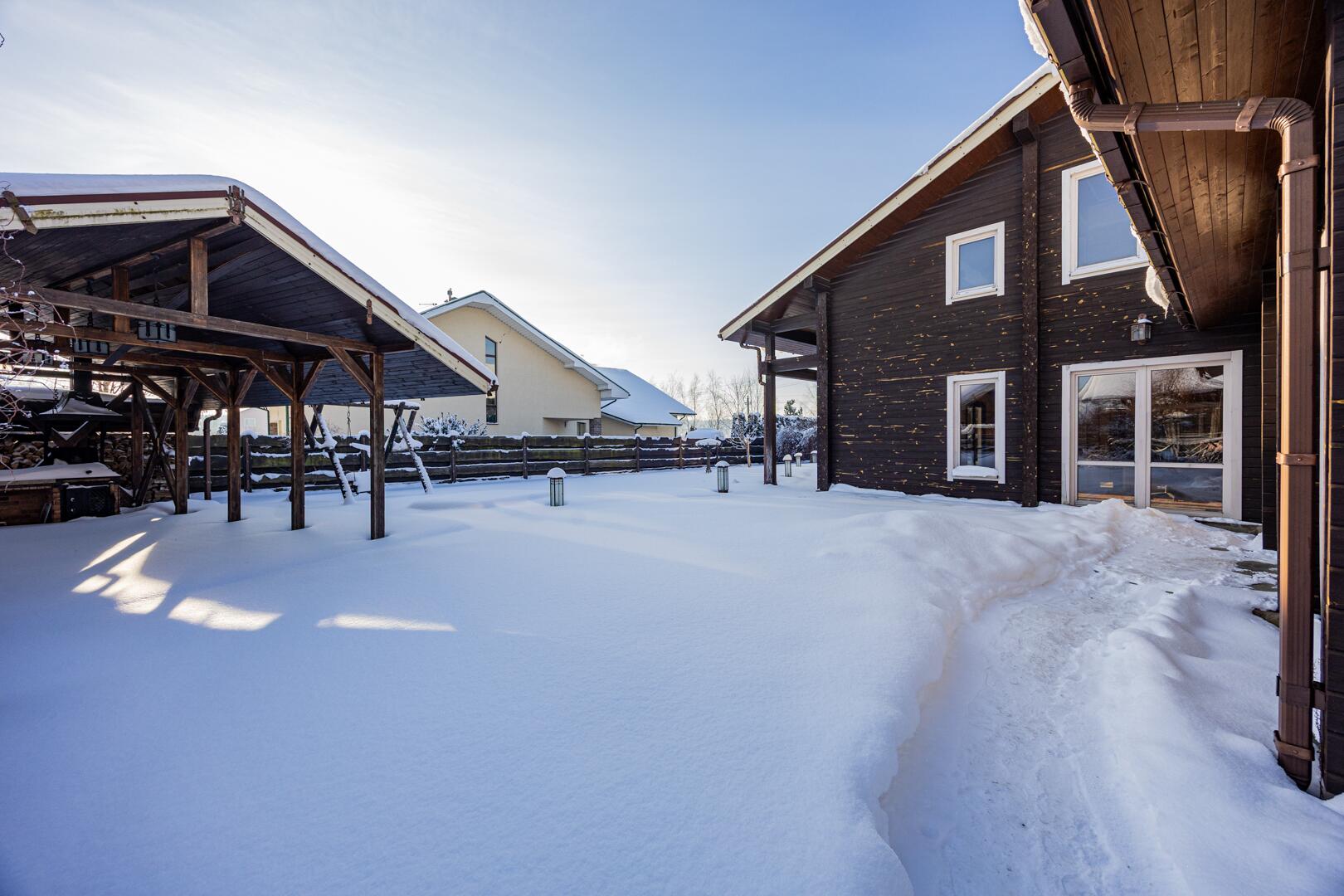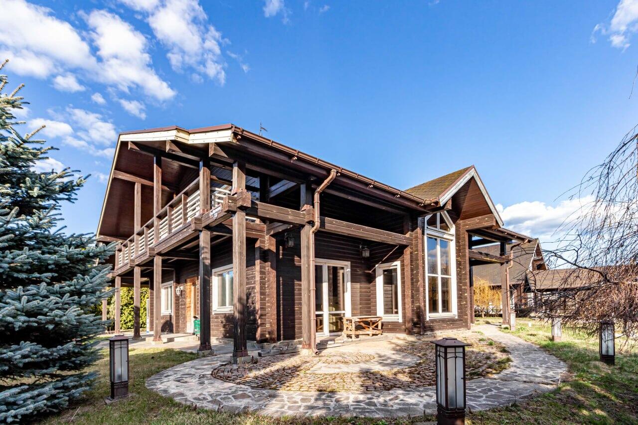 Дома выполнены из клееного бруса премиум-класса от Wooden House. Натуральная фактура дерева с искусственно состареными балками (техника браширования) и гибкой черепицей, создают образ аутентичного европейского поместья. По всему дому установлены панорамные 3х камерные стеклопакеты. Участок окружён забором из гранита, ковки и дерева. Установлены автоматические ворота. Ландшафтный дизайн дополнен дизайнерским фонтаном, зоной барбекю с мраморной столешницей и водоснабжением. Газон защищён от кротов, автополив TORO обеспечивает идеальный уход, а ливневая система с элементами ковки решает проблему отвода воды.