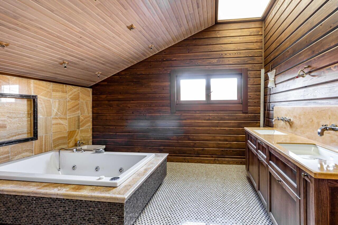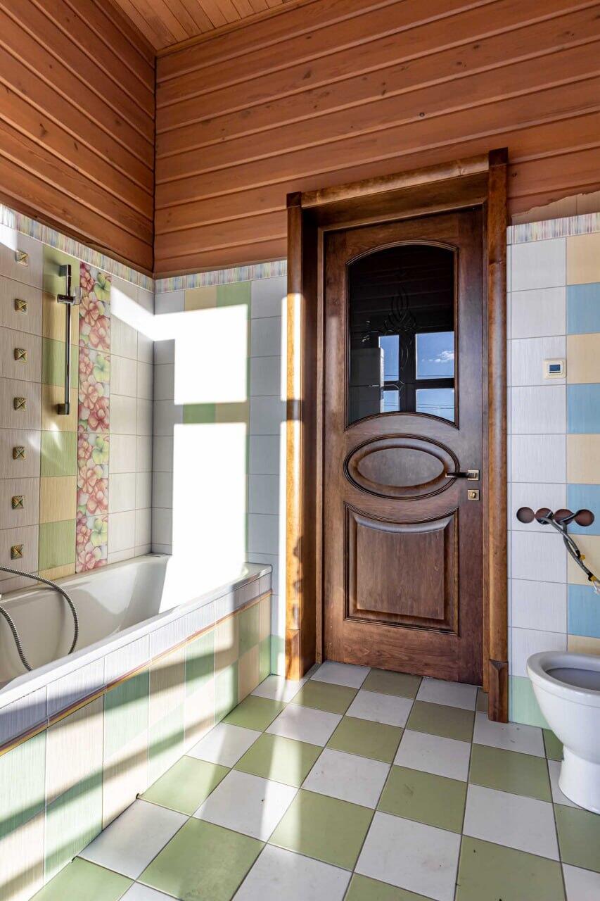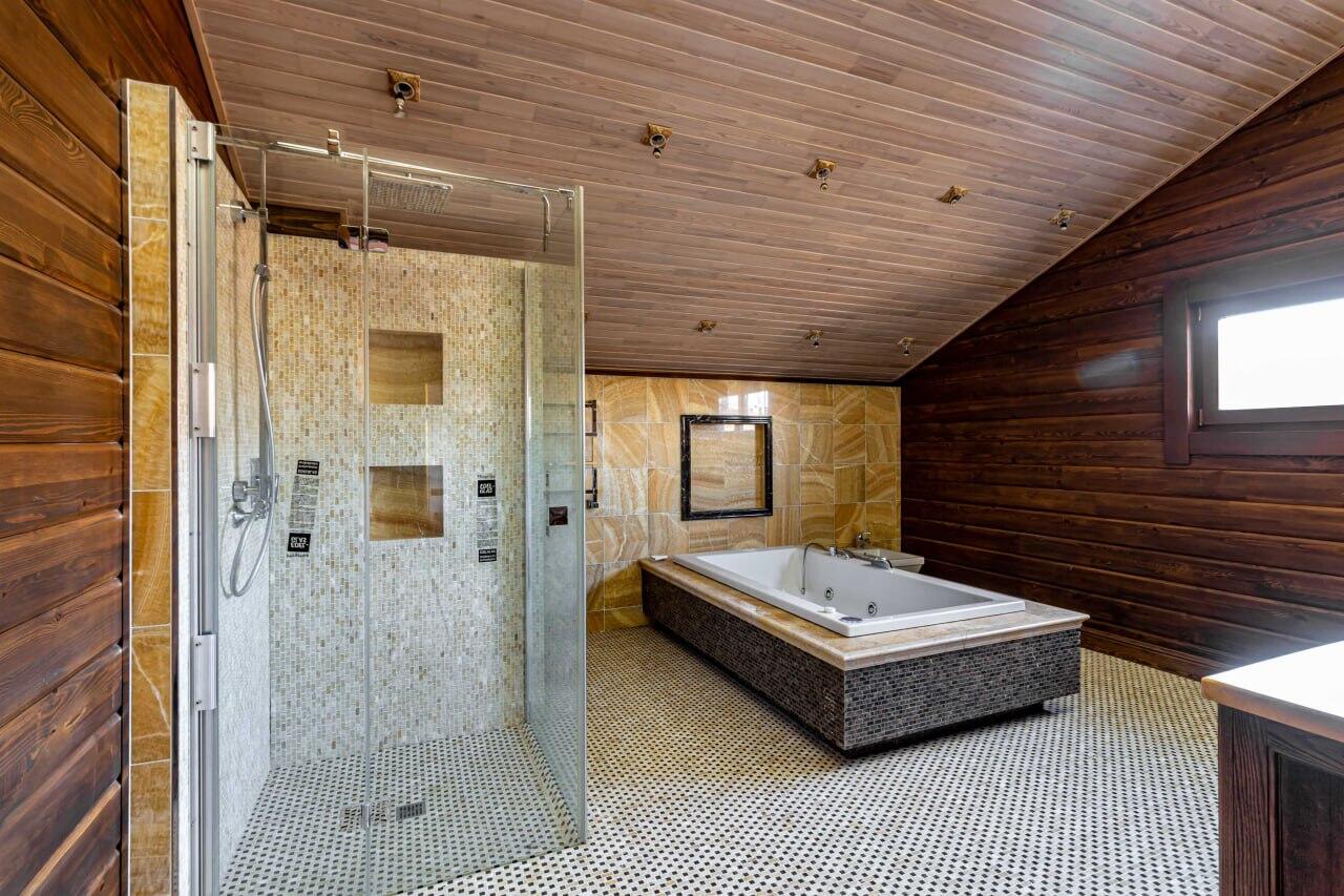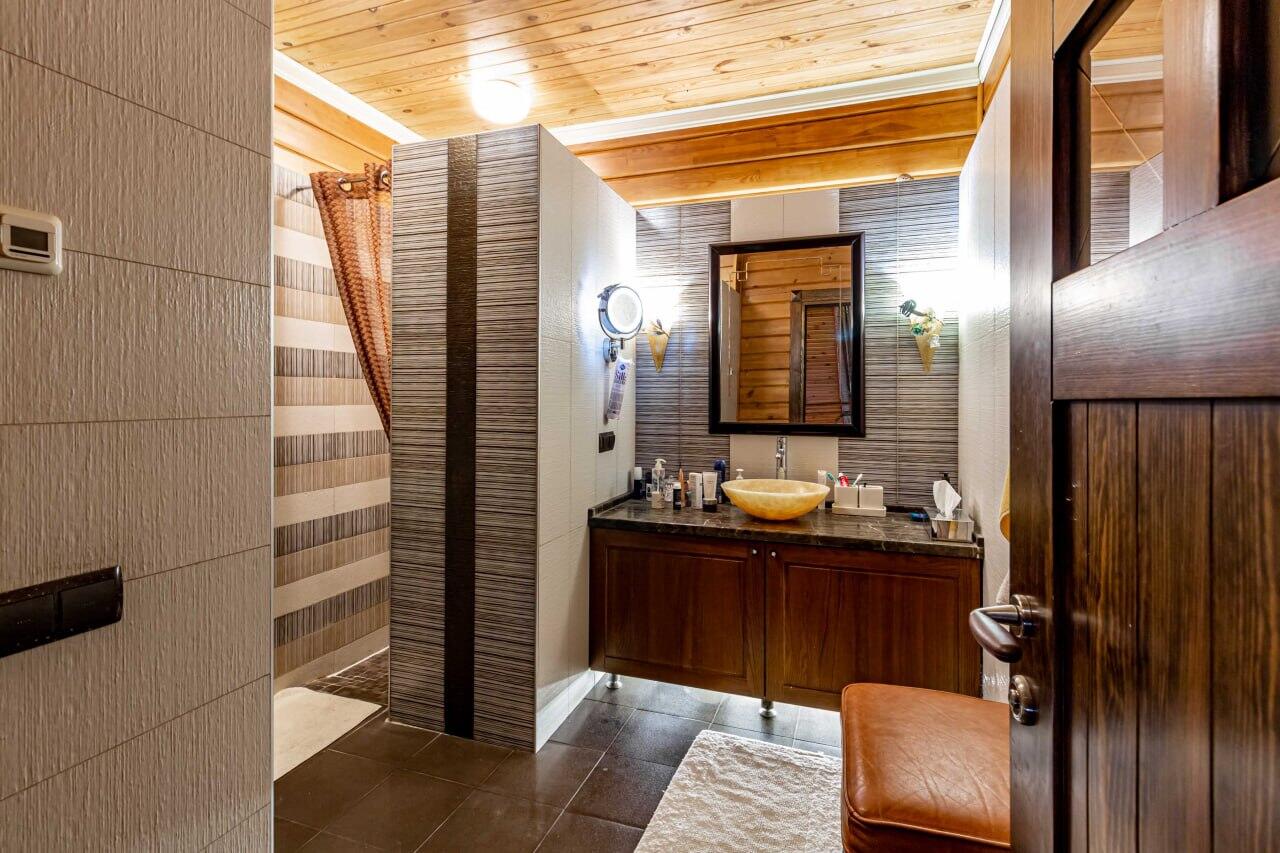 - Санузлы: основная ванная с немецкой джакузи и душевой, отделка ониксом (Италия); детская — с итальянской плиткой, муранским стеклом и ручной росписью.