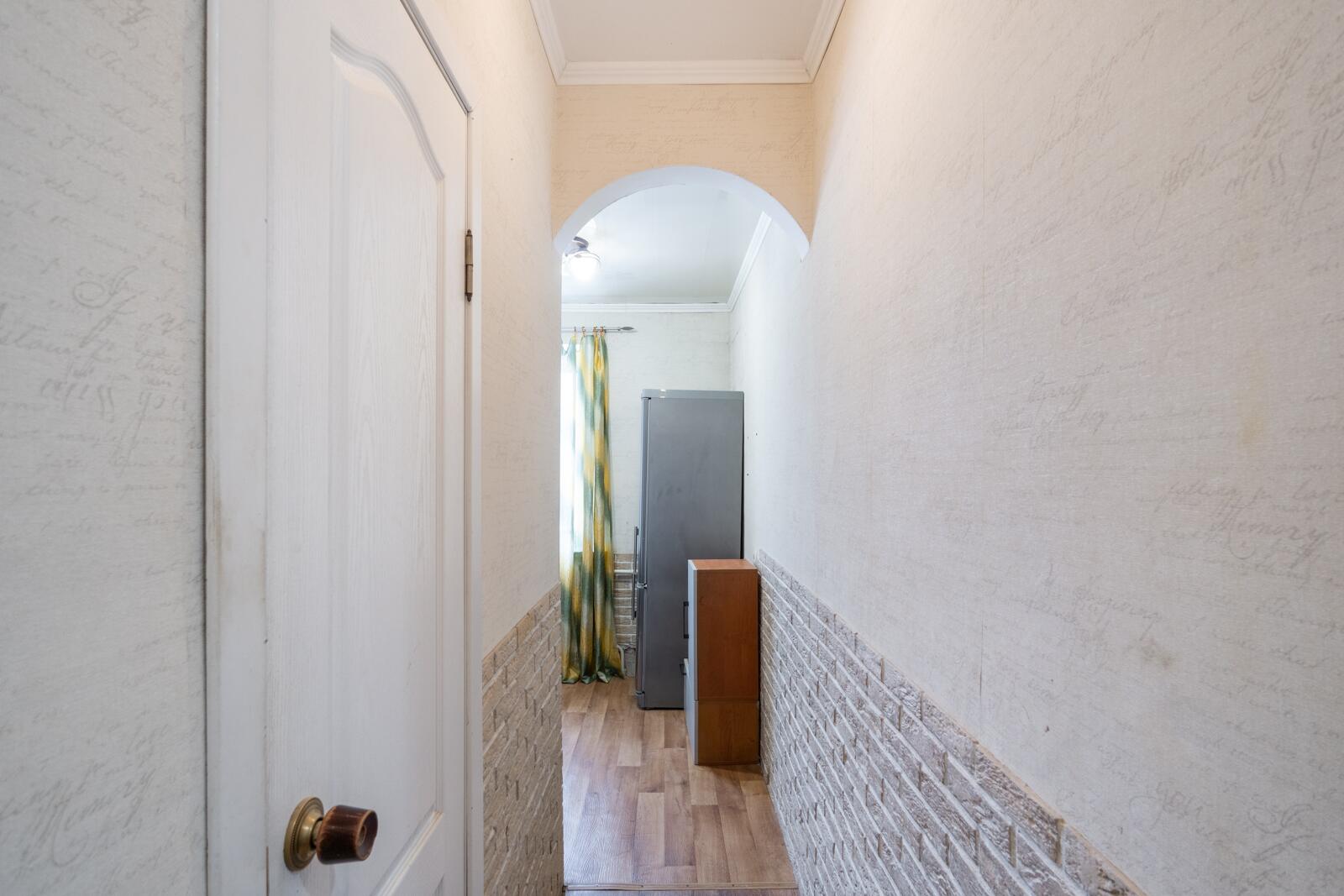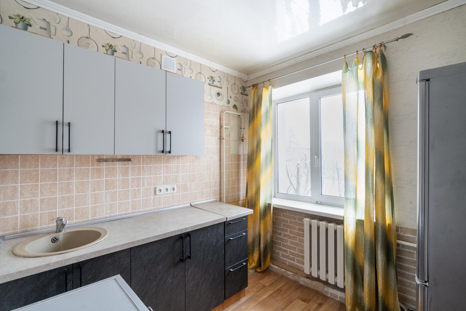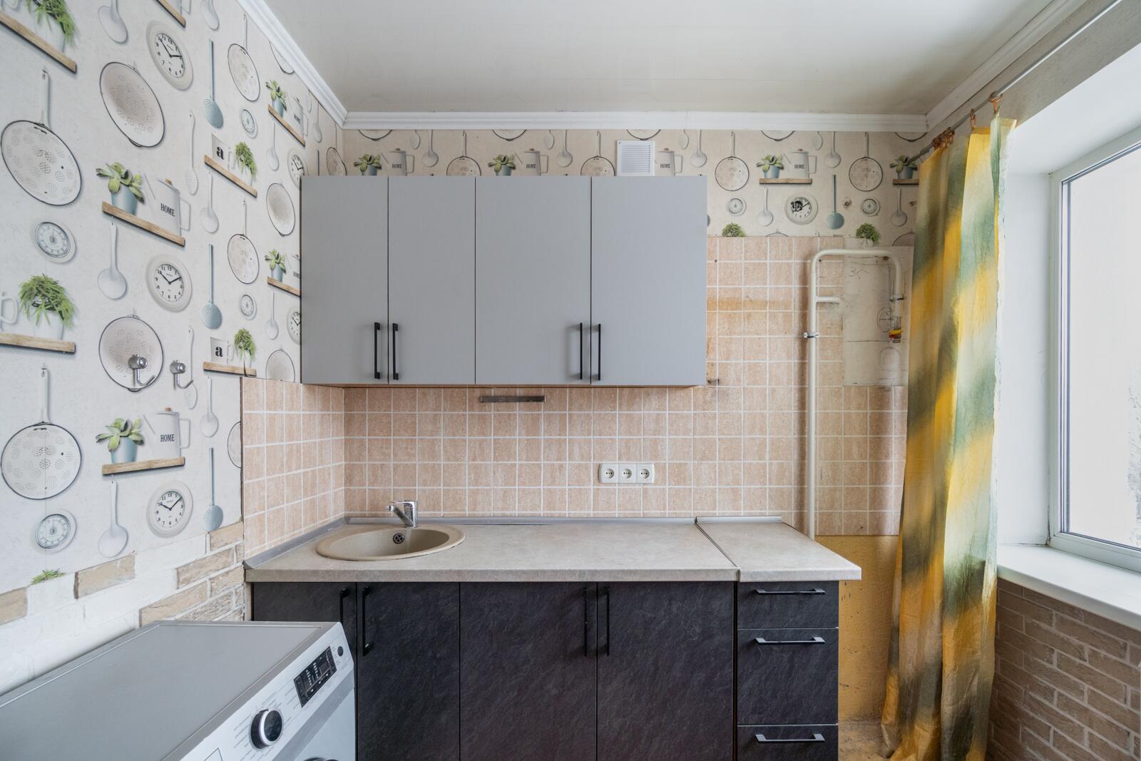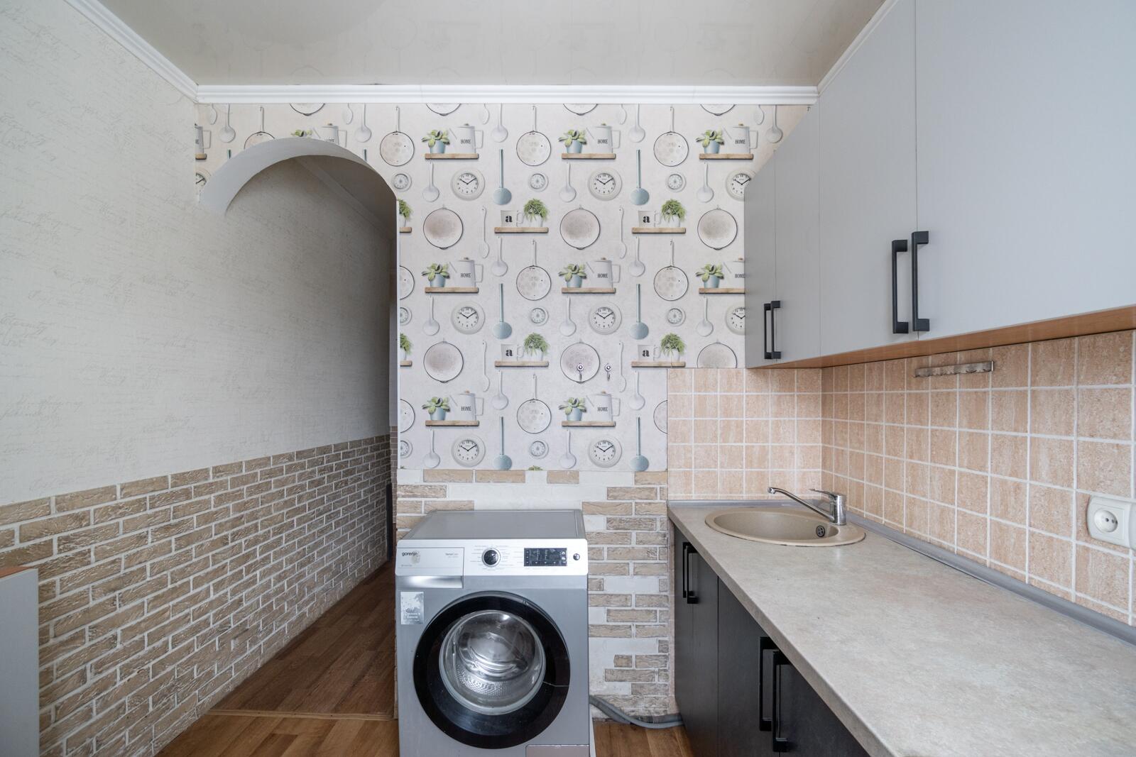 Оборудована кухонным гарнитуром, холодильником и стиральной машиной.При желании можно обновить интерьер или рассмотреть варианты перепланировки для более современного пространства.