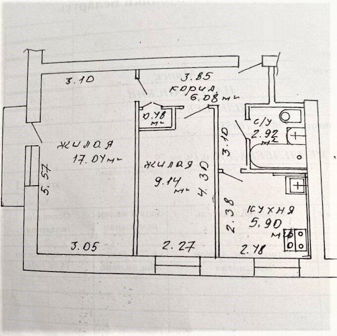 Общая площадь (СНБ): 42,36 м2Жилые комнаты: 17,04 м2 и 9,14 м2Кухня: 5,9 м2