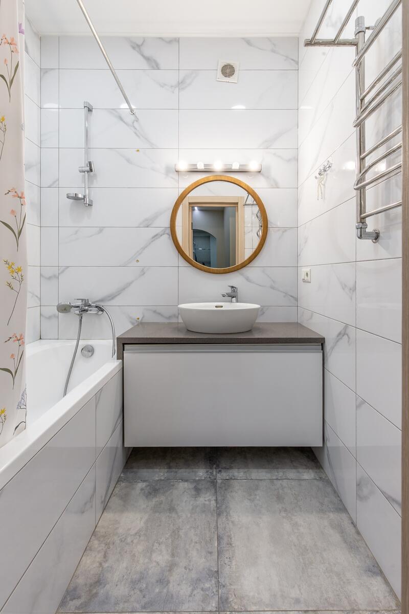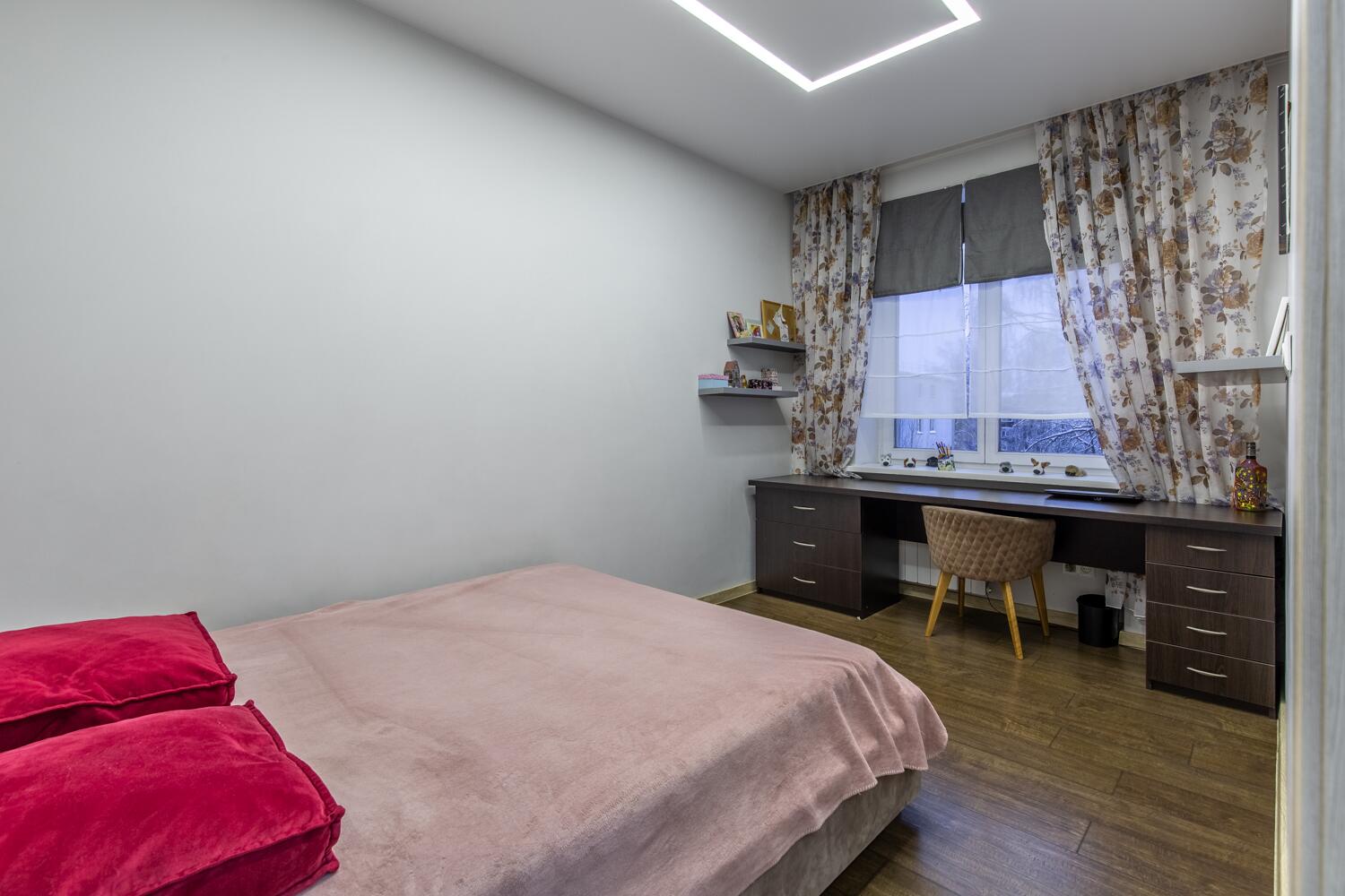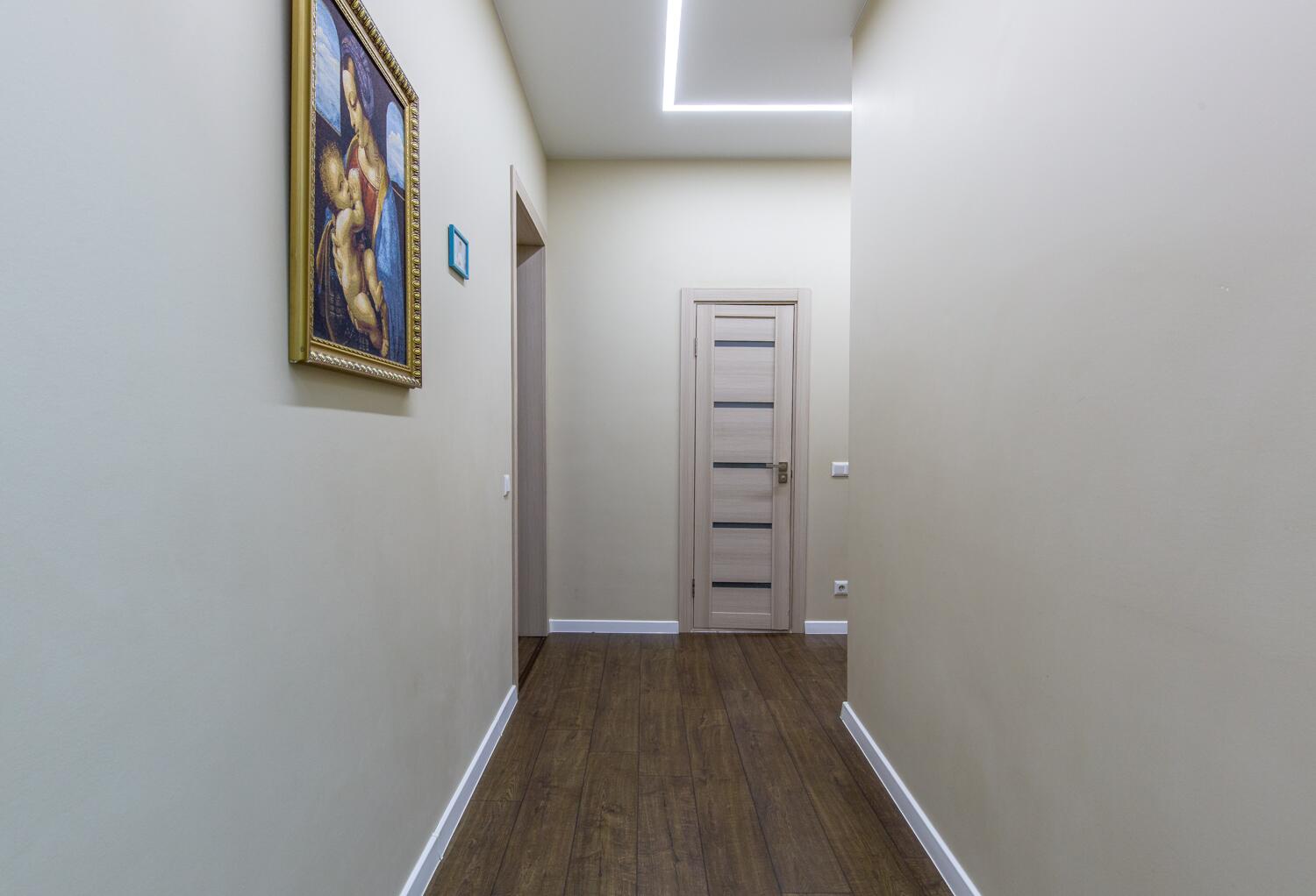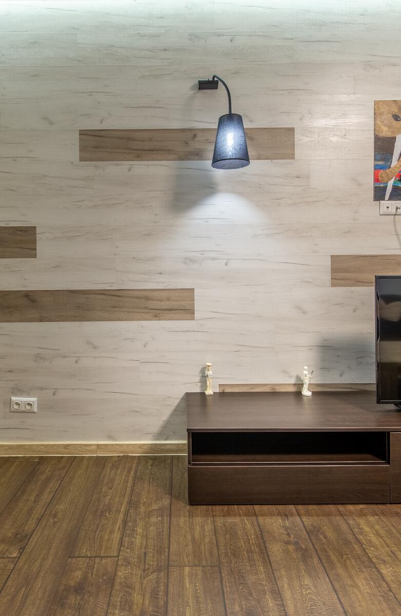 Ремонт выполнен в нейтральных теплых тонах.