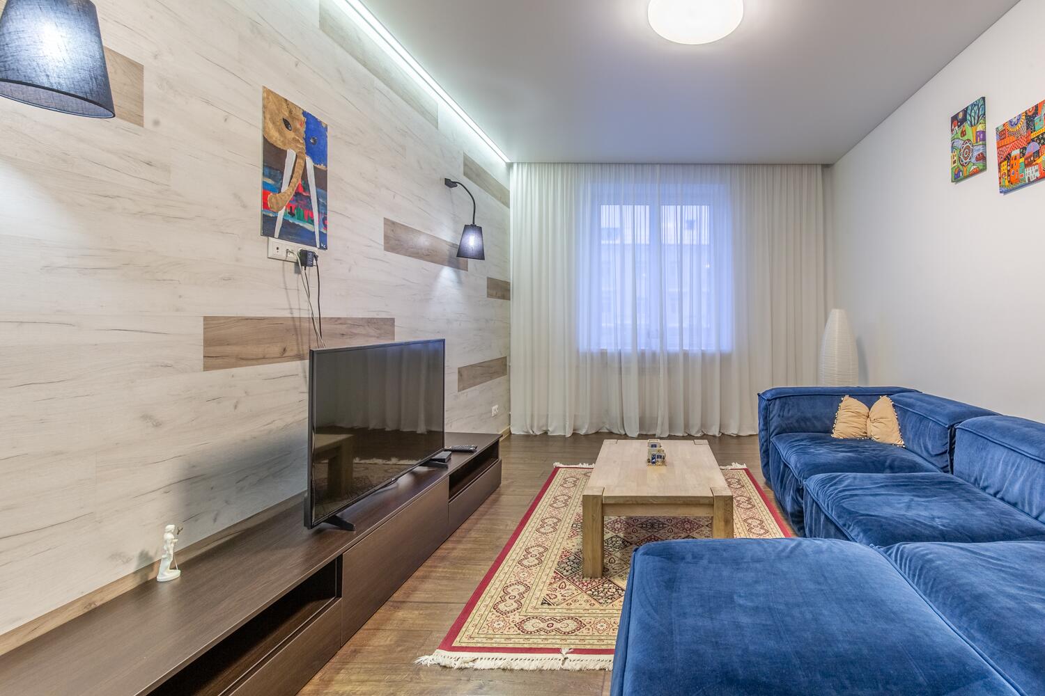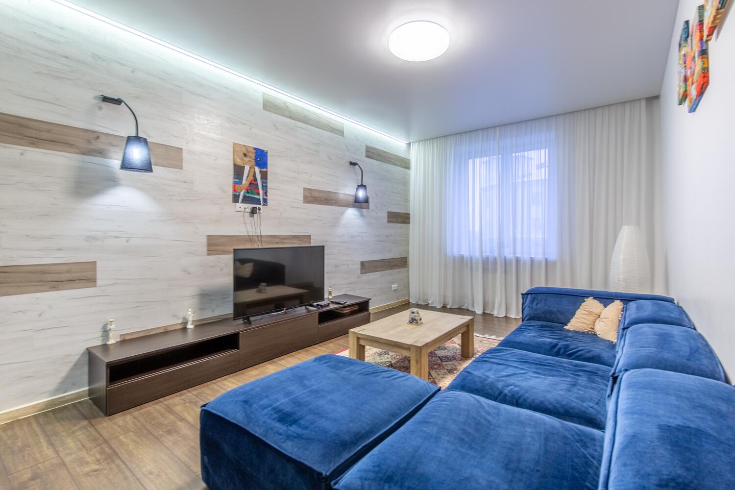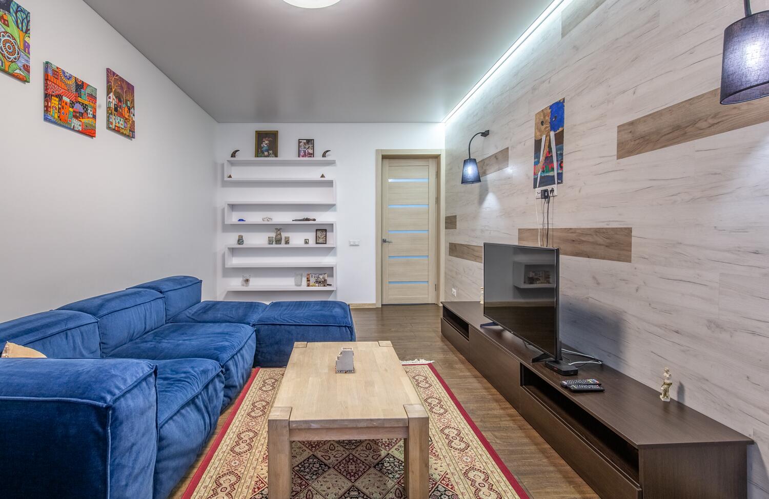Преимуществом квартиры являются потолки высотой 2.9 метра.В отделке использовались материалы европейских производителей. На полу во всей квартире уложен одинаковый ламинат. В санузлах и прихожей - плитка из керамогранита. Кухня и мебель для спальни и комнат, изготавливались под заказ. Кухня оснащена всем необходимым. Во всей квартире установлены стеклопакеты. Батареи с терморегуляцией.