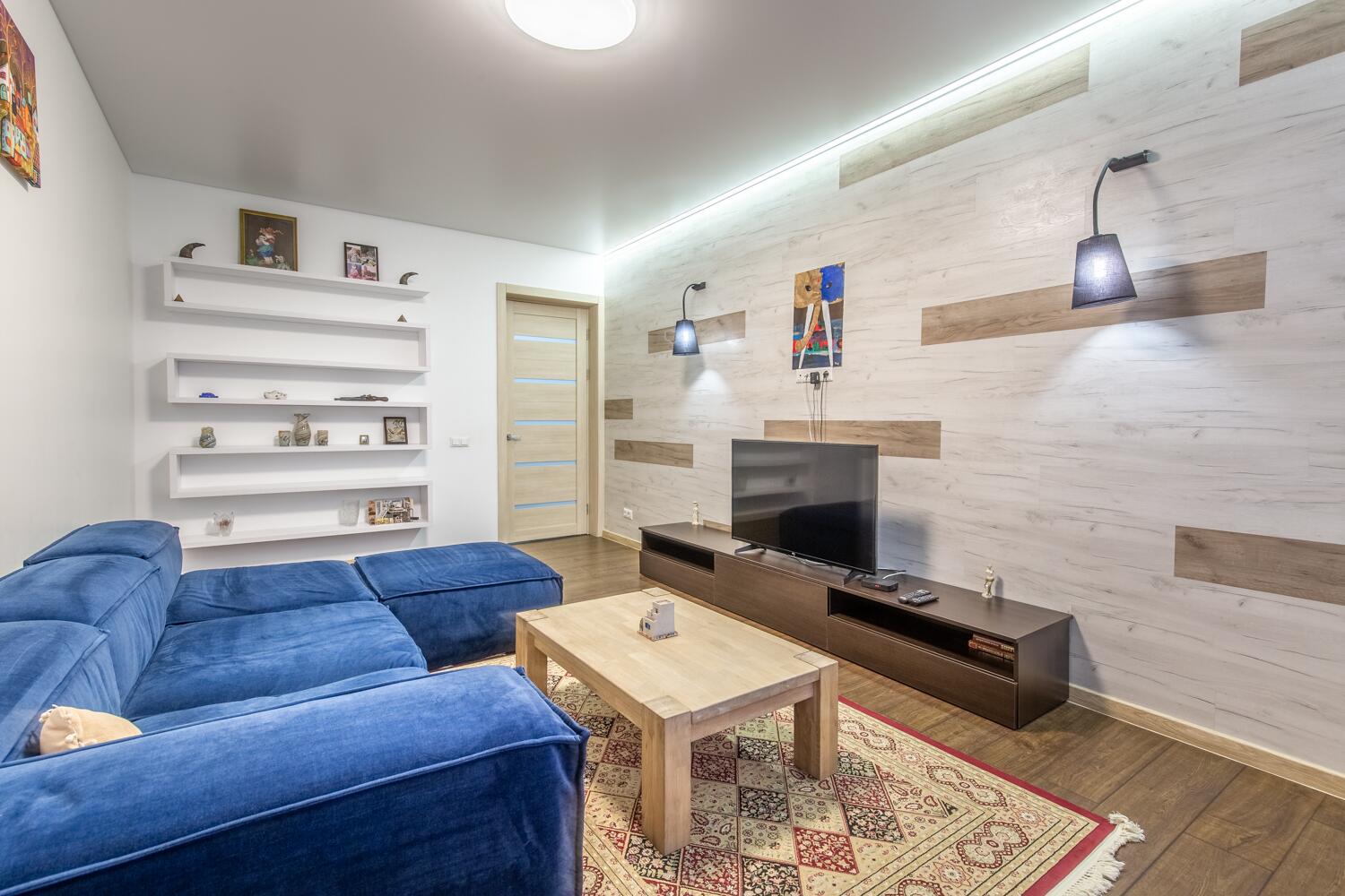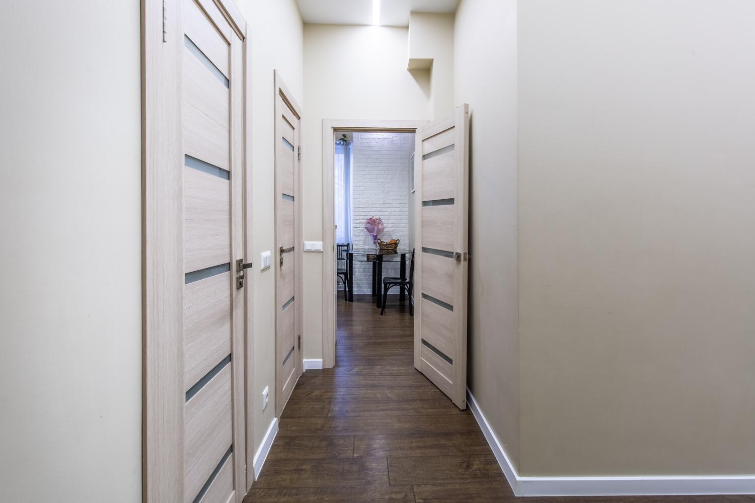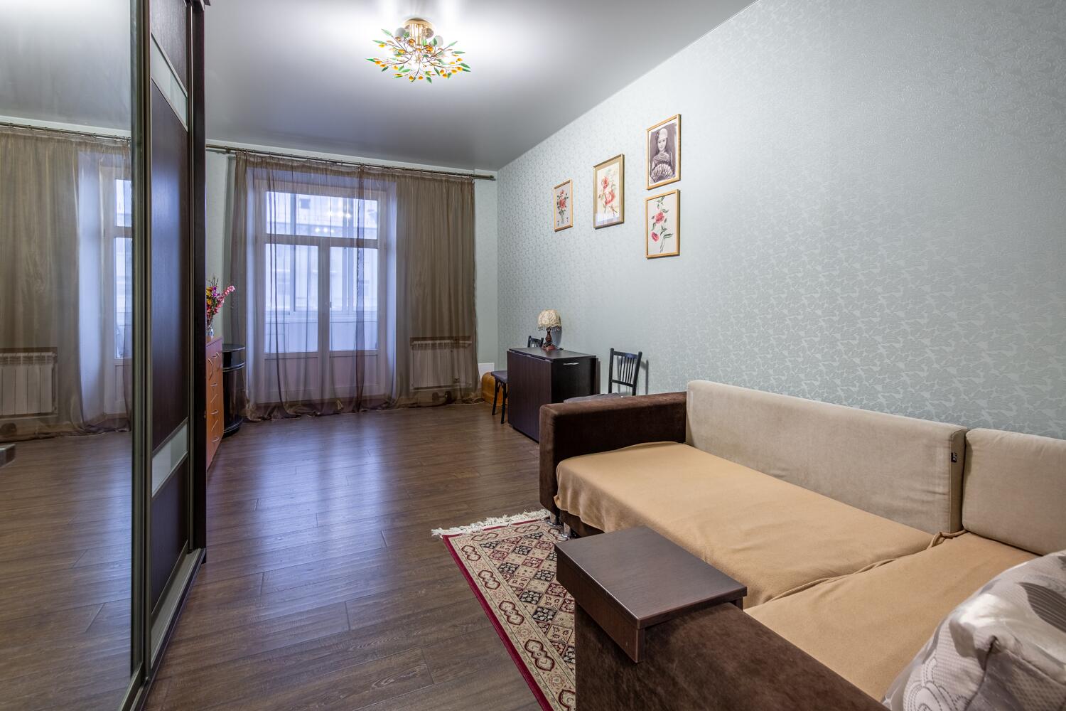 Преимуществом квартиры являются потолки высотой 2.9 метра.В отделке использовались материалы европейских производителей. На полу во всей квартире уложен одинаковый ламинат. В санузлах и прихожей - плитка из керамогранита. Кухня и мебель для спальни и комнат, изготавливались под заказ. Кухня оснащена всем необходимым. Во всей квартире установлены стеклопакеты. Батареи с терморегуляцией.