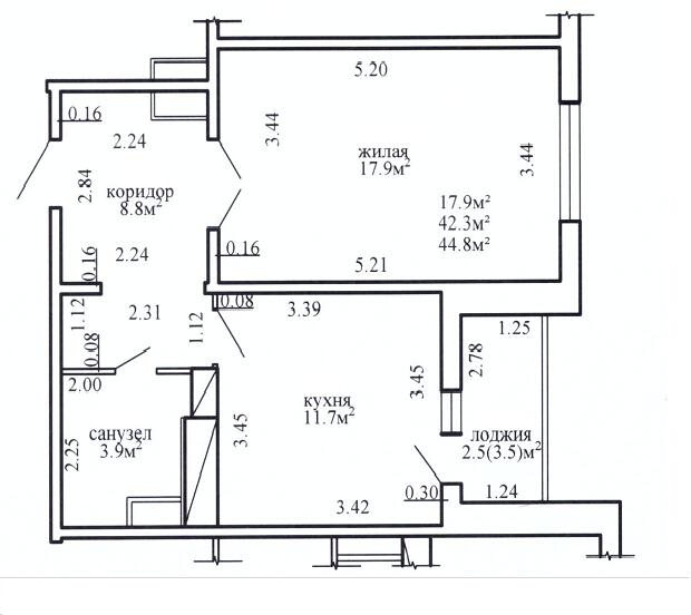 В квартире расположены – жилая комната площадью 17,9 м.кв., большая кухня площадью 11,7 м.кв., совмещённый санузел площадью 3,9 м.кв., коридор площадью 8,8 м.кв. и лоджия площадью 3,5 м.кв. Высота помещений – 2,66 м.