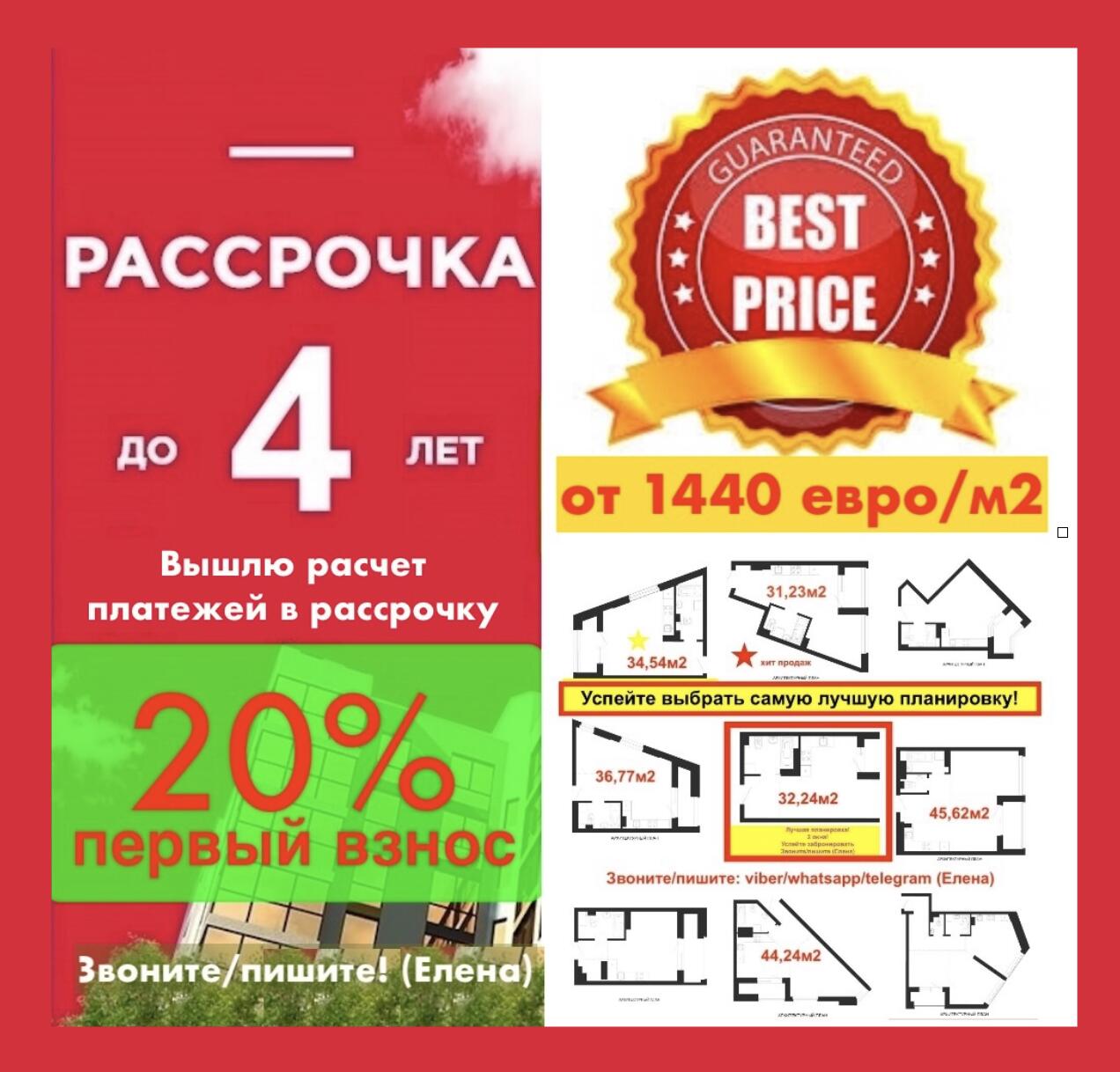 ПОСЛЕДНИЕ студии! От 1440/м2! 20% первый взнос! Рассрочка до 4 лет! Звоните/пишите (Елена)