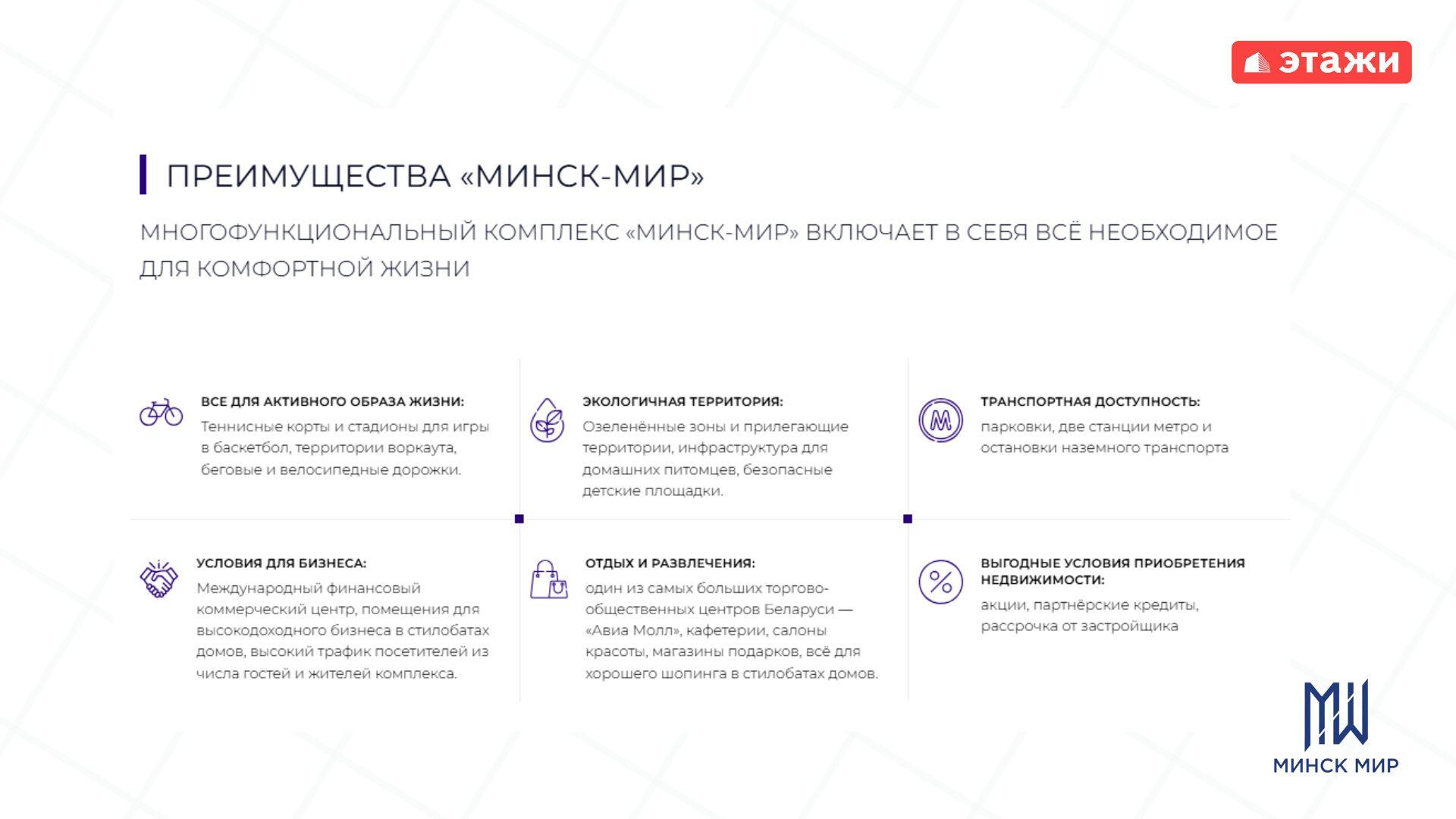 1. Можно заселиться, приобретя апартаменты, зарегистрироваться по месту жительства, а затем, если у вас возникнет желание, произвести регистрацию юридического лица любой формы собственности и открыть свое дело в «Минск-Мире» – одной из выгодных бизнес-локаций.