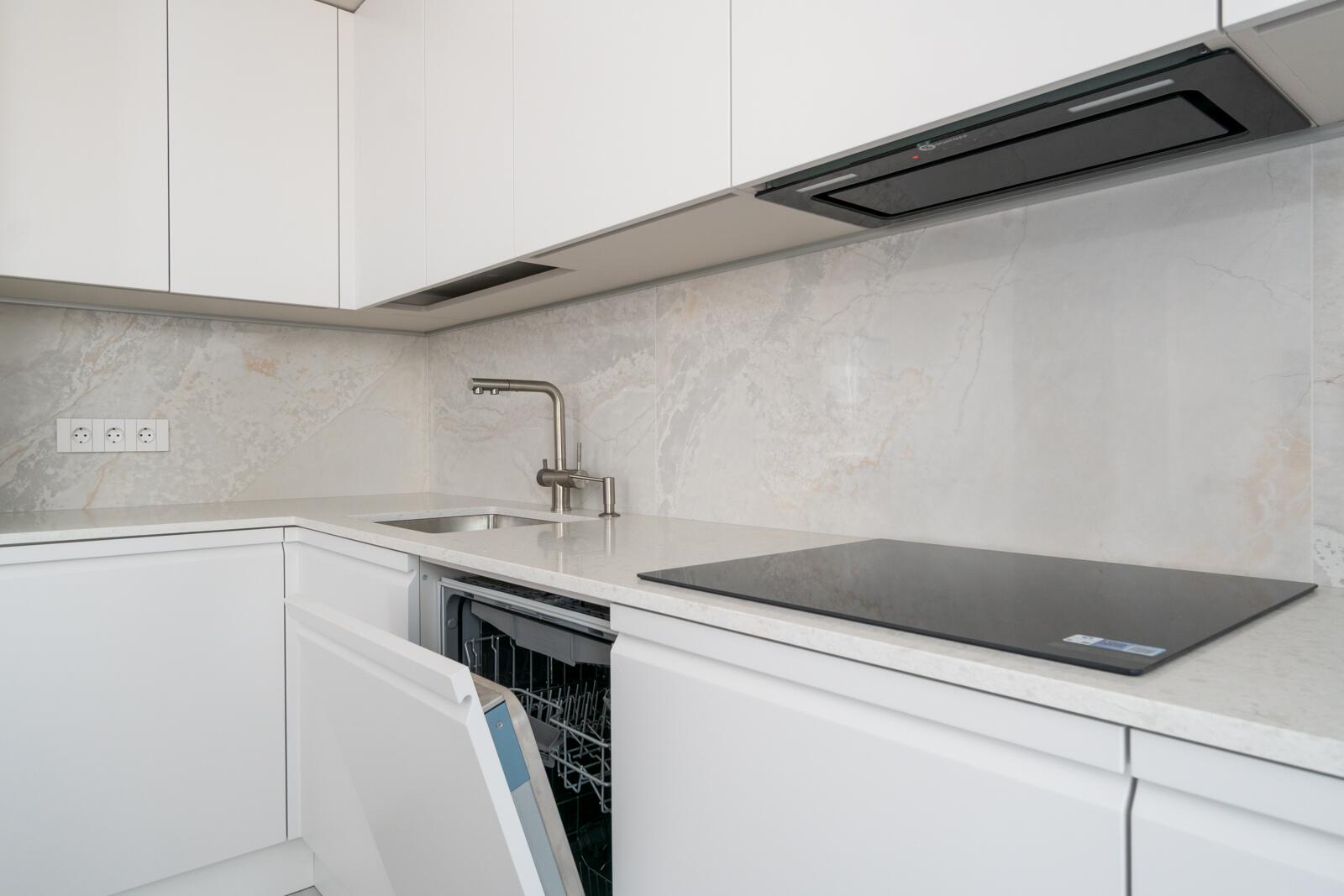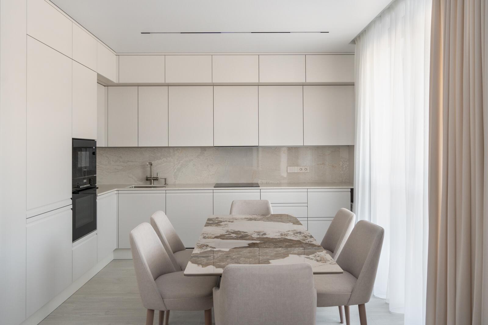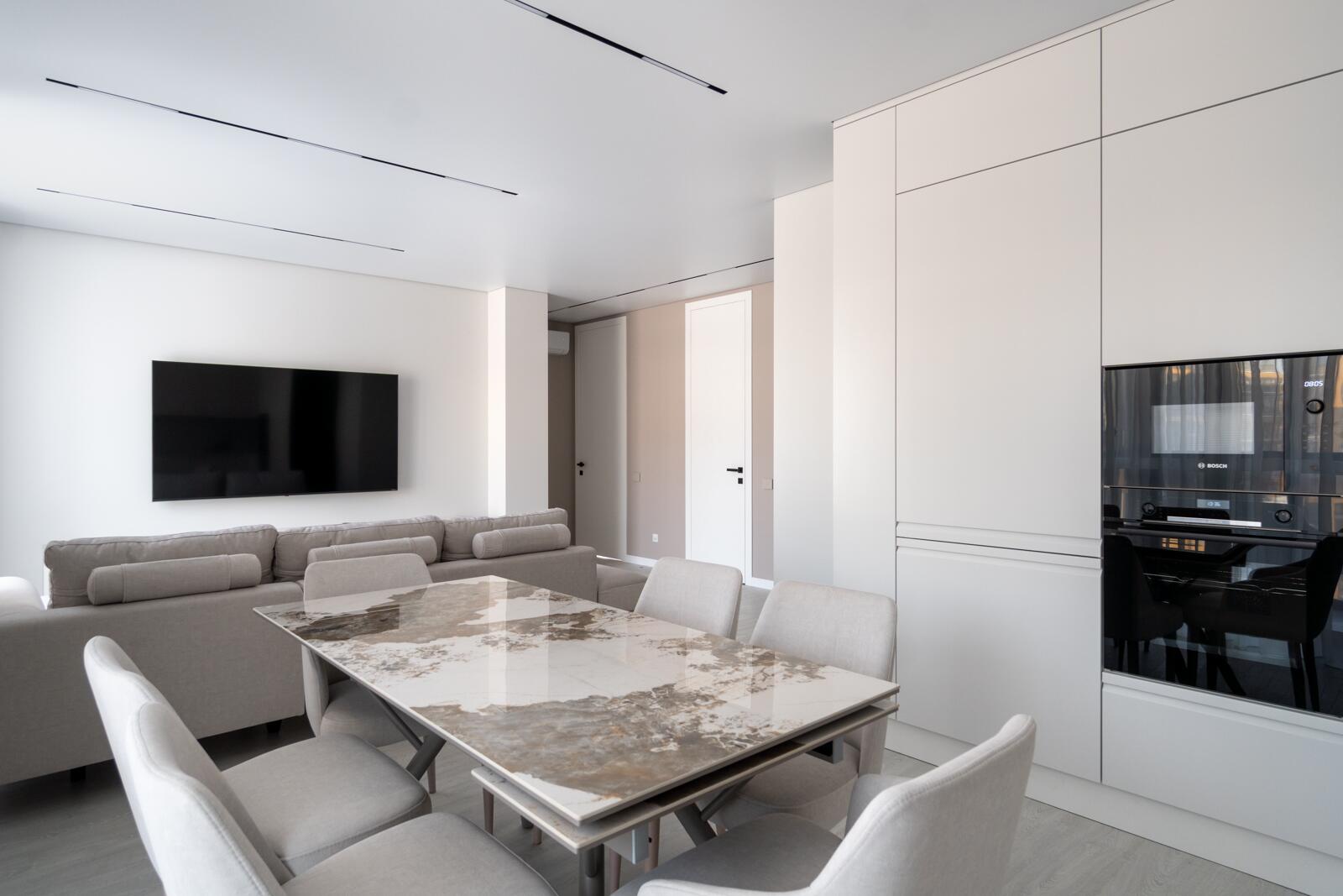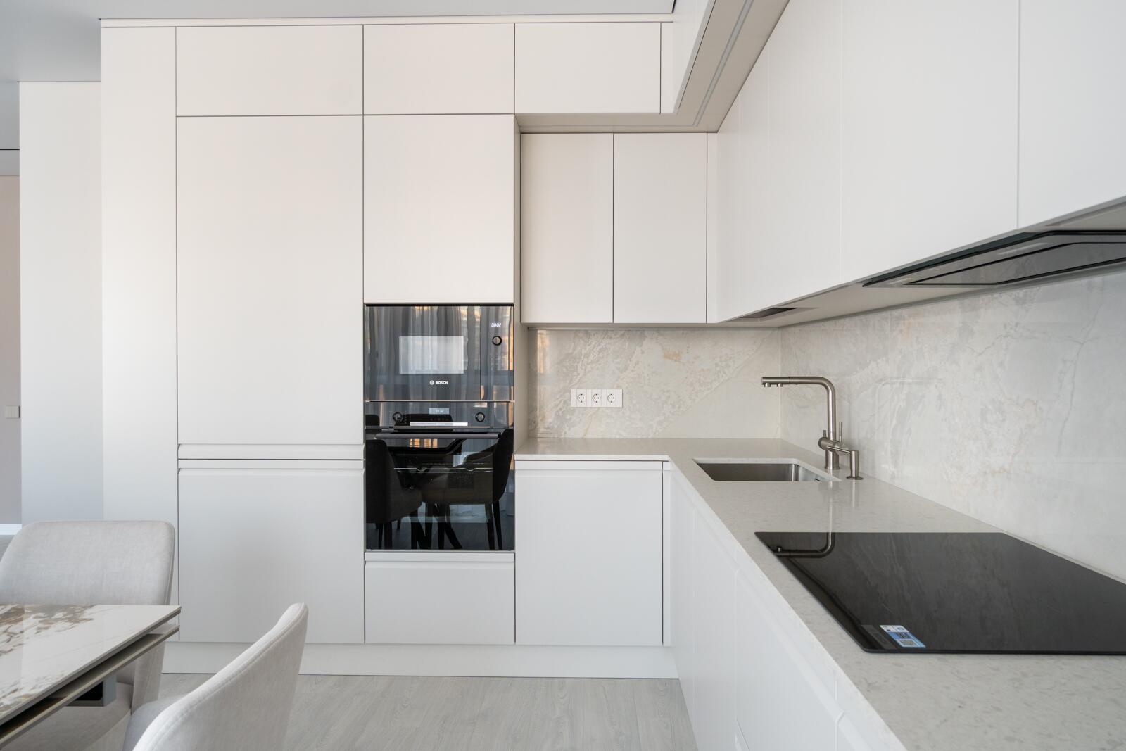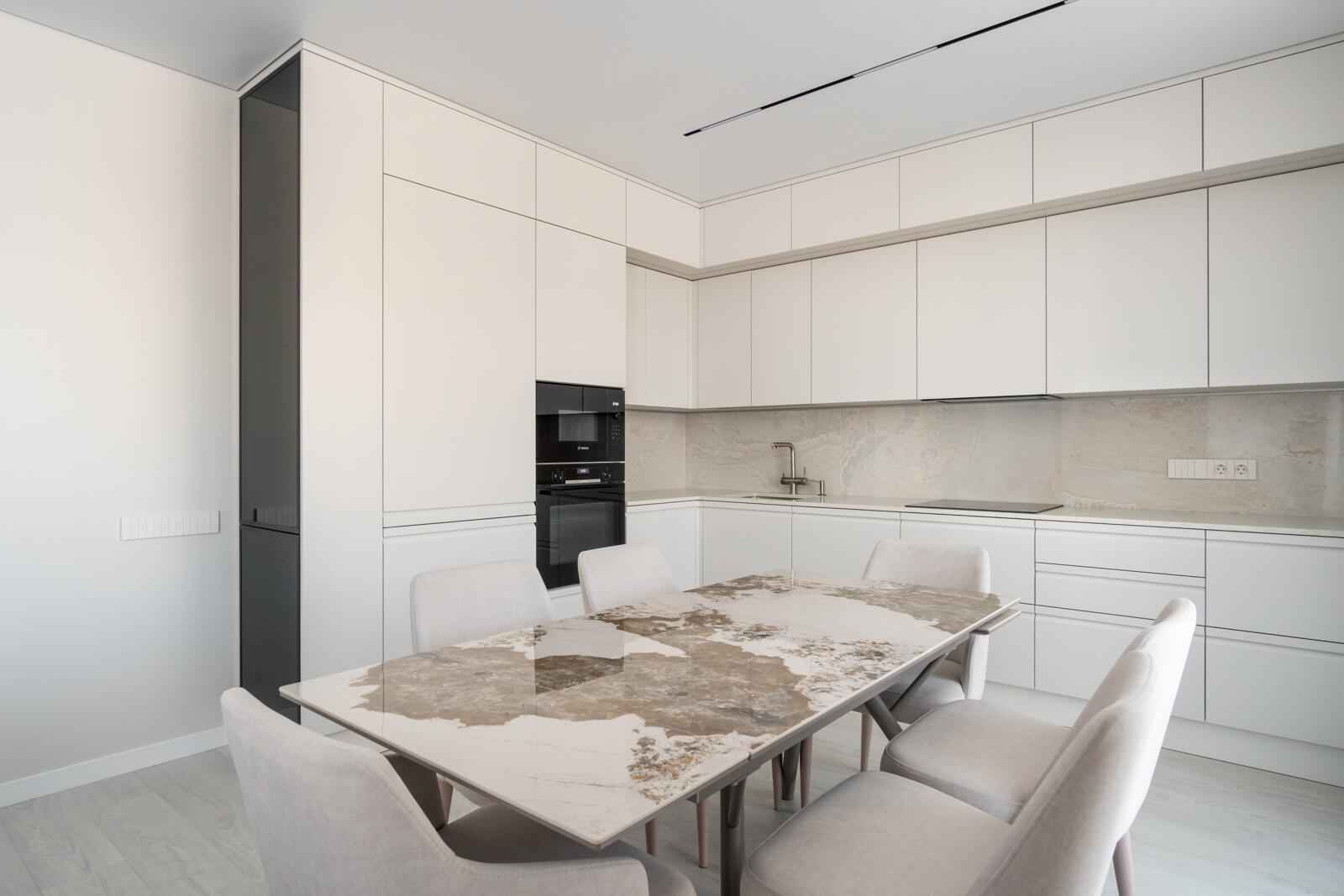 Кухня и корпусная мебель выполнены на заказ, использована фурнитура Blum и качественные фасады. Установлена дорогая техника европейского производства, включая холодильник шириной 75 см и посудомоечную машину 60 см.