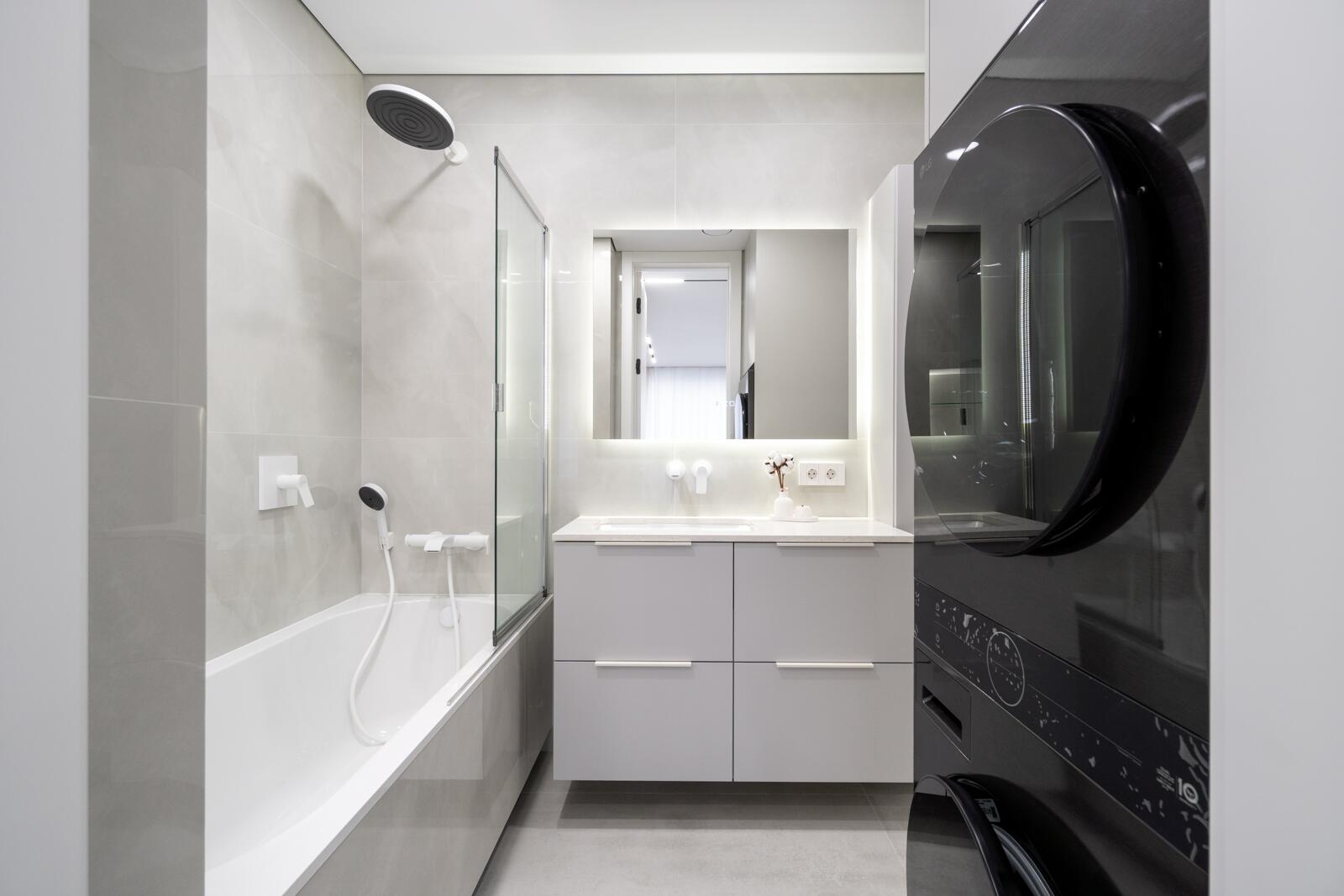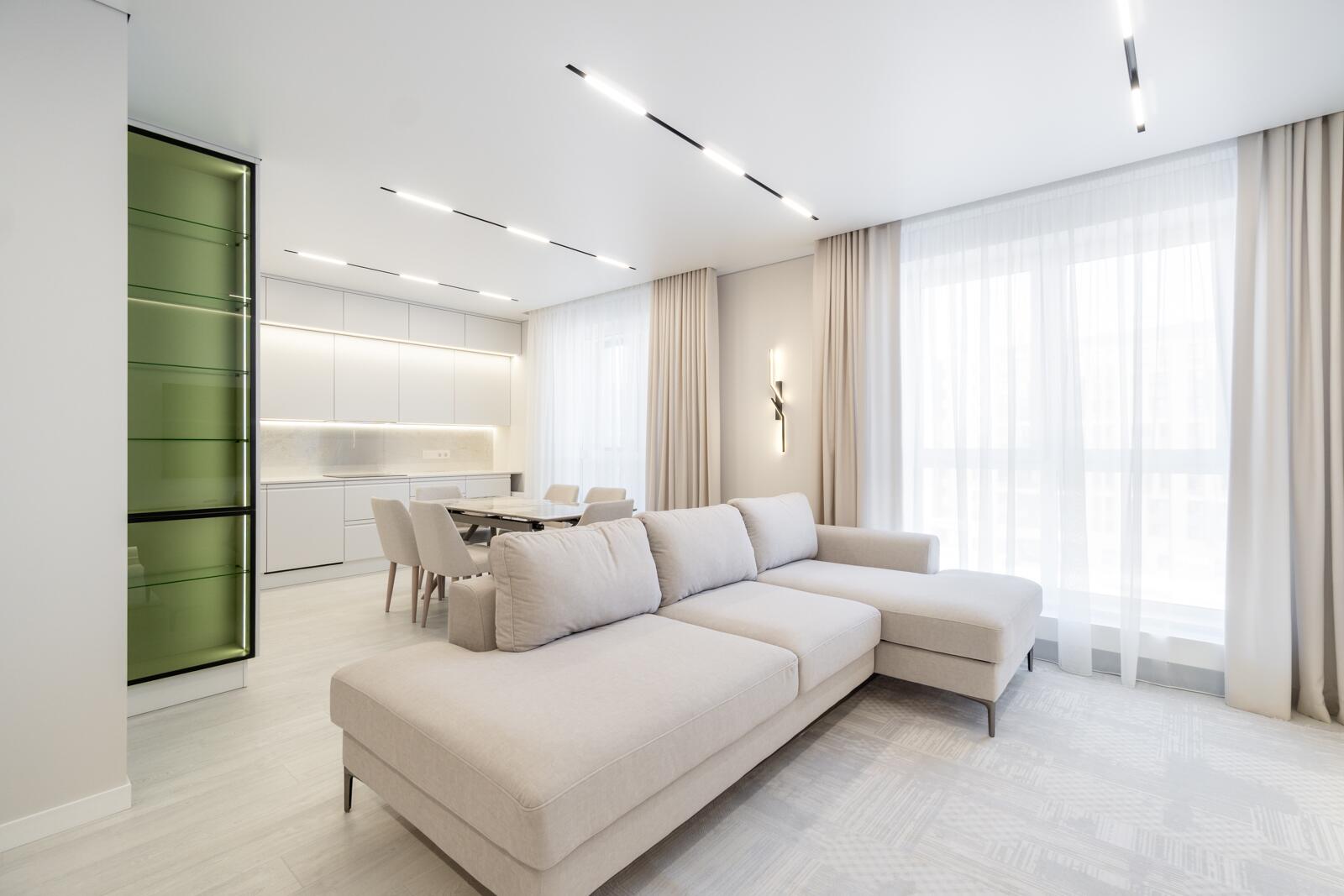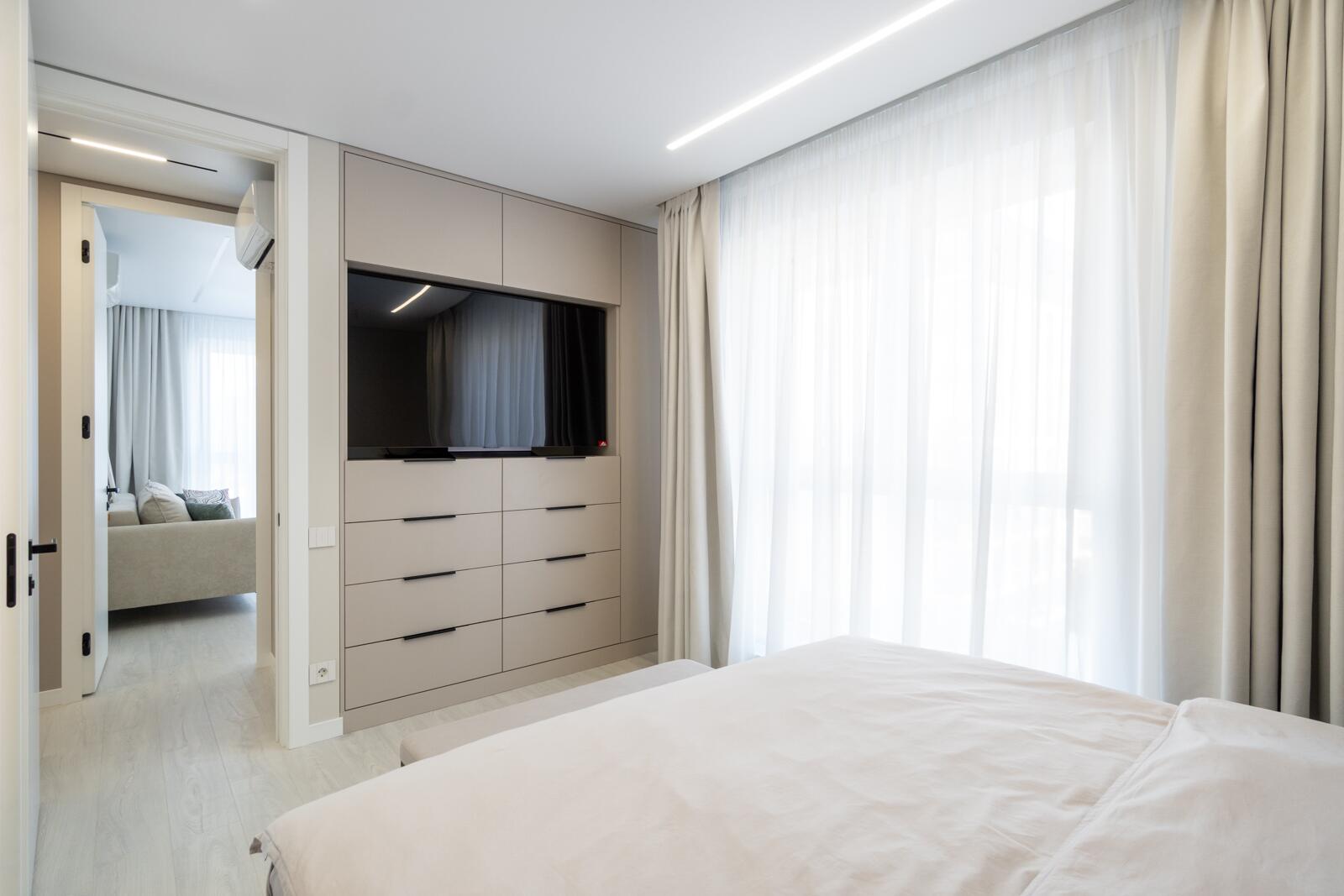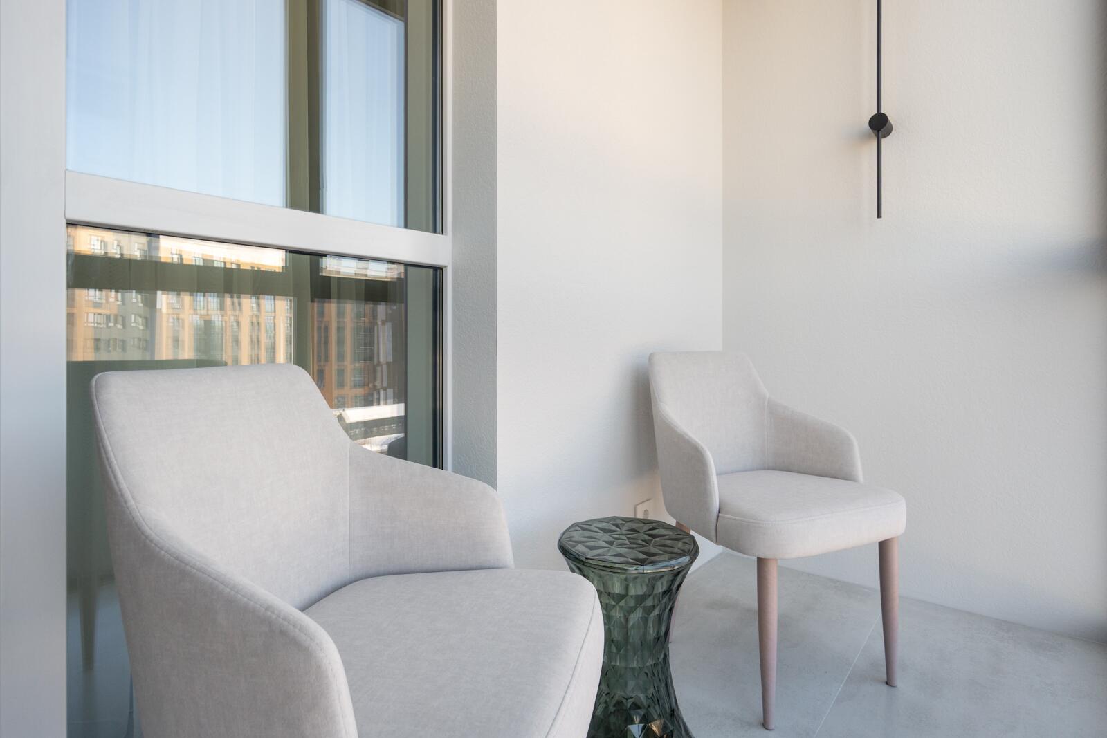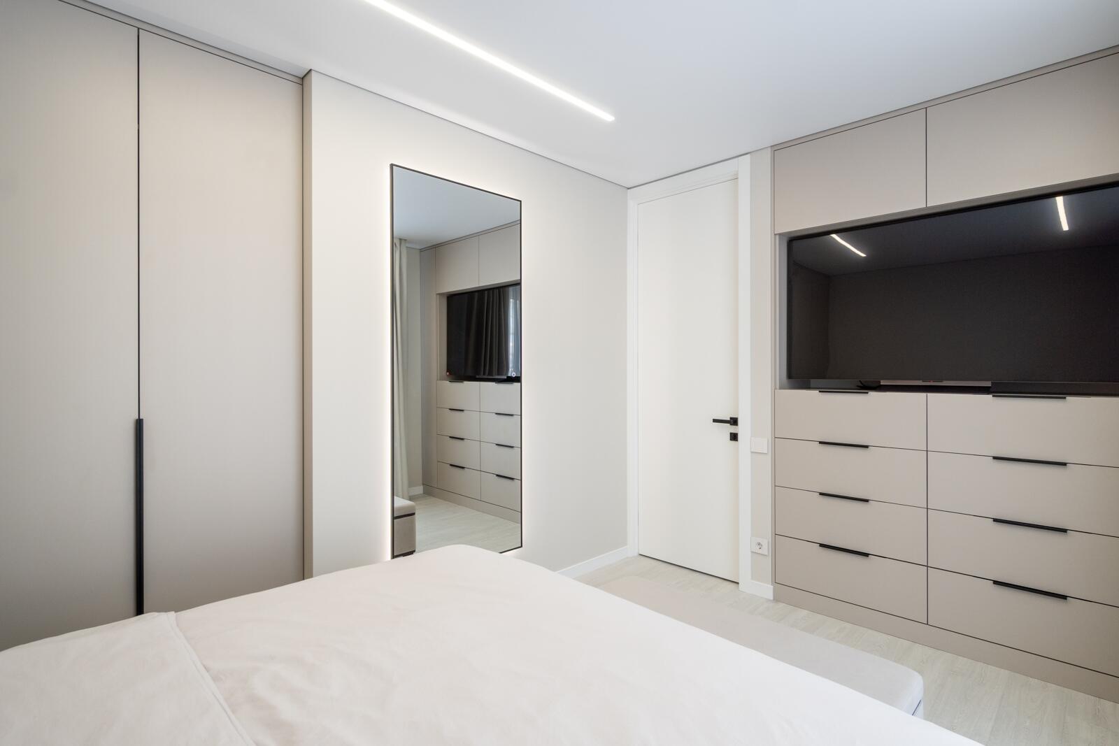 Кухня и корпусная мебель выполнены на заказ, использована фурнитура Blum и качественные фасады. Установлена дорогая техника европейского производства, включая холодильник шириной 75 см и посудомоечную машину 60 см.