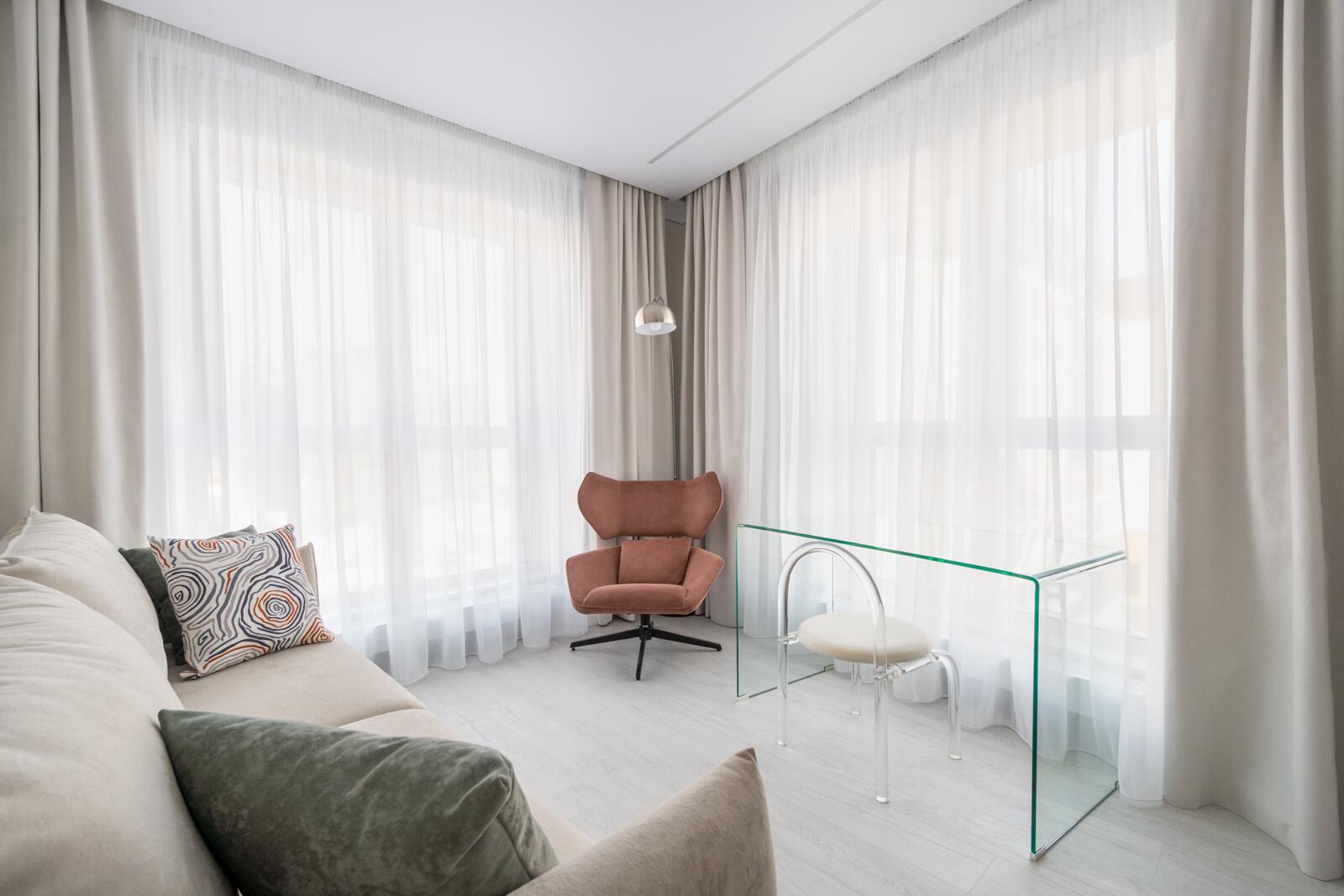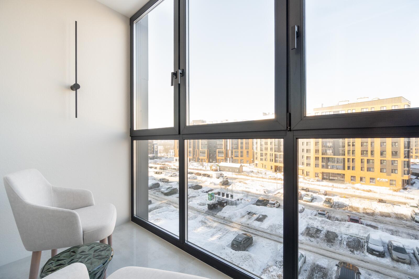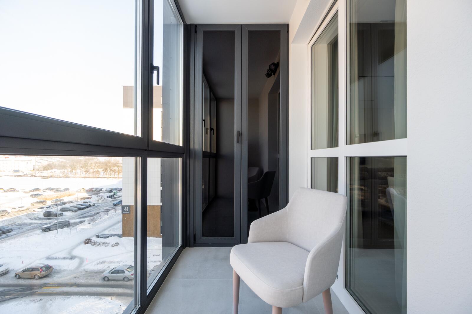 Лоджия полностью переоборудована под рабочий кабинет: заменены стеклопакеты, выполнен подогрев пола, выведены розетки и освещение — полноценное рабочее пространство без компромиссов.